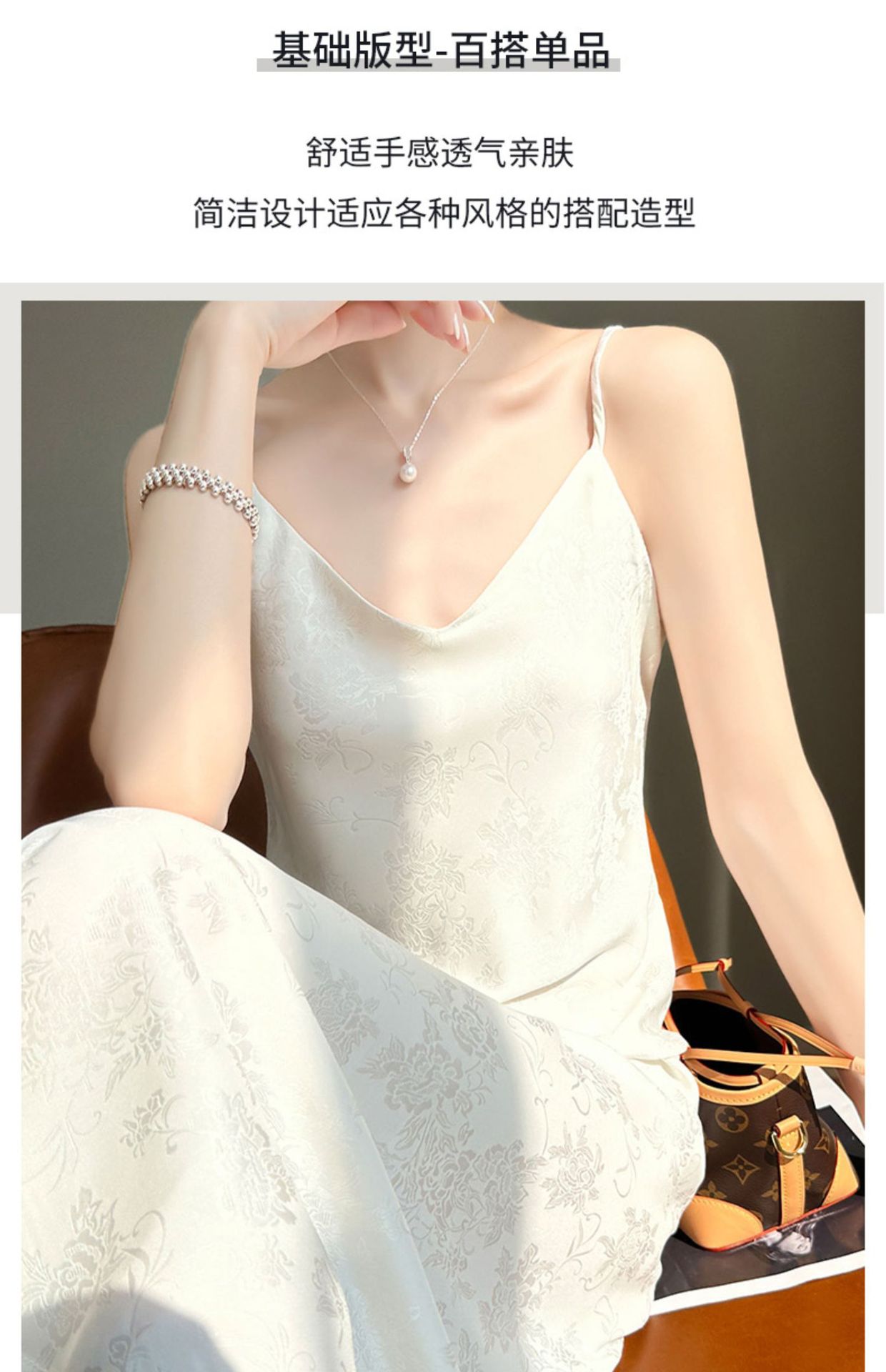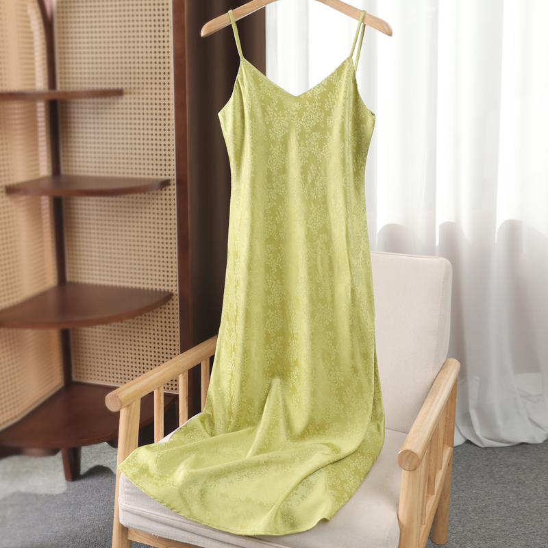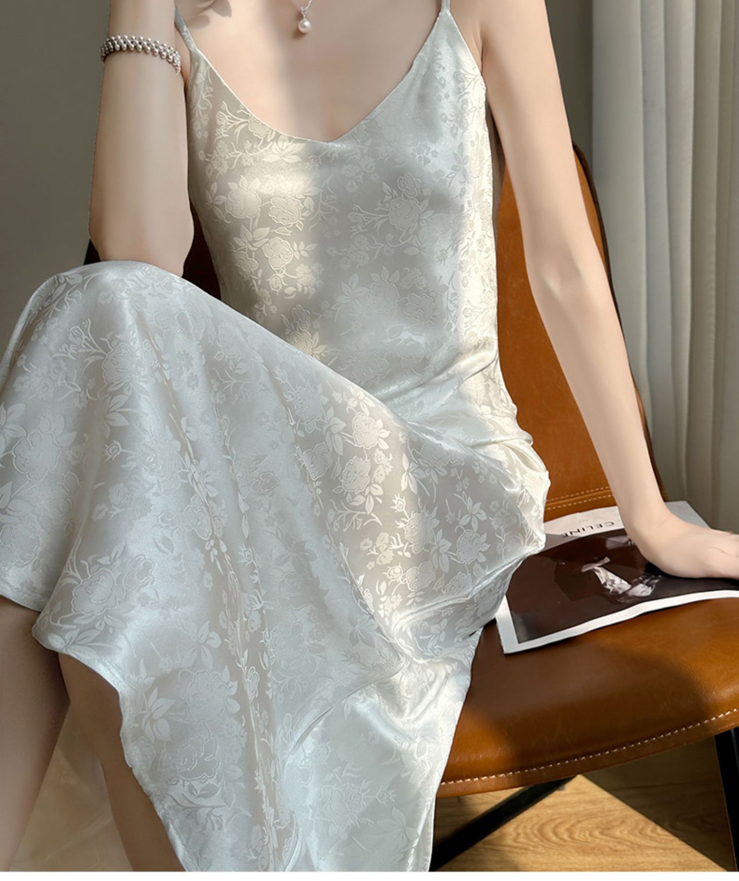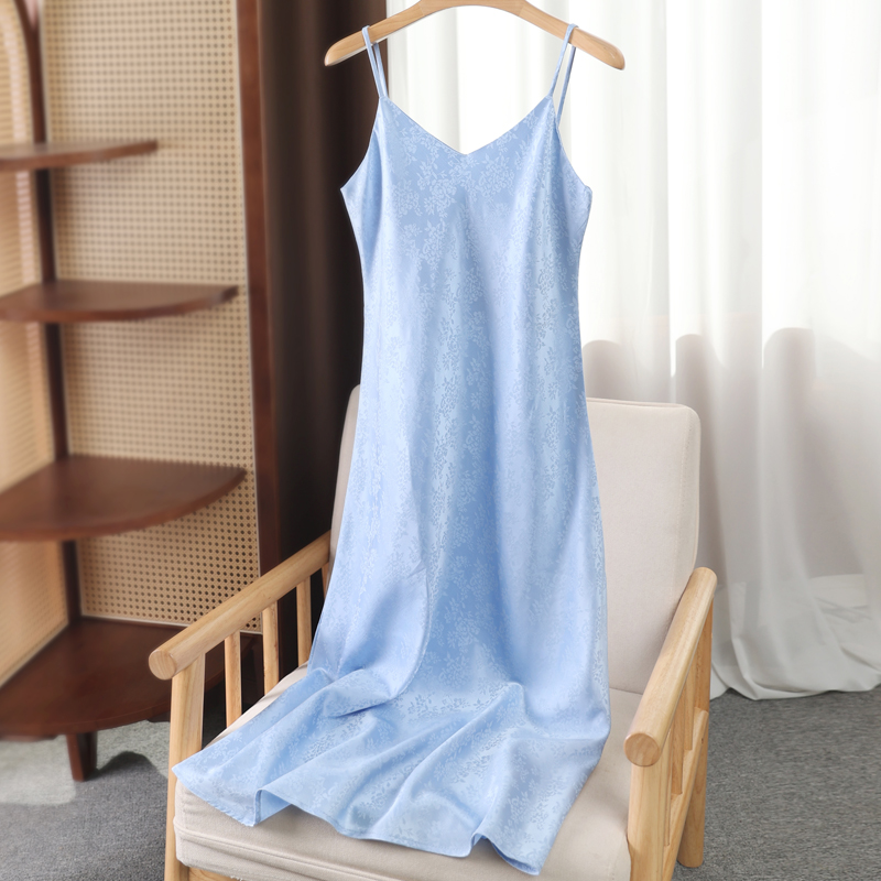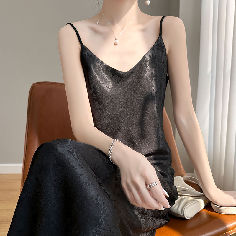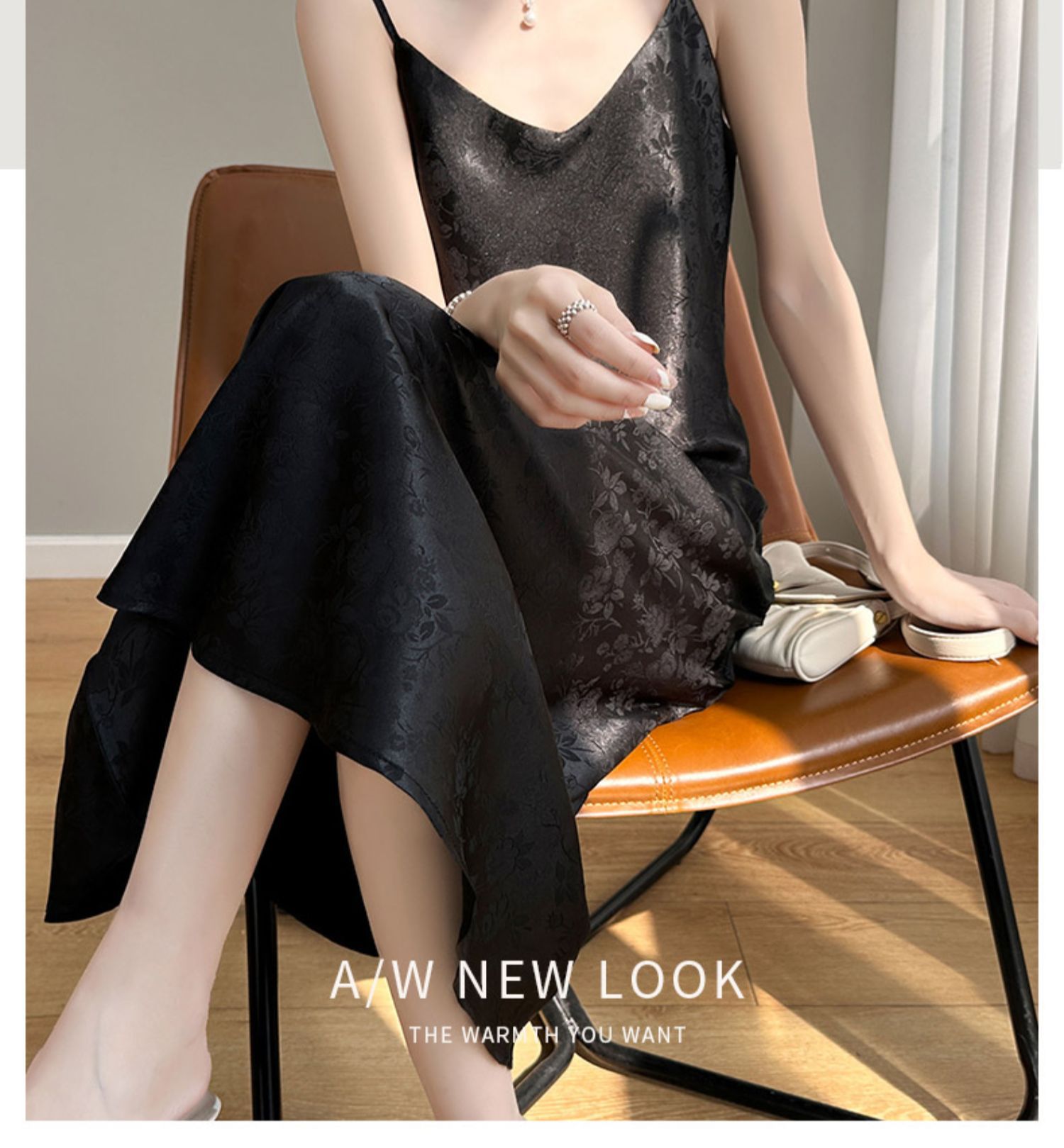 여름 자카드 V 넥 슬링 원피스 여성용 아세트산 새틴 오버 더 무릎 A 라인 롱 원피스 슬리밍 내셔널 스타일베이스 원피스스토어 가기
