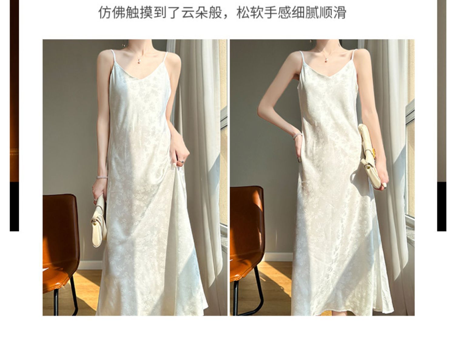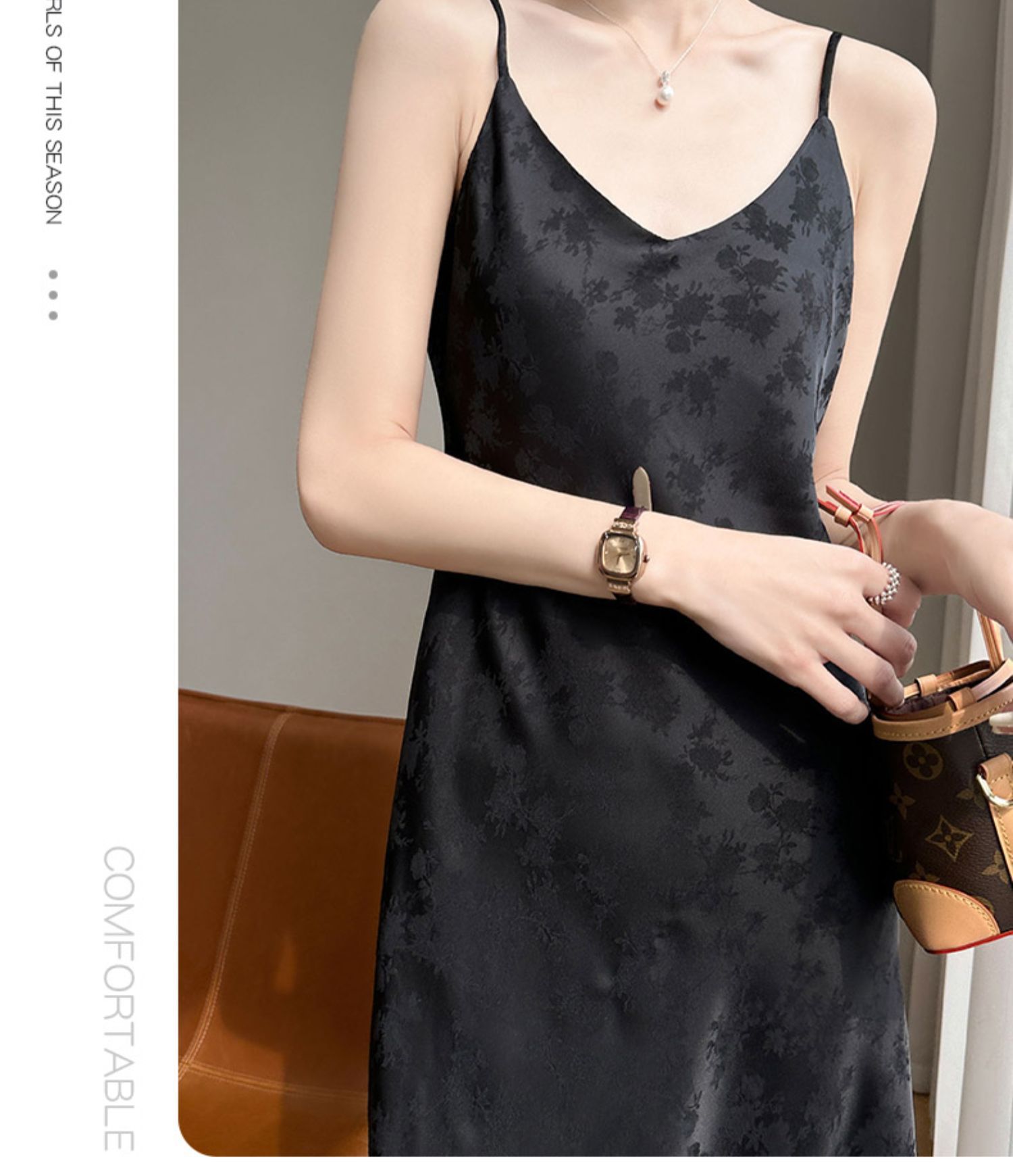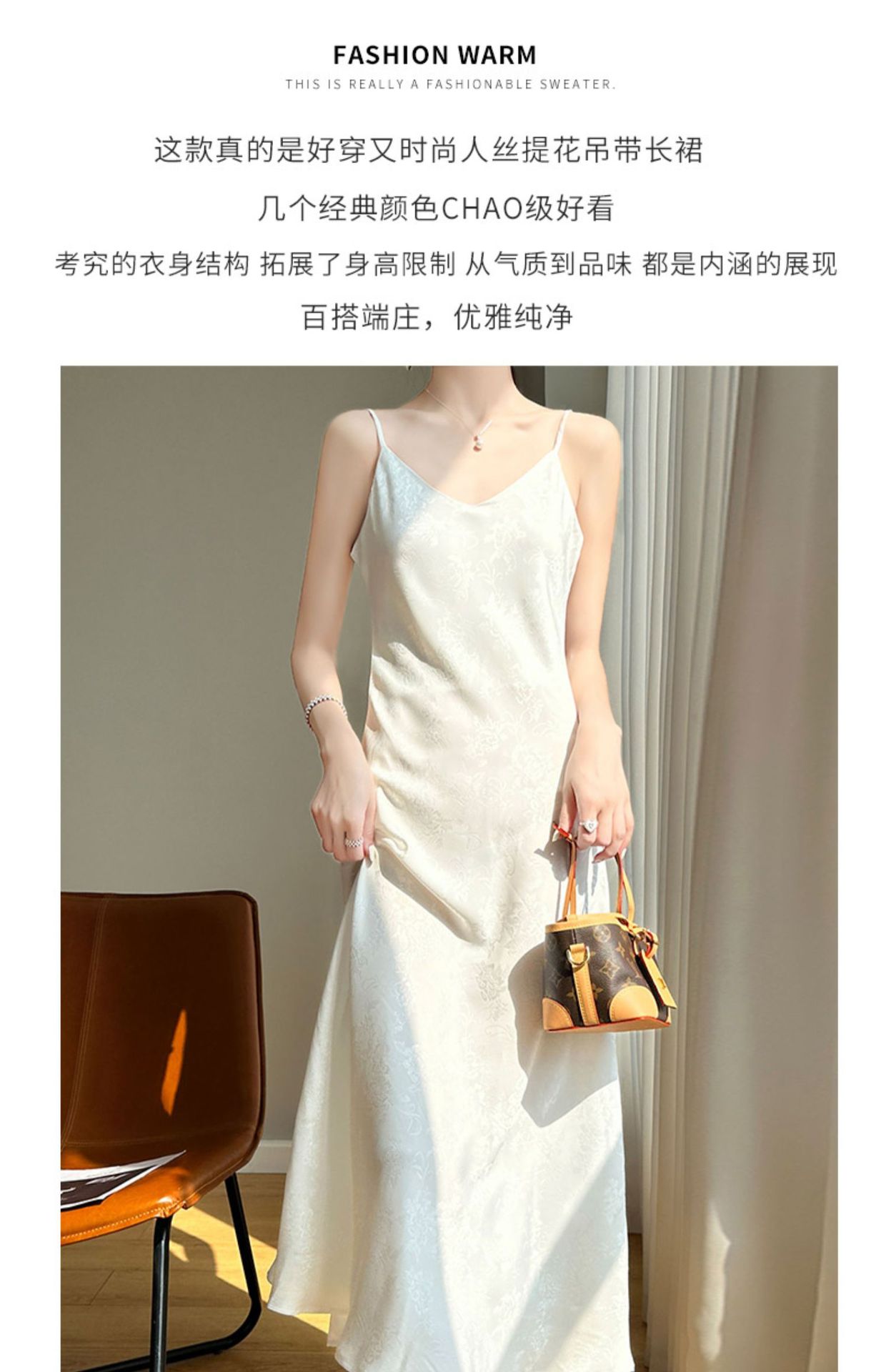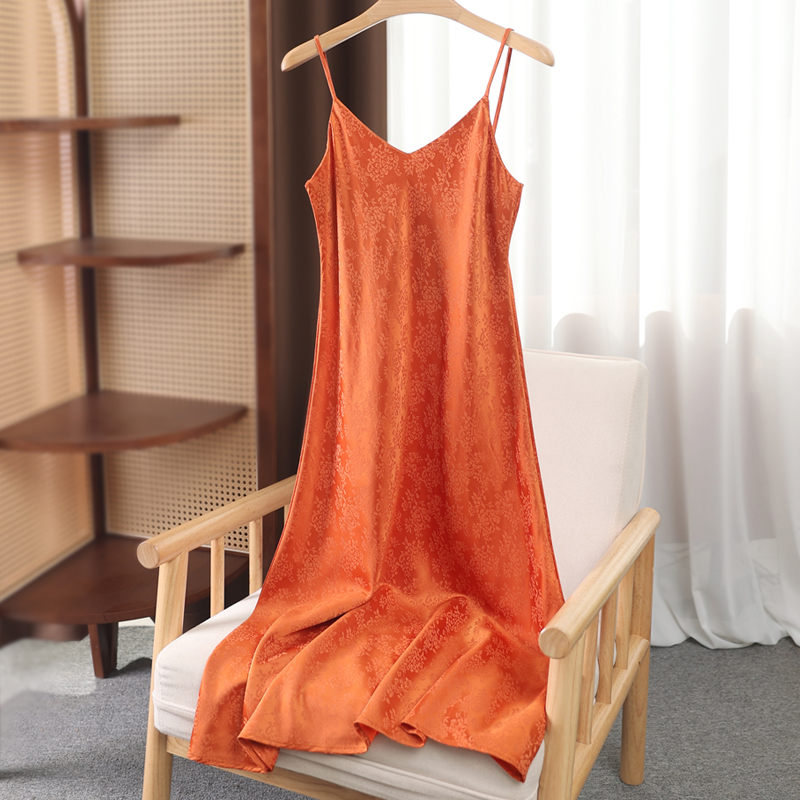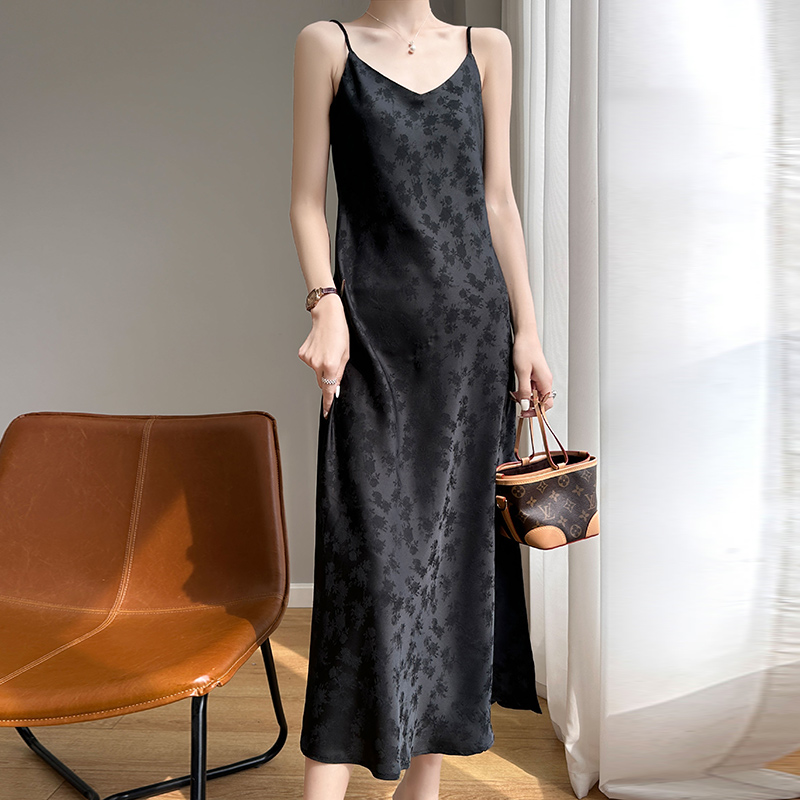 여름 자카드 V 넥 슬링 원피스 여성용 아세트산 새틴 오버 더 무릎 A 라인 롱 원피스 슬리밍 내셔널 스타일베이스 원피스스토어 가기