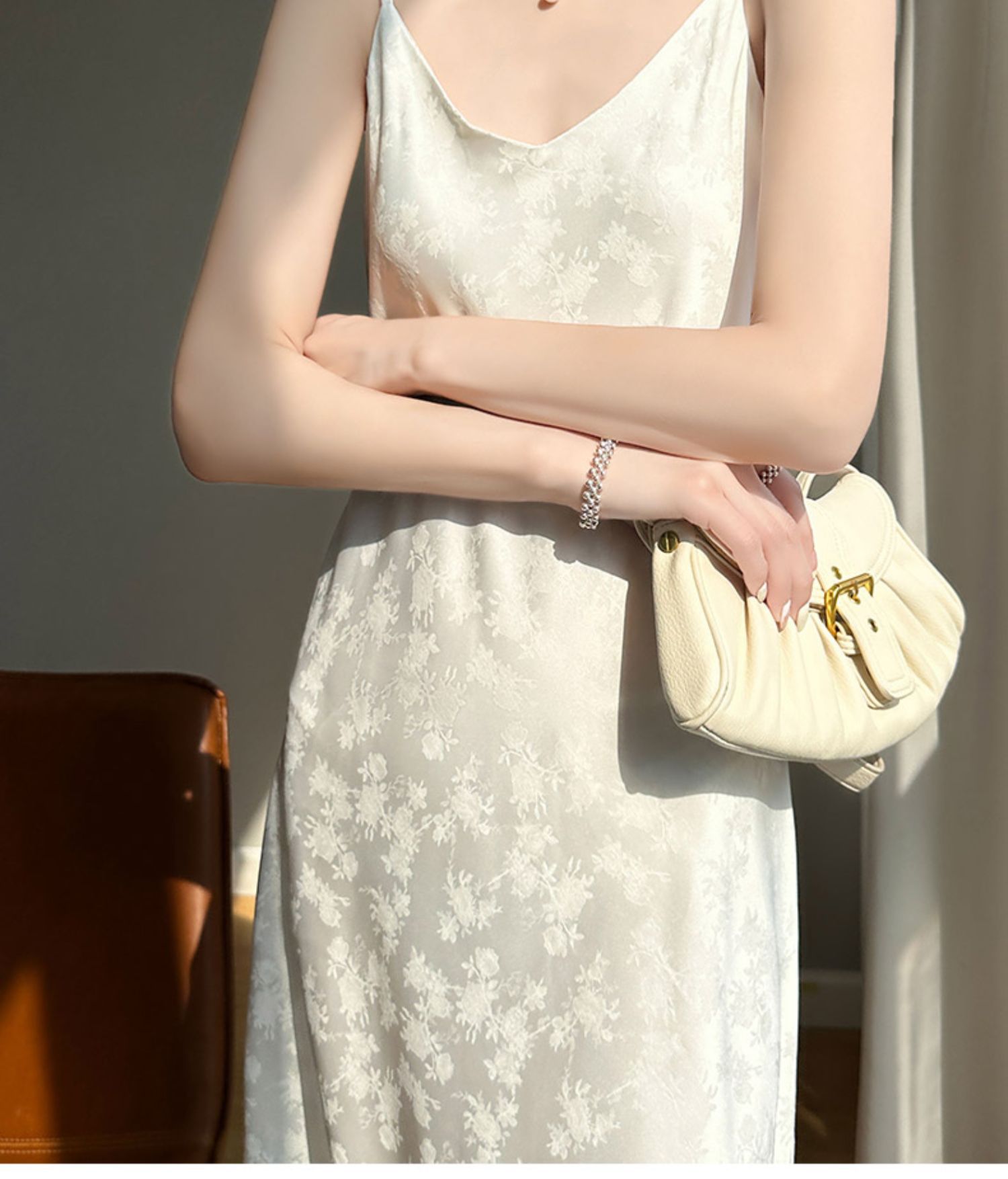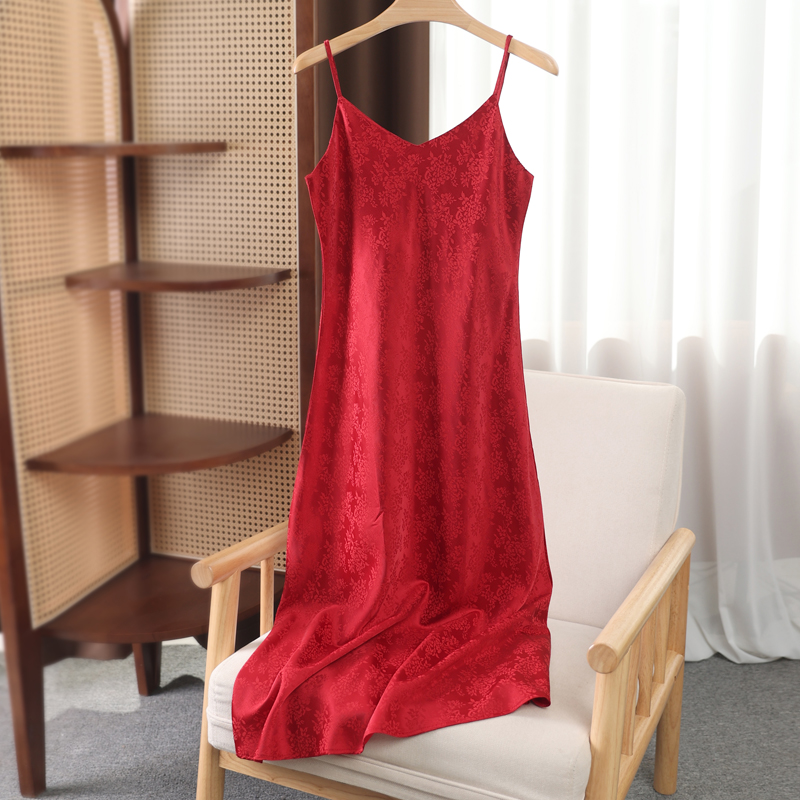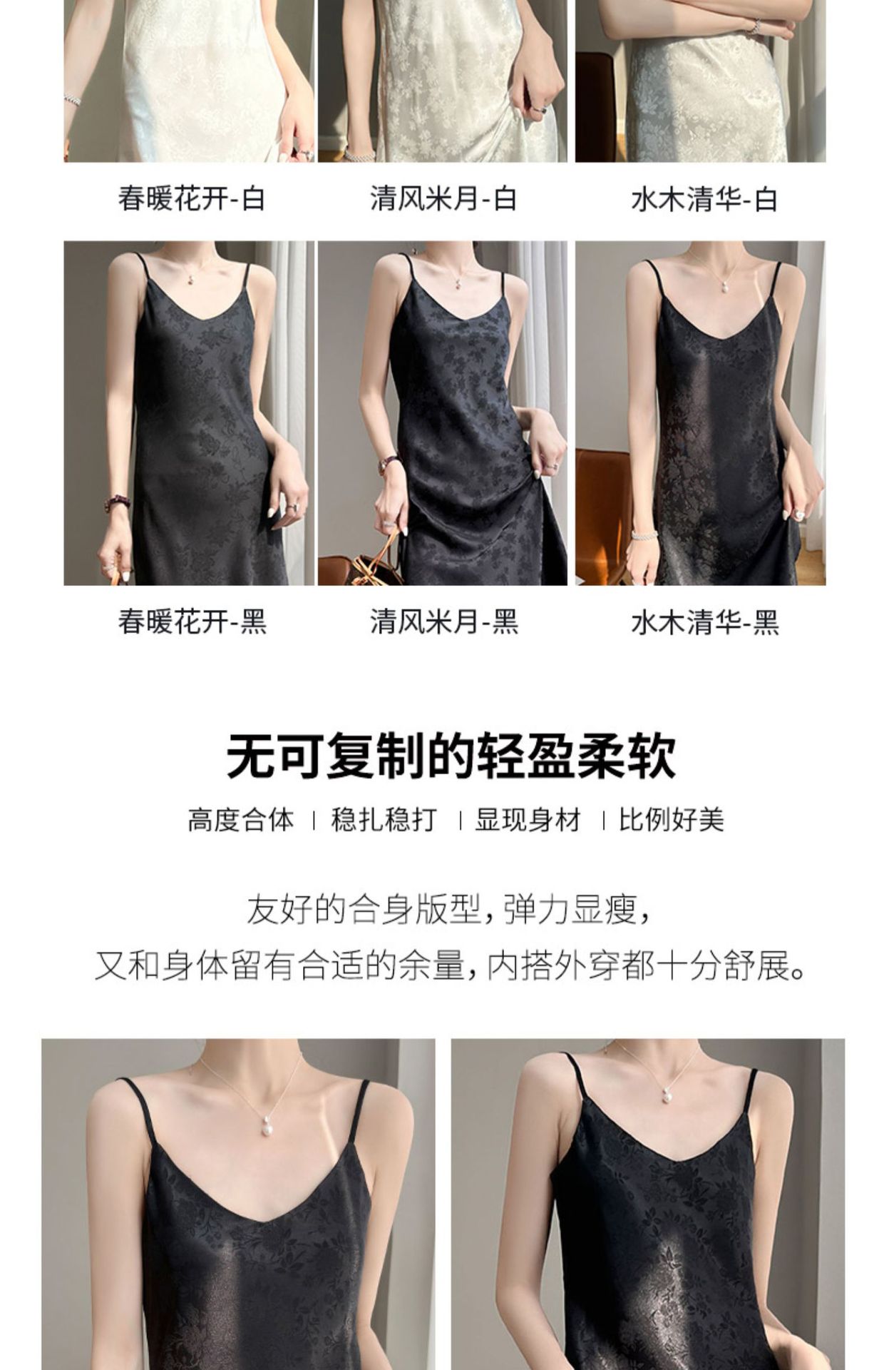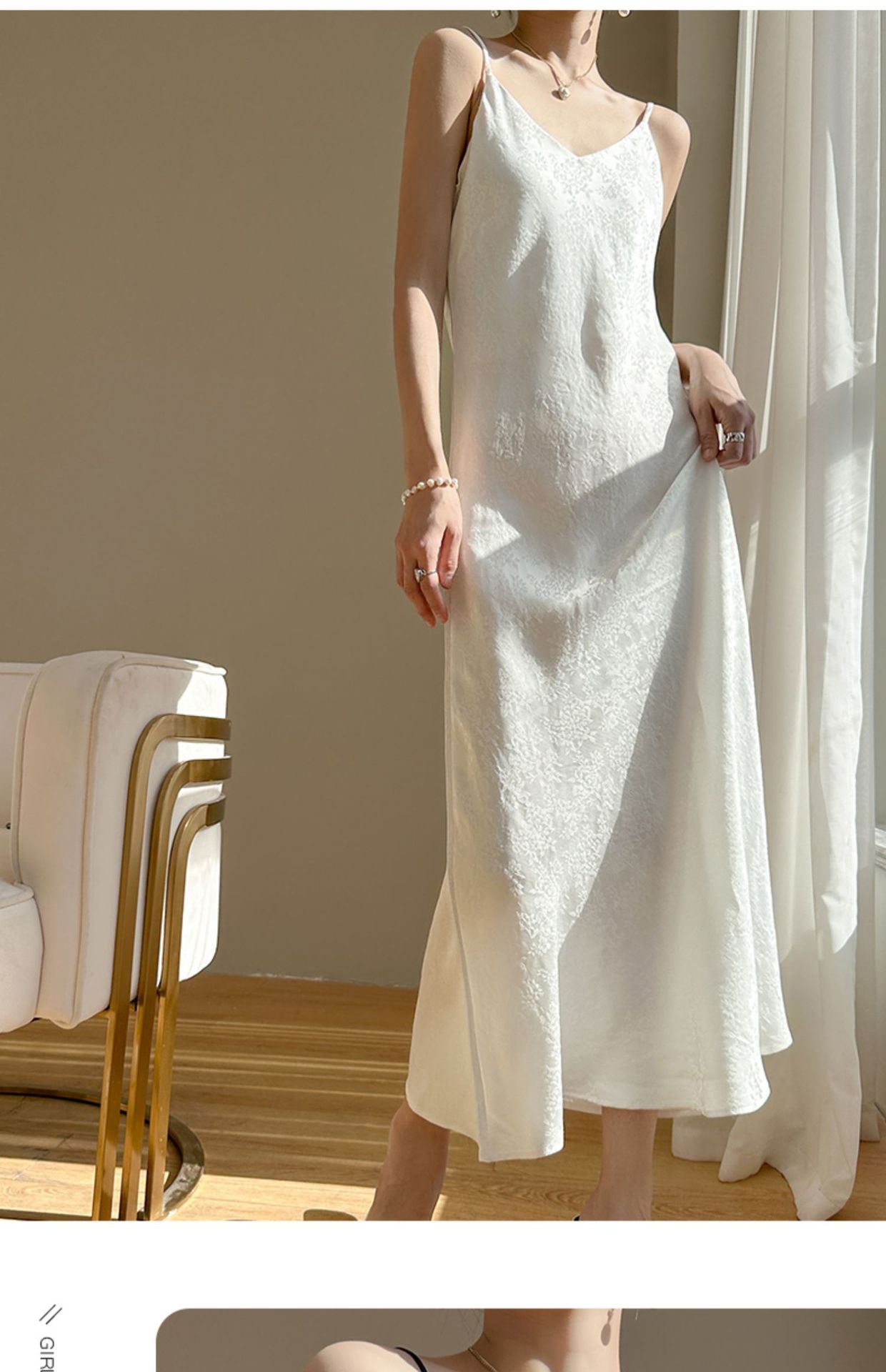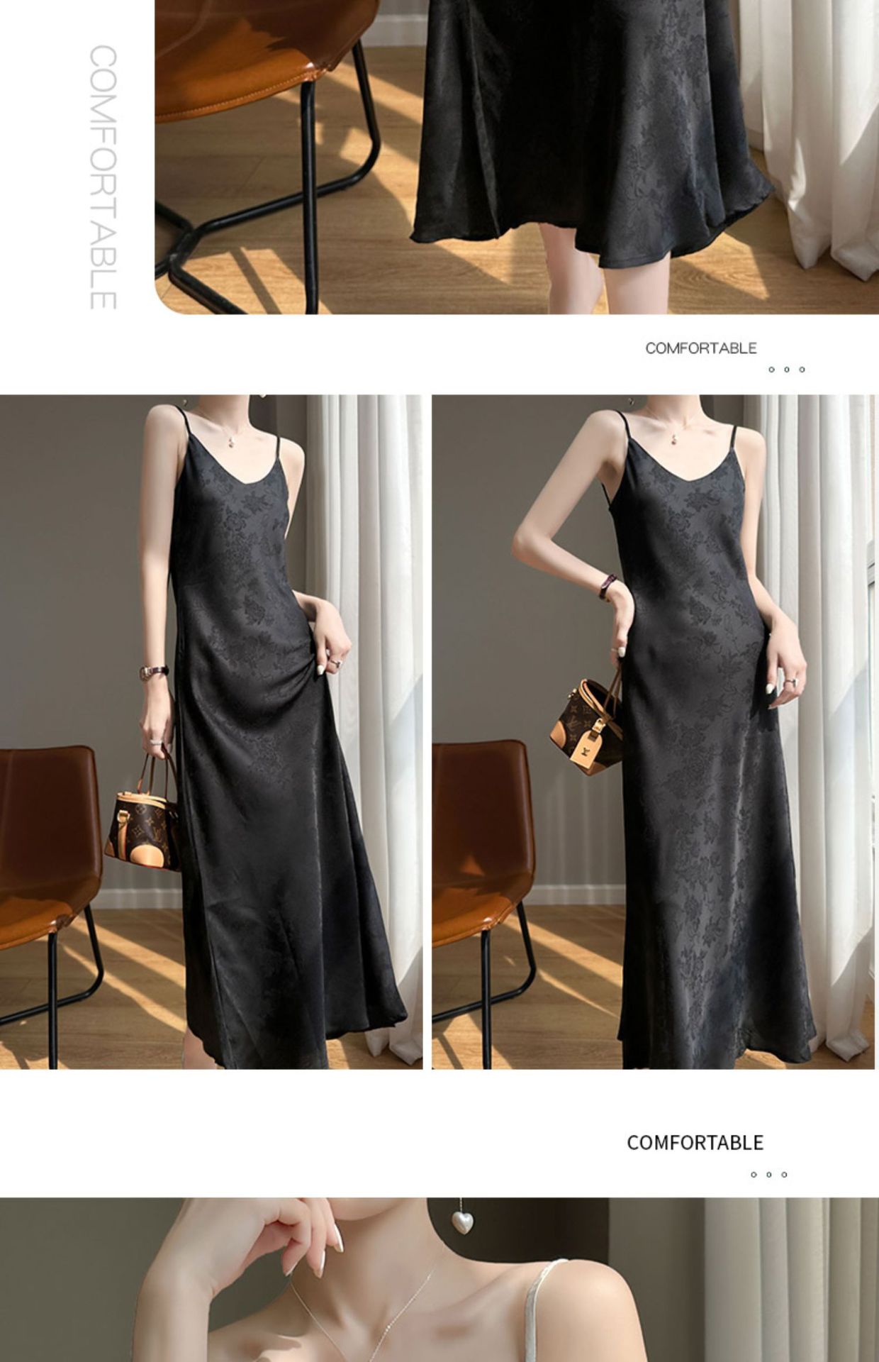 여름 자카드 V 넥 슬링 원피스 여성용 아세트산 새틴 오버 더 무릎 A 라인 롱 원피스 슬리밍 내셔널 스타일베이스 원피스스토어 가기