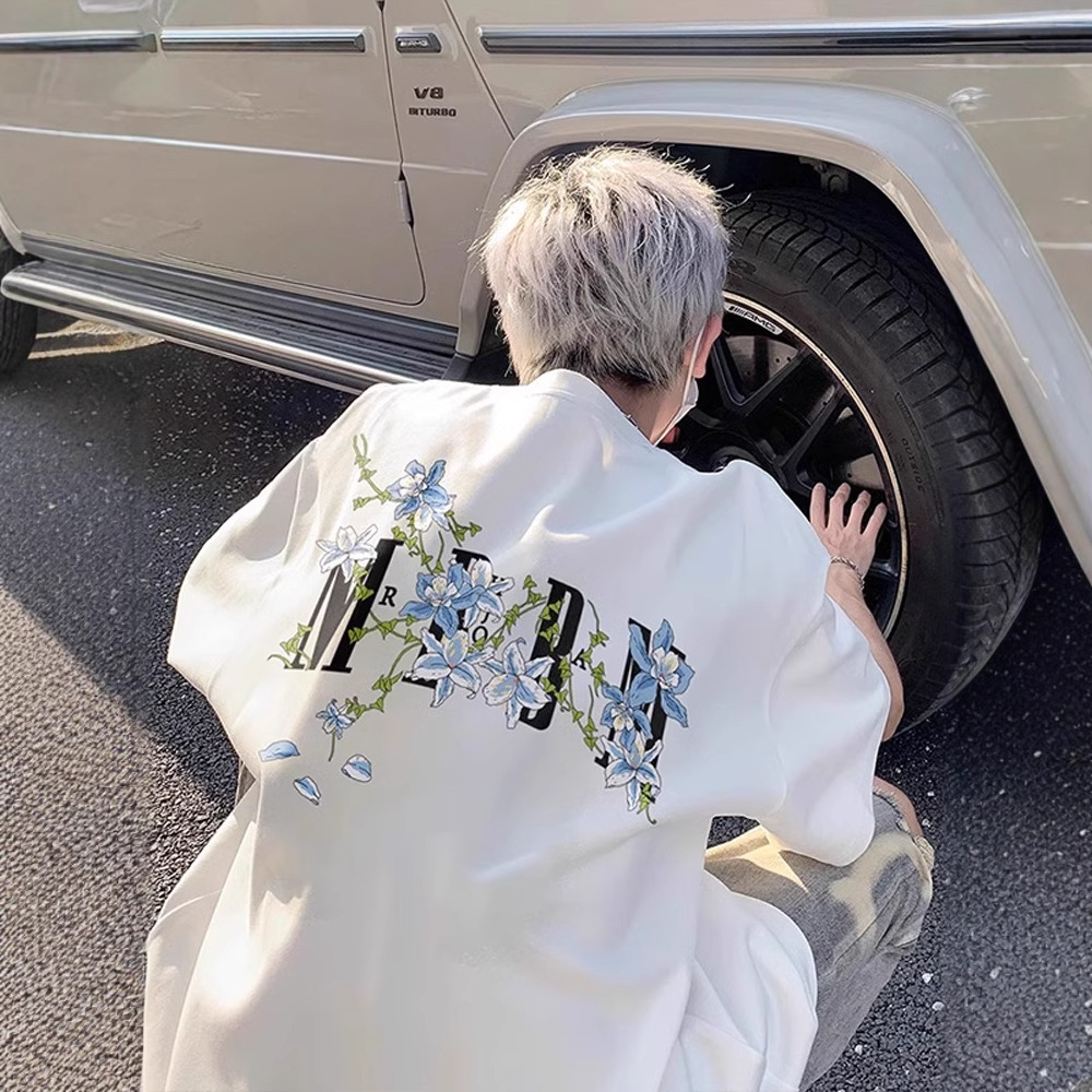 아메리칸 스타일 디자인 센스 바인 플로랄 프린트 티셔츠 남성용 여름 클렌핏 헤비 반팔 하이 스트리트 커플 반소매 티셔츠