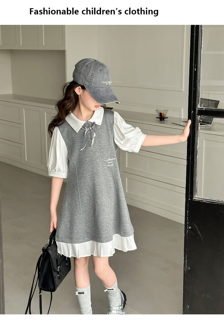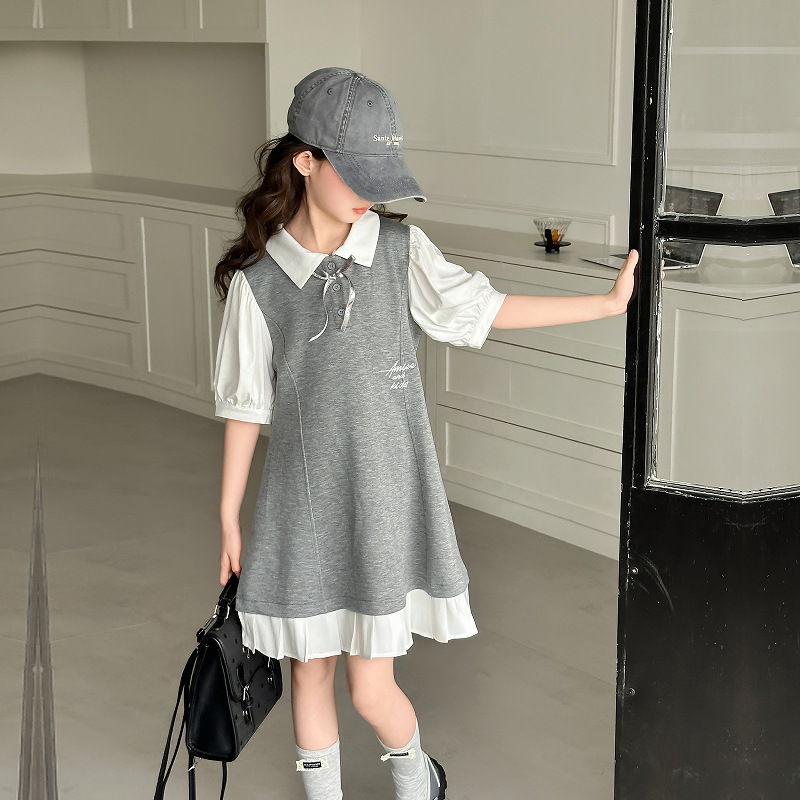 소녀 여름 얇은 원피스 2025 새로운 대학 스타일 가짜 투피스 폴로 칼라 유행 외국 스타일 큰 어린이 여름 원피스