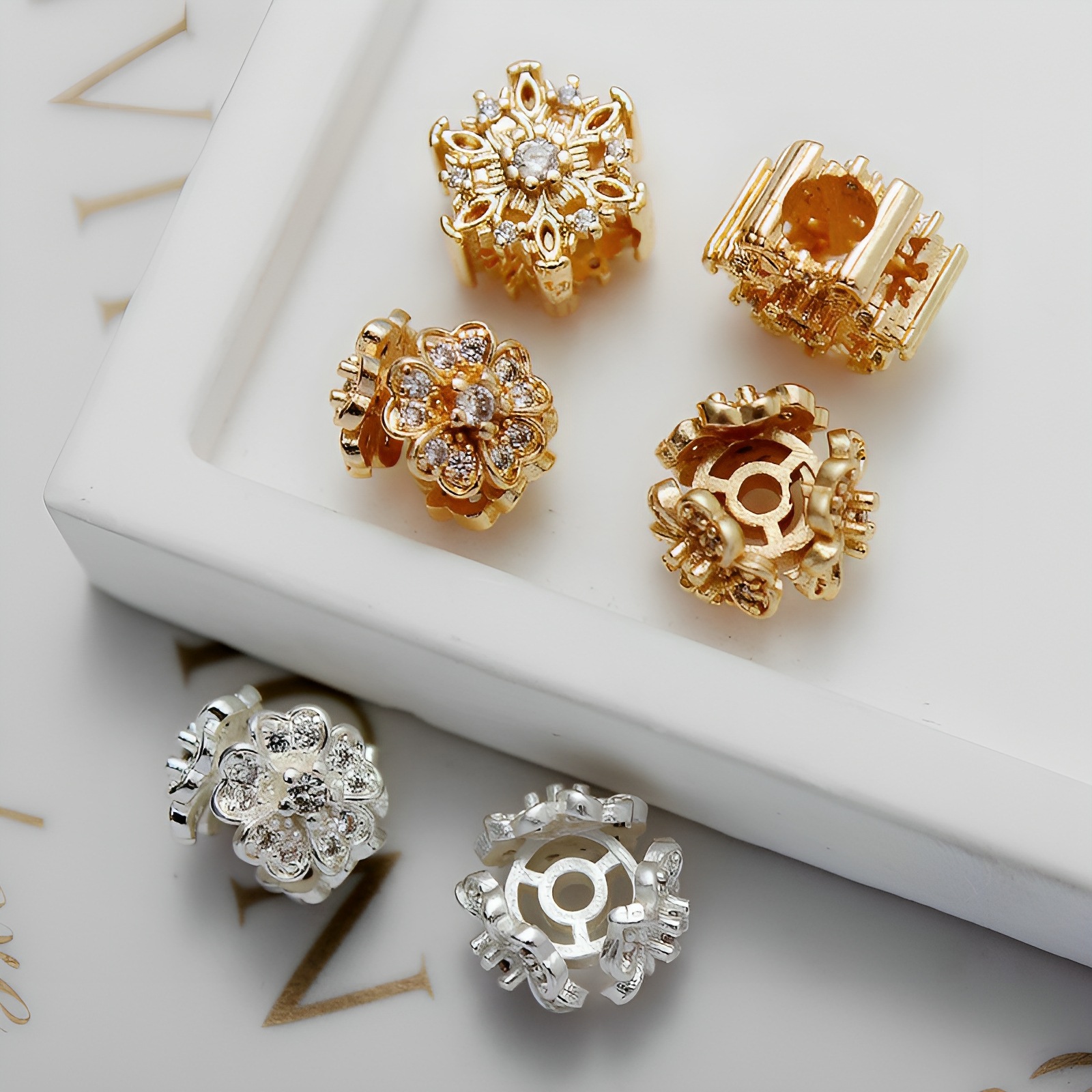 14K 금으로 채워진 색상 보존 지르콘 3-in-1 5잎 눈송이 버킷 비즈 스루홀 스페이서 비즈 DIY 팔찌 목걸이 쥬얼리 액세서리스토어 가기
