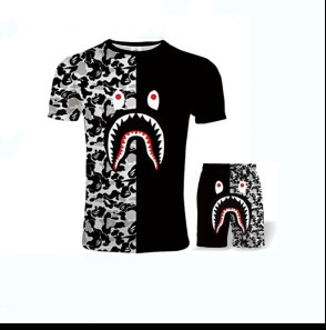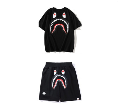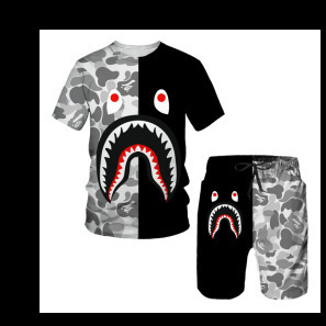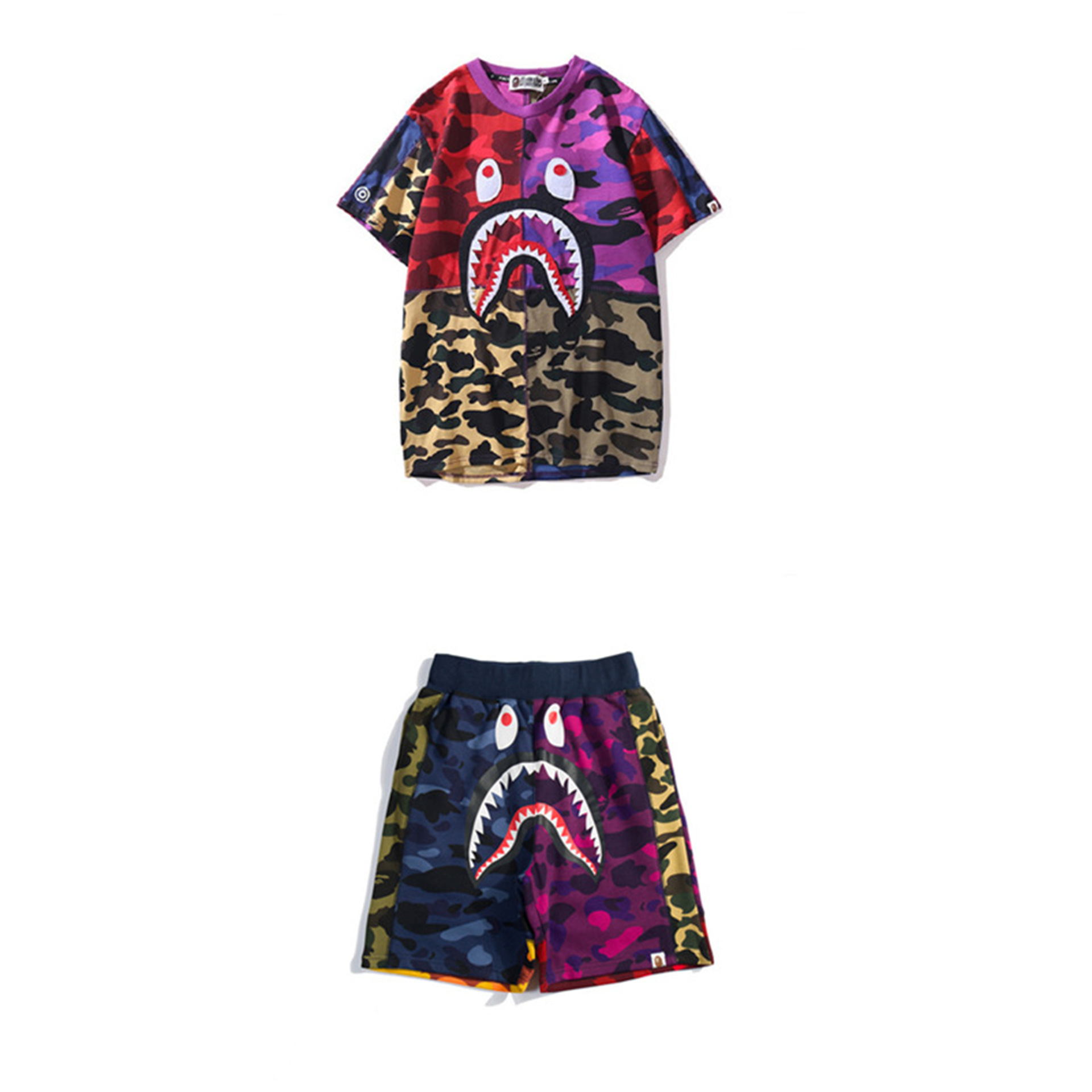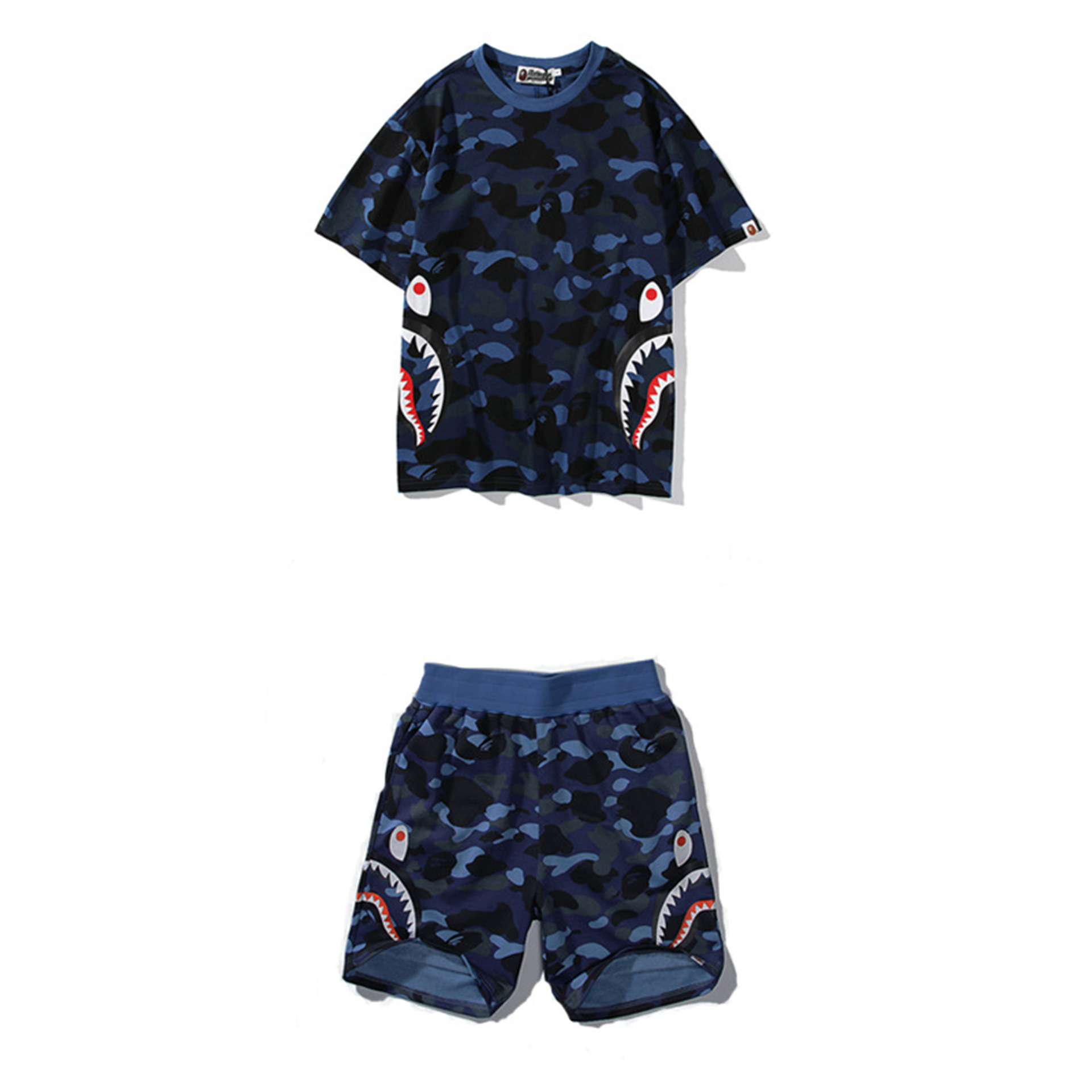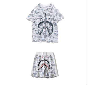 상어 머리 프린트 세트 청소년 티셔츠 스포츠 상어 베이프 일본 패션 반팔 온웨어 카모플라주
