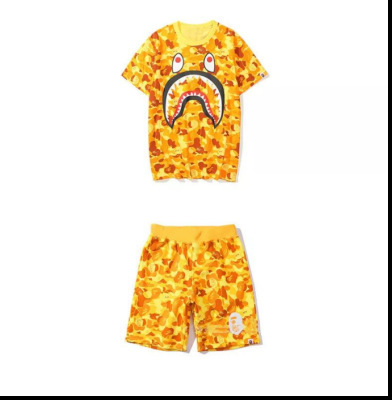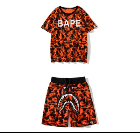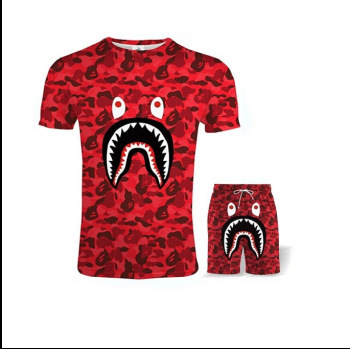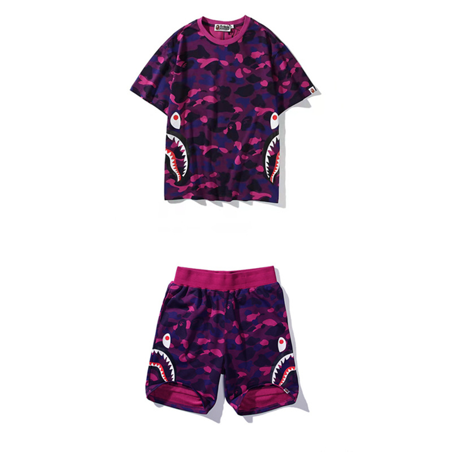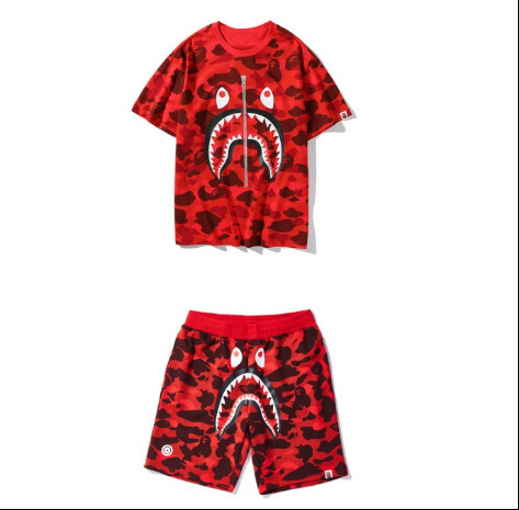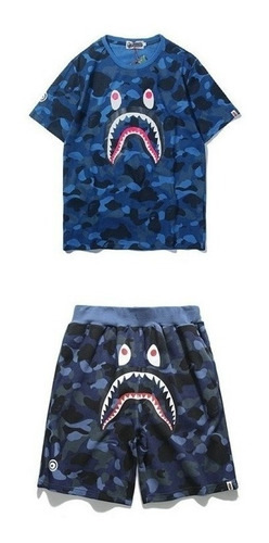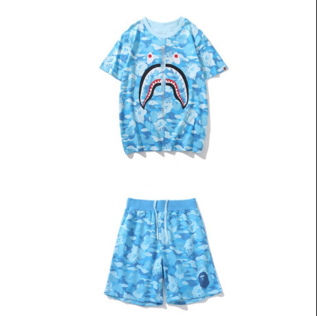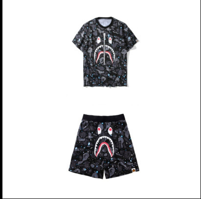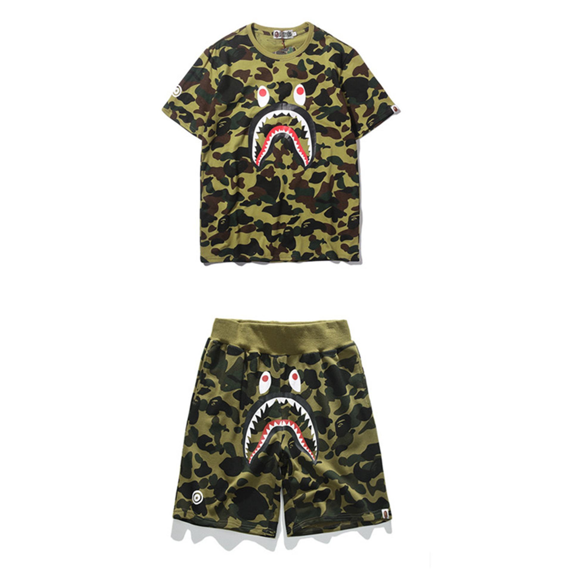 상어 머리 프린트 세트 청소년 티셔츠 스포츠 상어 베이프 일본 패션 반팔 온웨어 카모플라주