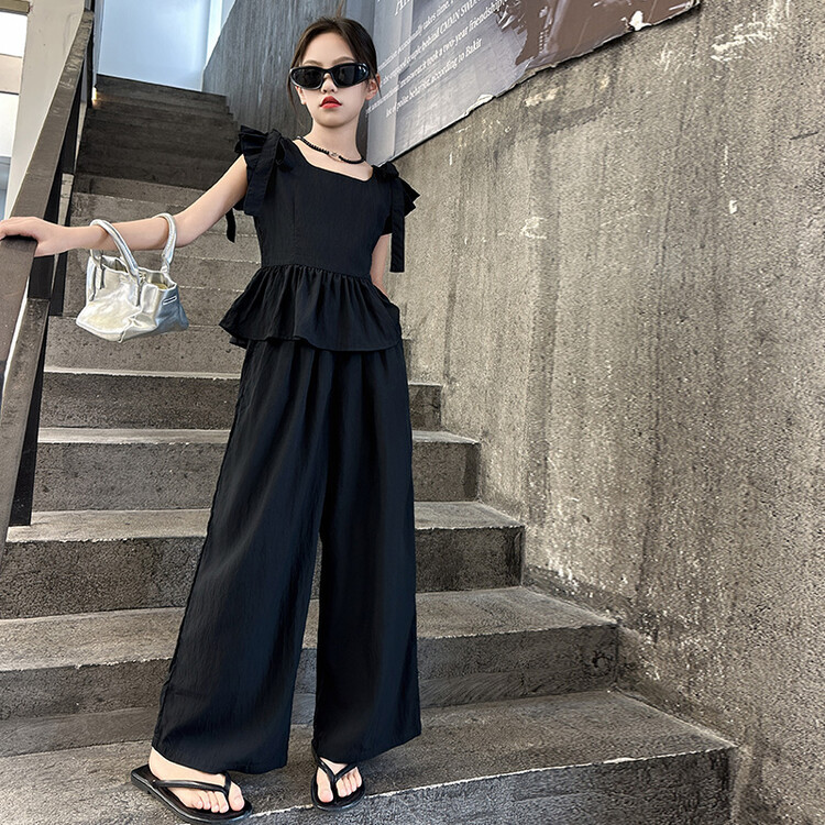 소녀 여름 세트 205 새 소녀의 작은 비행 소매 인형 셔츠 큰 어린이 여름 탑 넓은 다리 바지 투피스 세트스토어 가기
