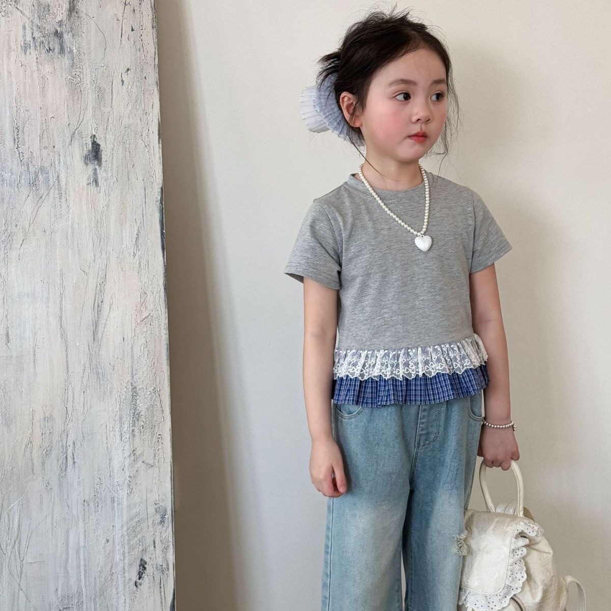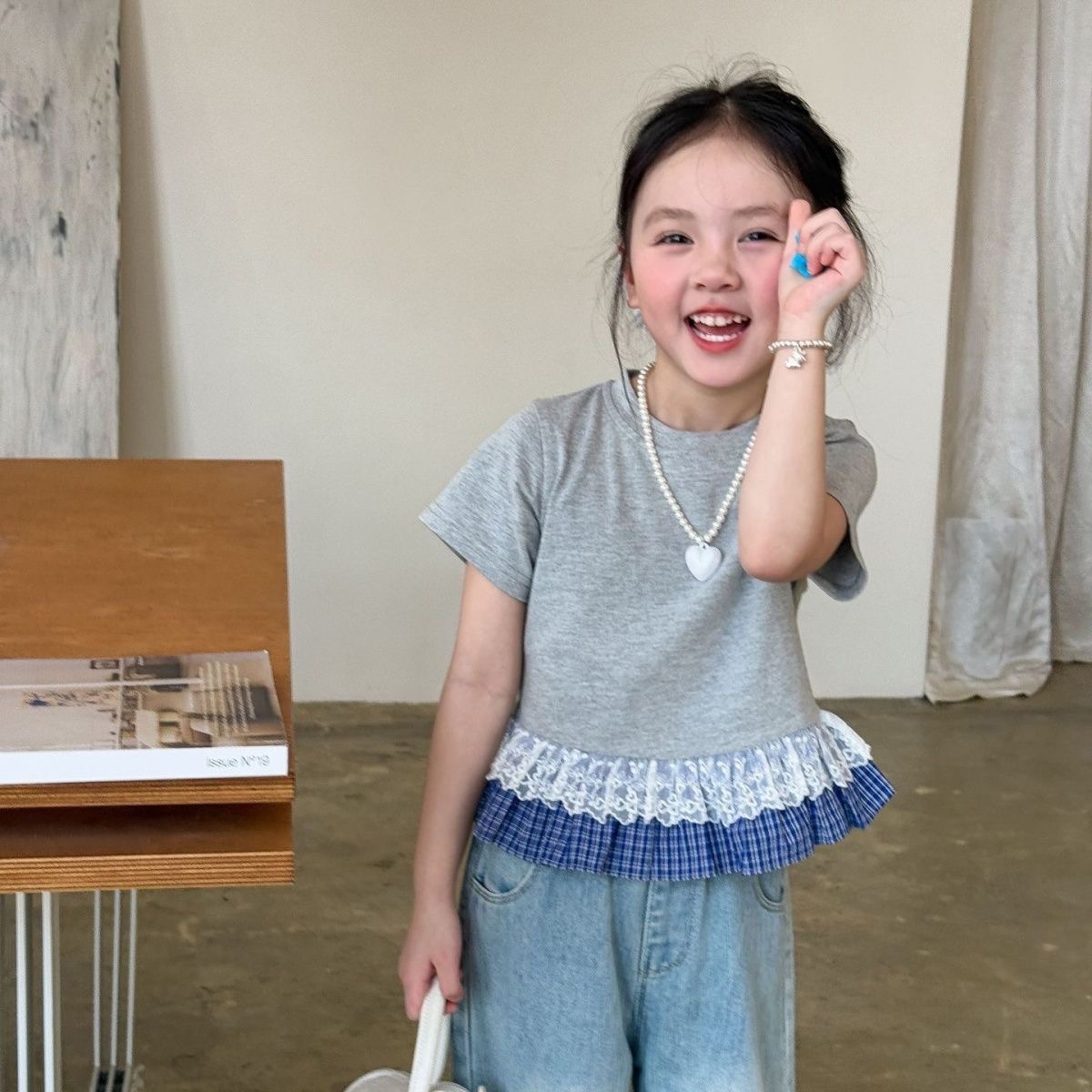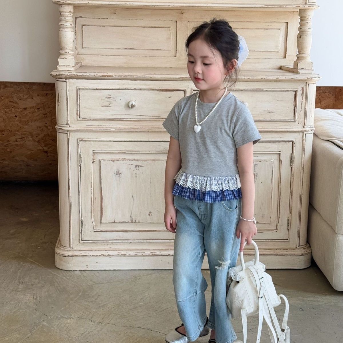 여자 여름 반팔 청바지 세트 2025 새로운 어린이 한국 스타일 바느질 레이스 티셔츠 패션 청바지스토어 가기