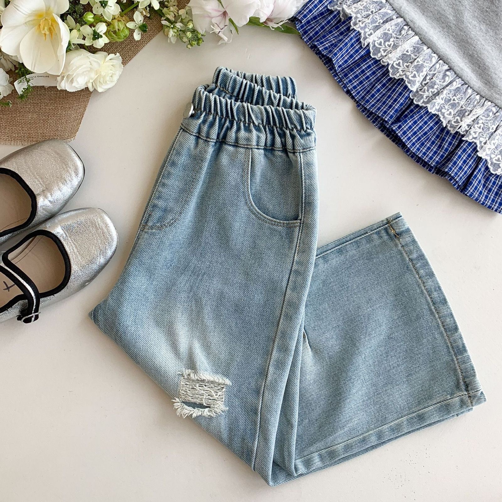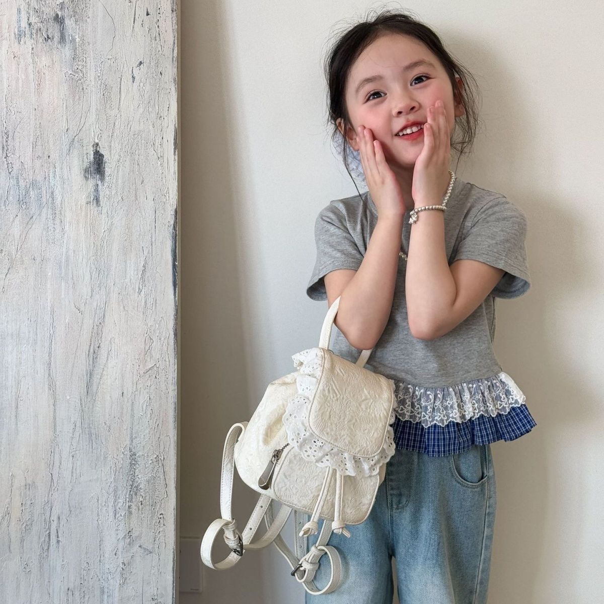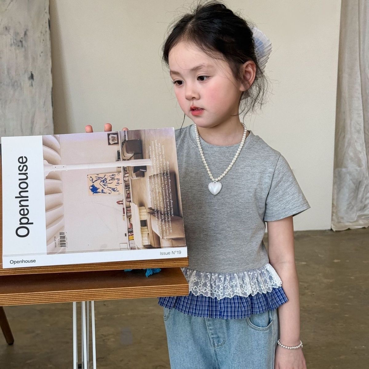 여자 여름 반팔 청바지 세트 2025 새로운 어린이 한국 스타일 바느질 레이스 티셔츠 패션 청바지스토어 가기