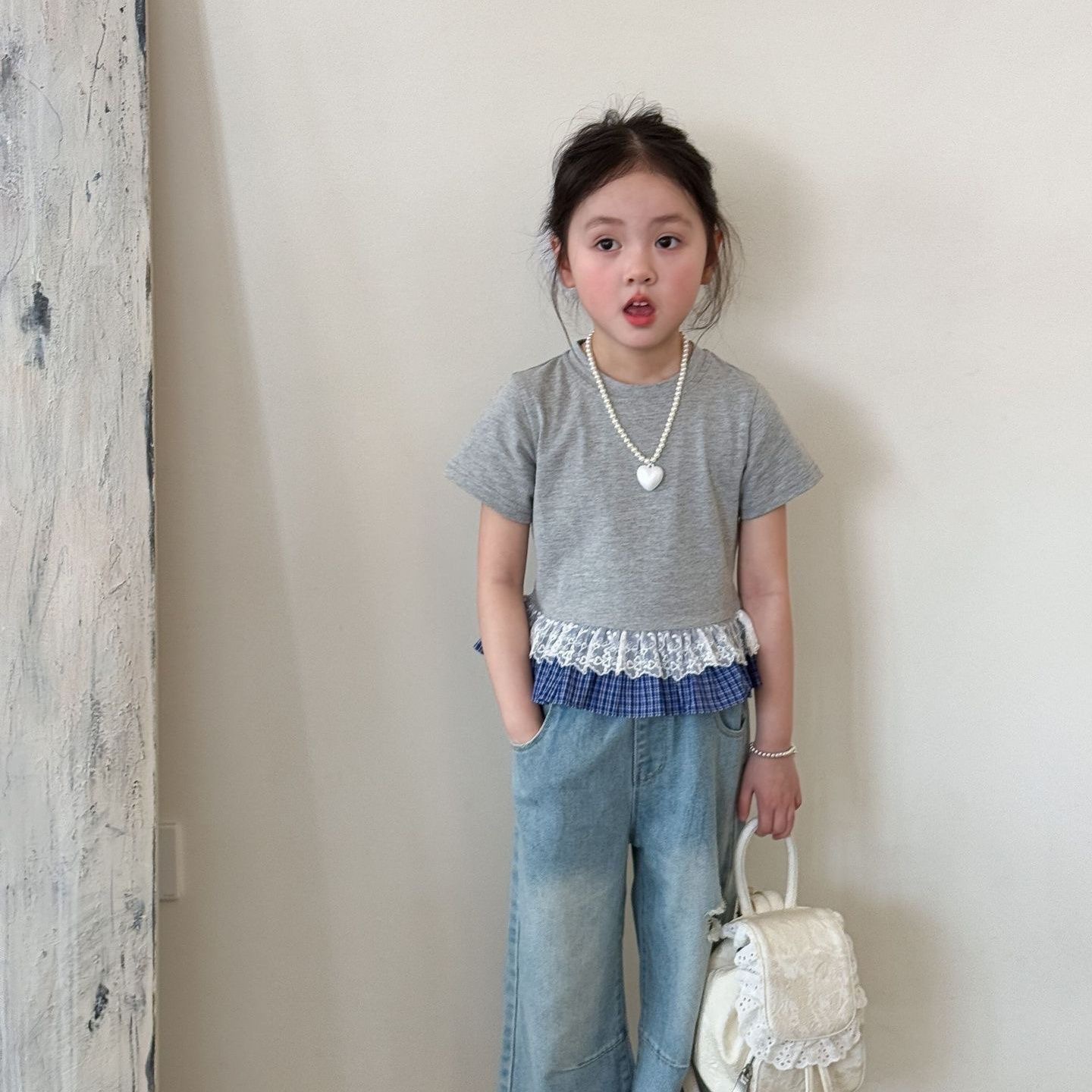여자 여름 반팔 청바지 세트 2025 새로운 어린이 한국 스타일 바느질 레이스 티셔츠 패션 청바지
