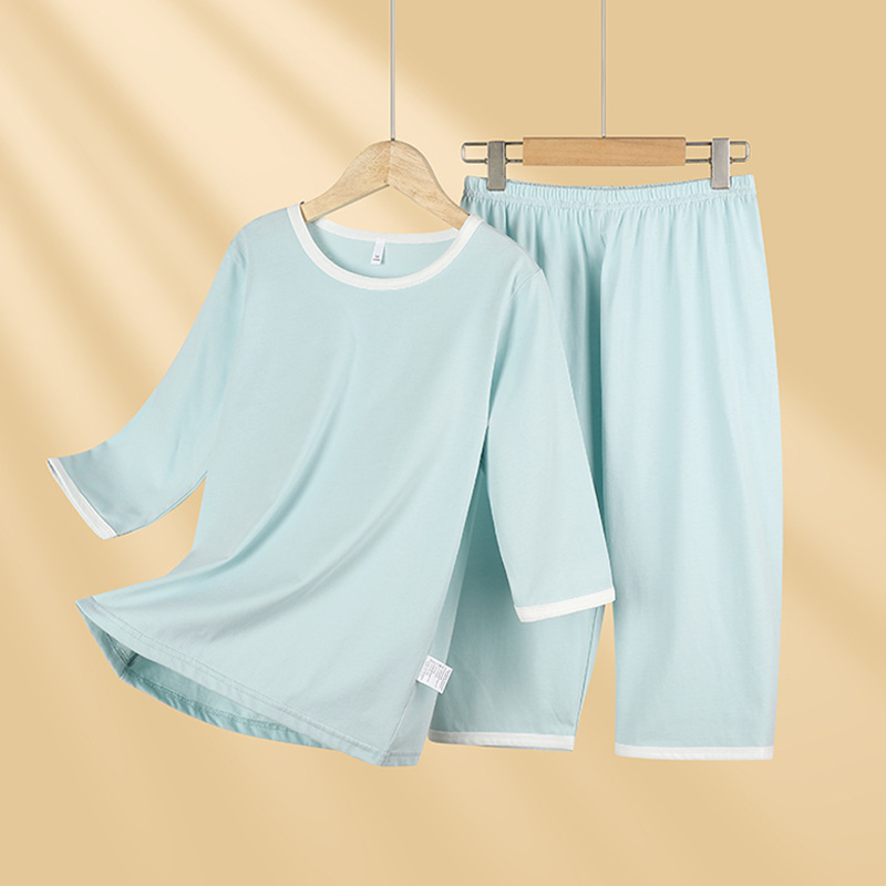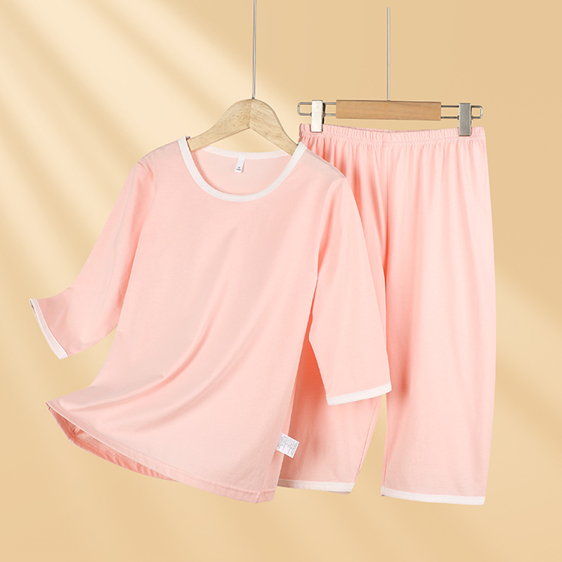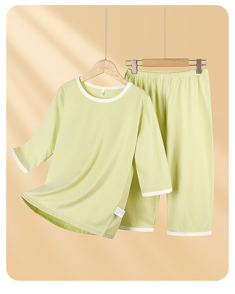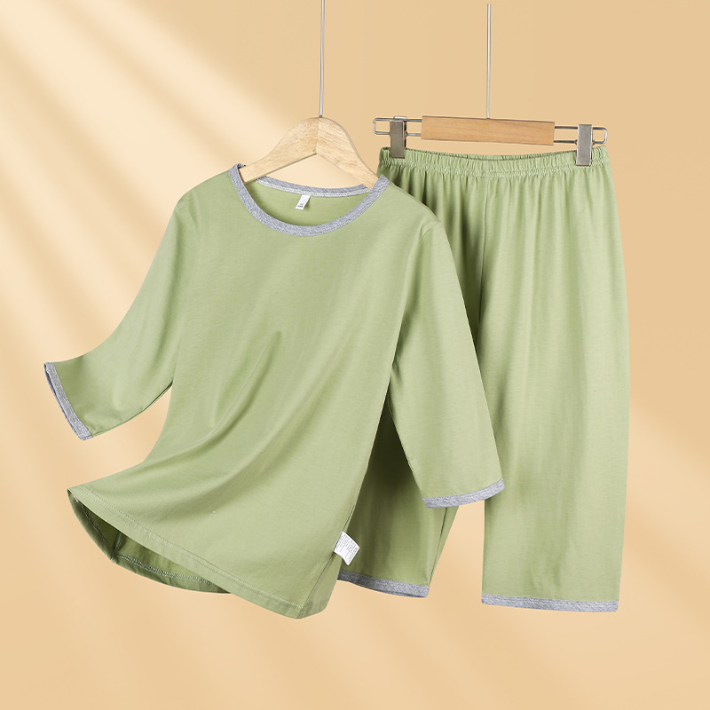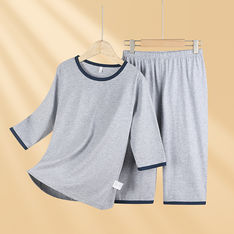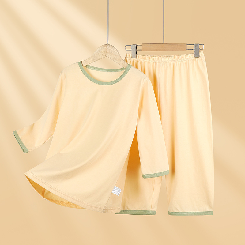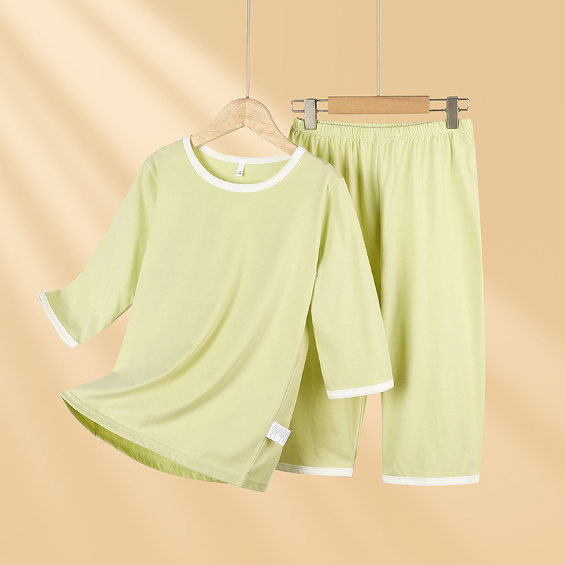 어린이 순면 파자마 여름 소년 소녀를위한 얇은 반팔 풀오버 솔리드 컬러 코튼 홈 의류 세트 외부 착용