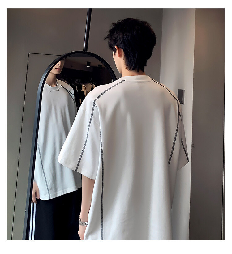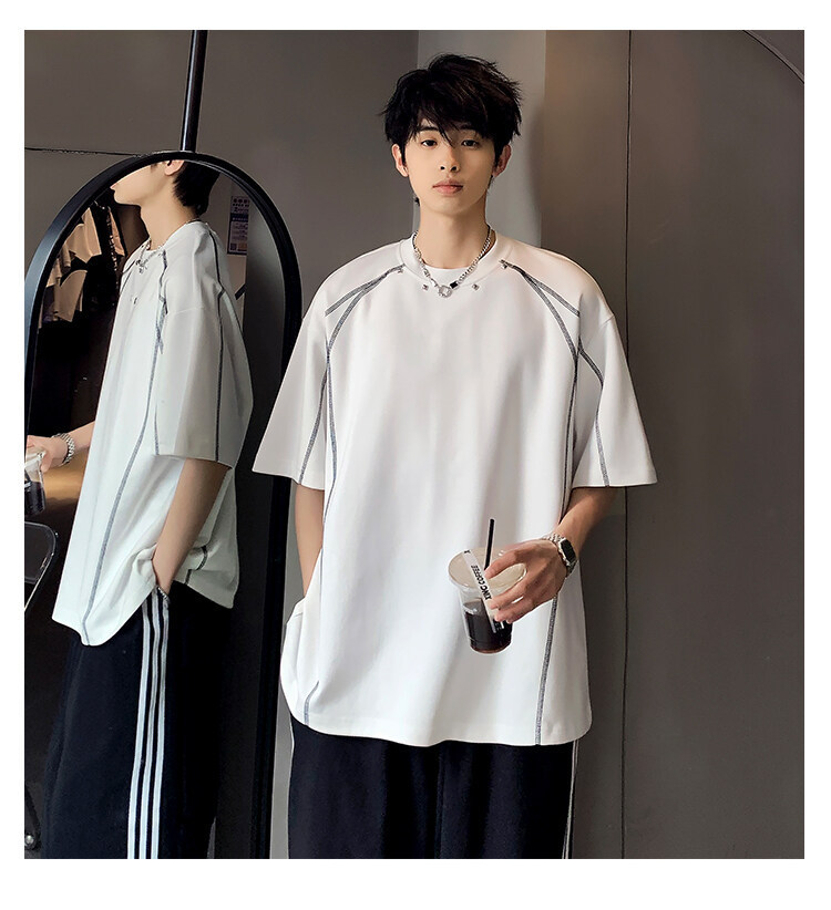 Ji Ming 라인 리벳 헤비급 반팔 티셔츠 남성 여름 미국 하이 스트리트 의류 트렌디 브랜드 루즈 라운드 넥 반팔 티셔츠