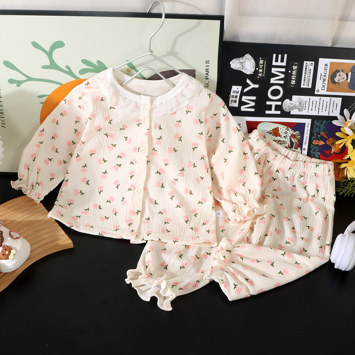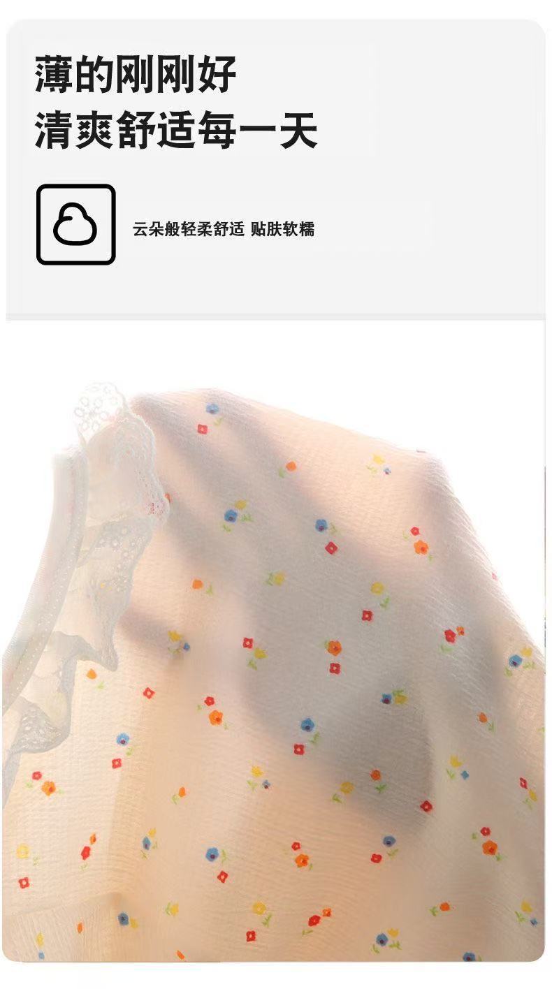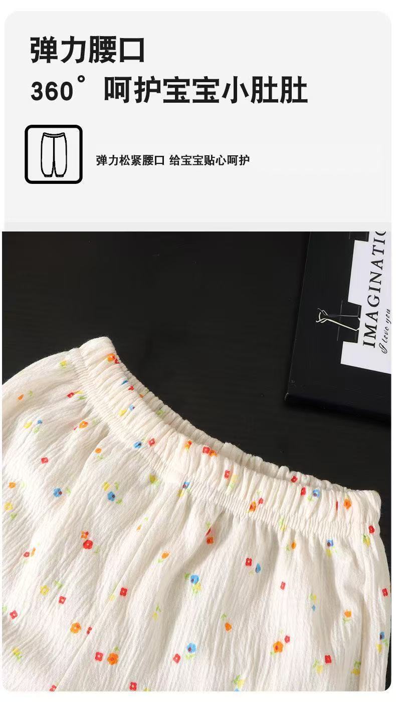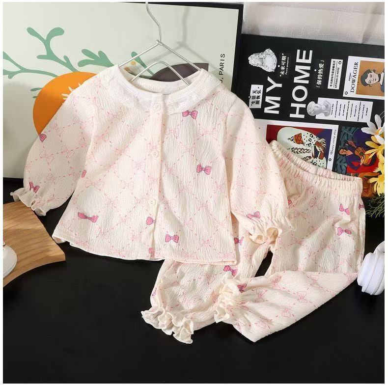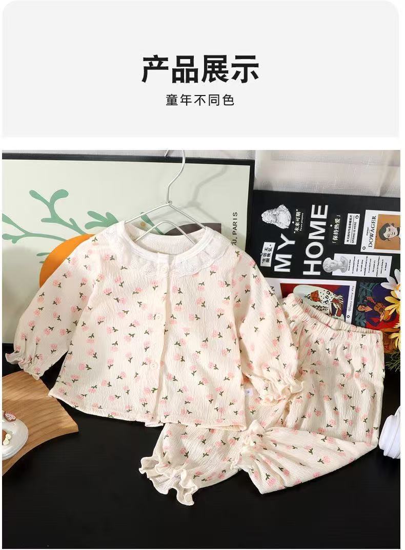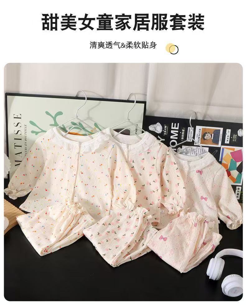 새로운 여아 홈웨어 세트, 레이스 루즈한 얇은 잠옷, 9부 바지, 에어컨 의류, 투피스 아동복 도매스토어 가기