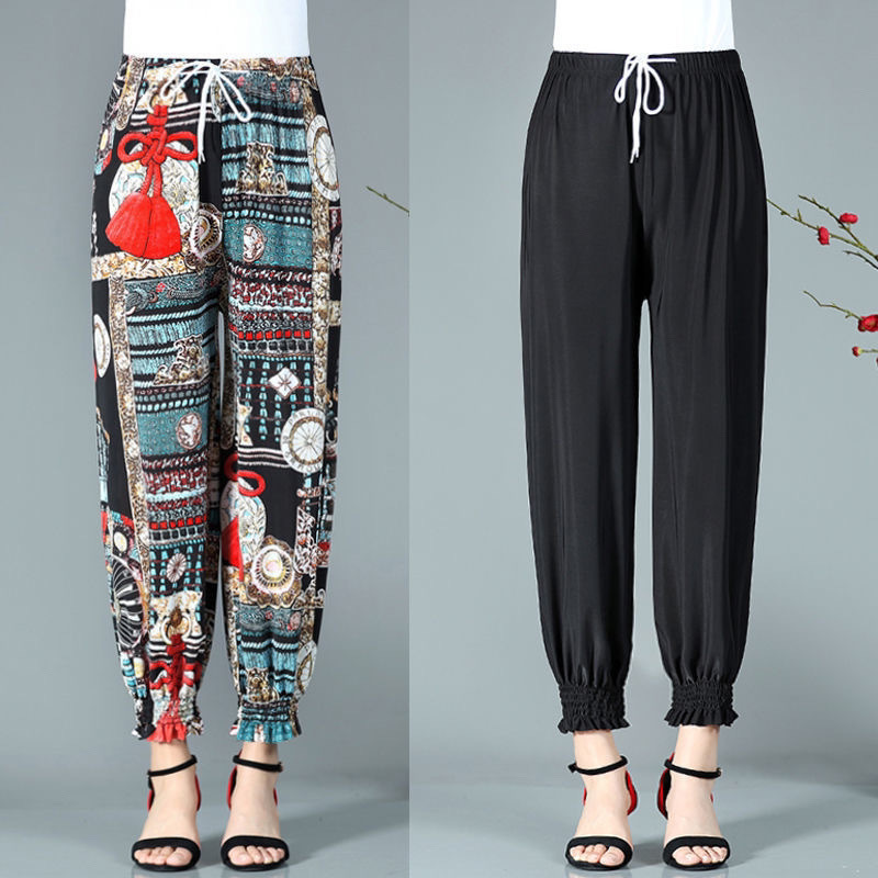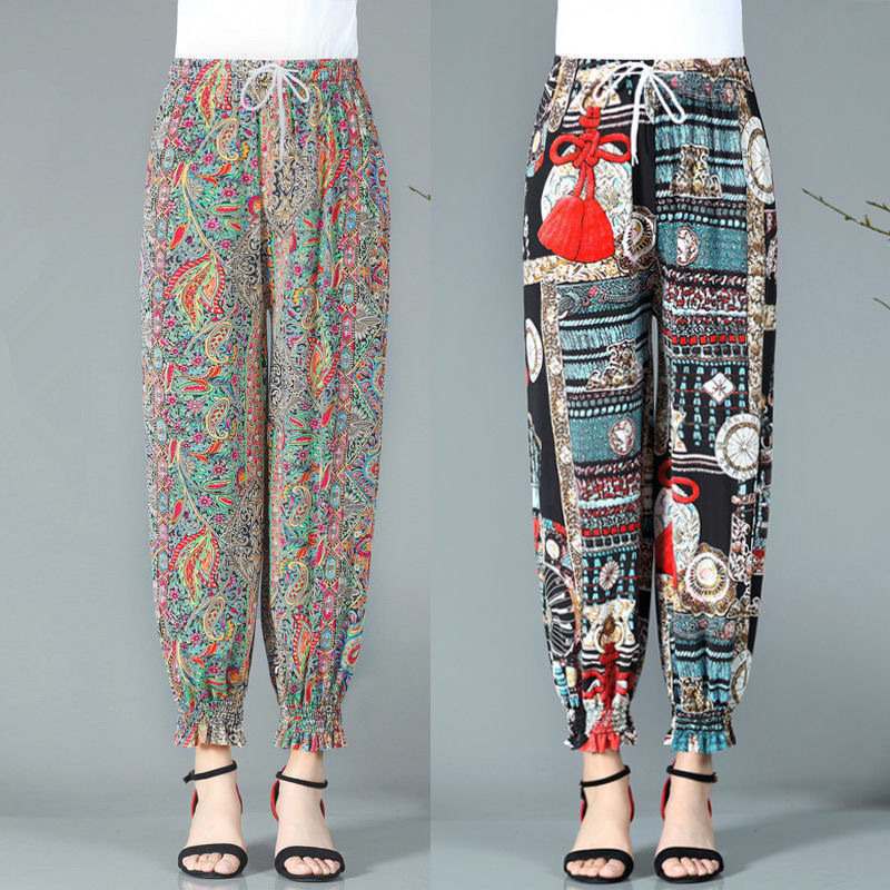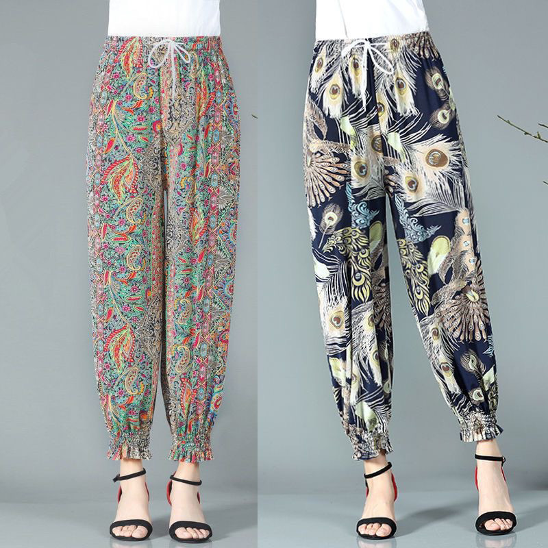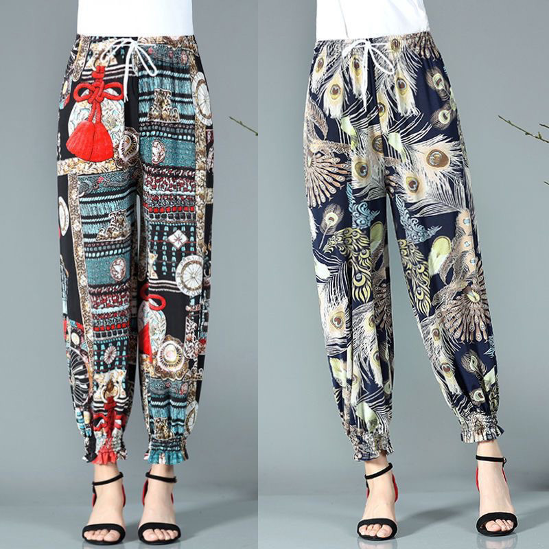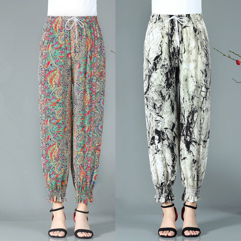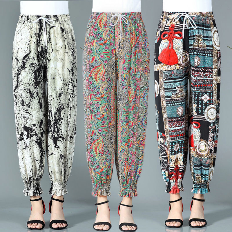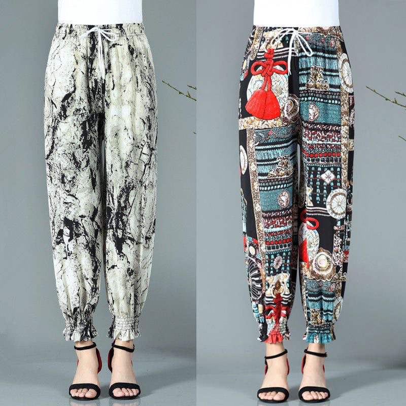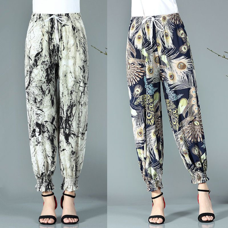 새로운 스타일 여름 여성 아이스 실크 번들 발 꽃 바지 엄마 스트레치 블루머스 중년 여성 바지 여름 꽃 바지
