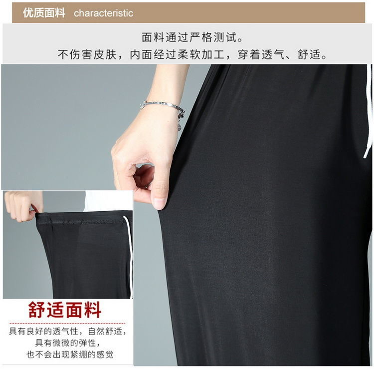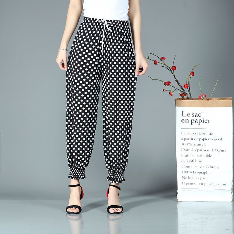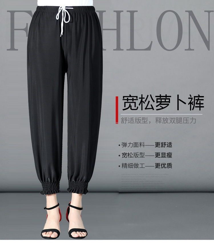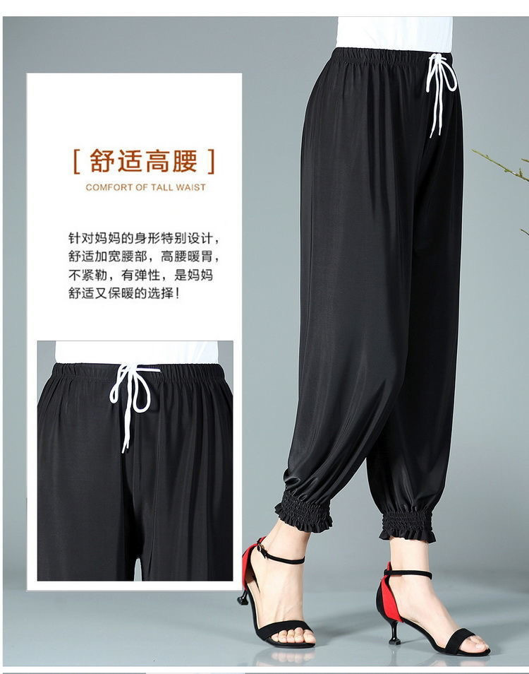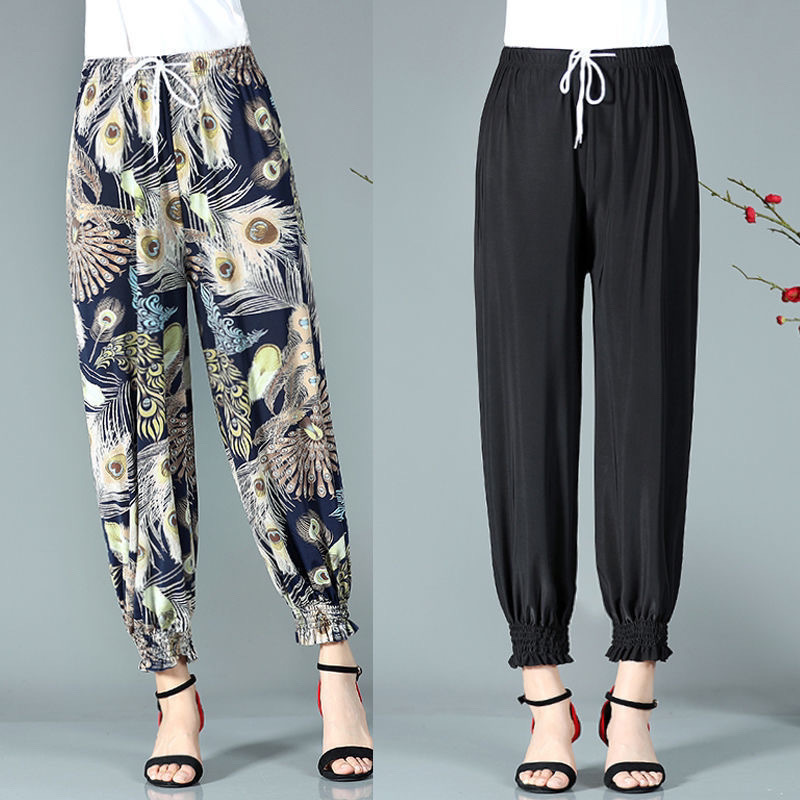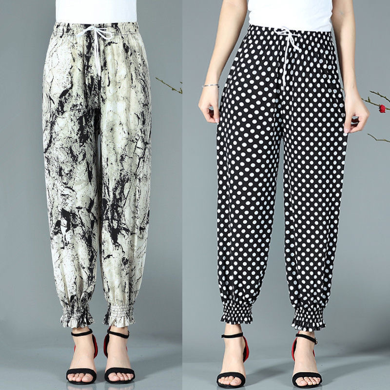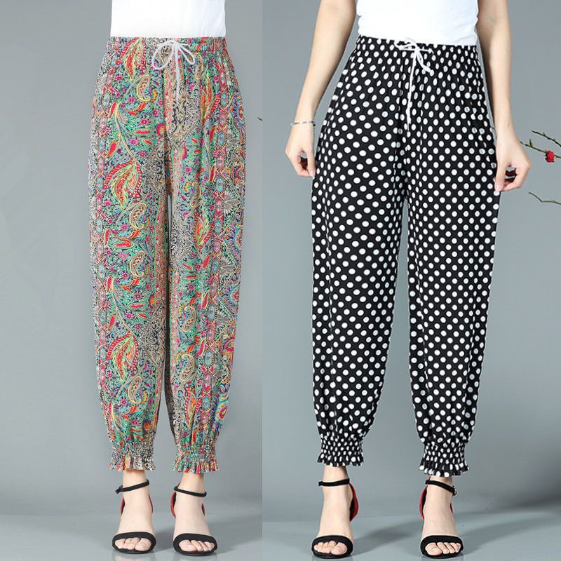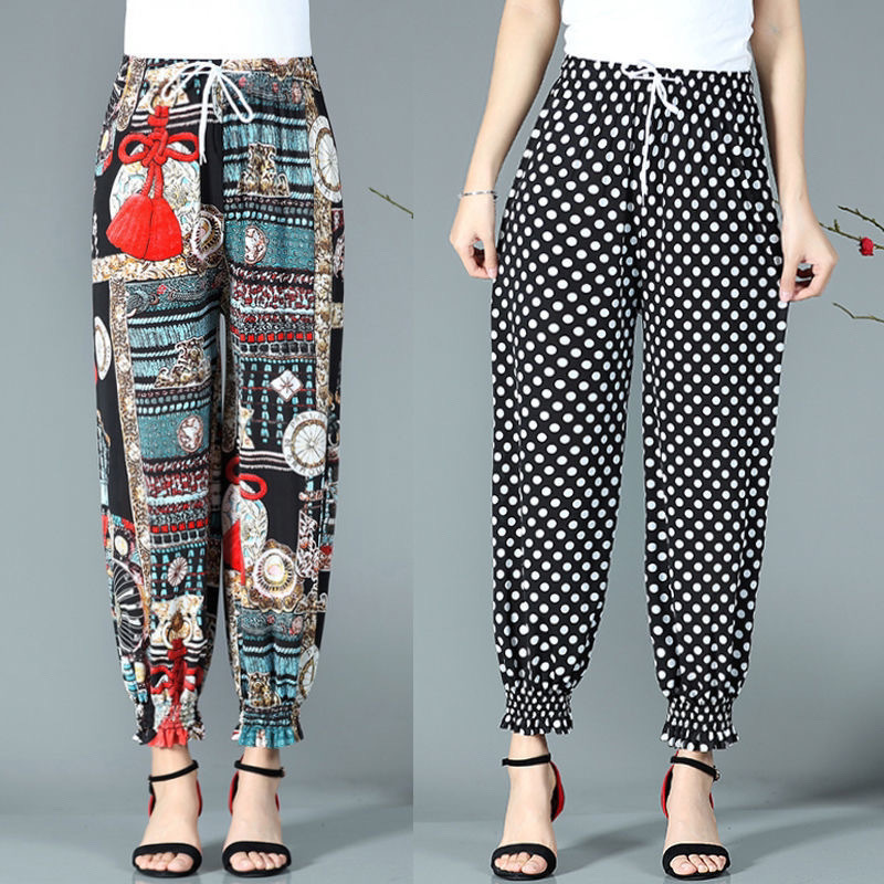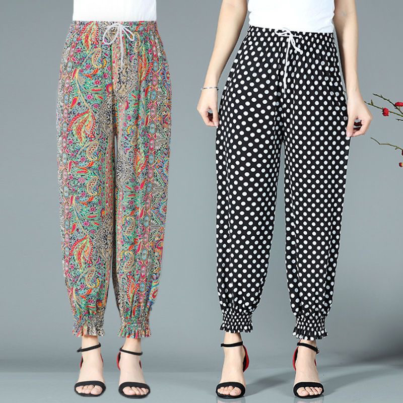 새로운 스타일 여름 여성 아이스 실크 번들 발 꽃 바지 엄마 스트레치 블루머스 중년 여성 바지 여름 꽃 바지
