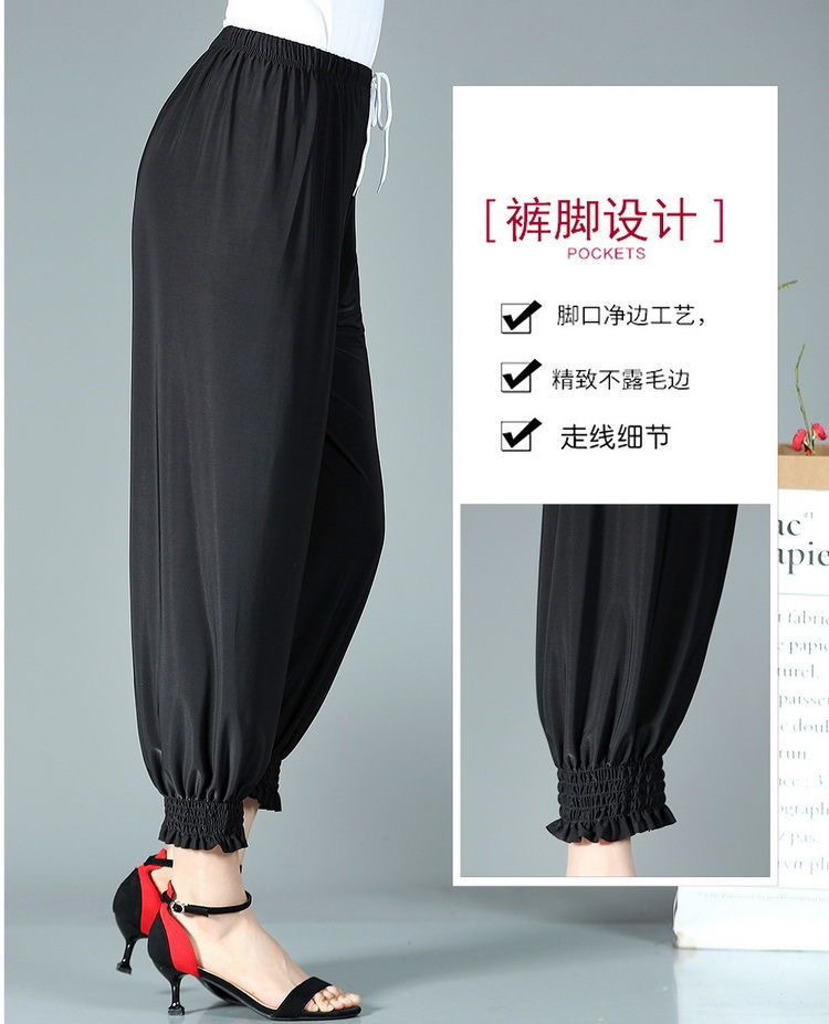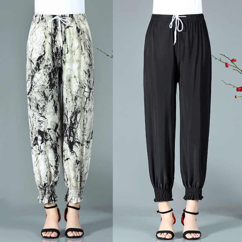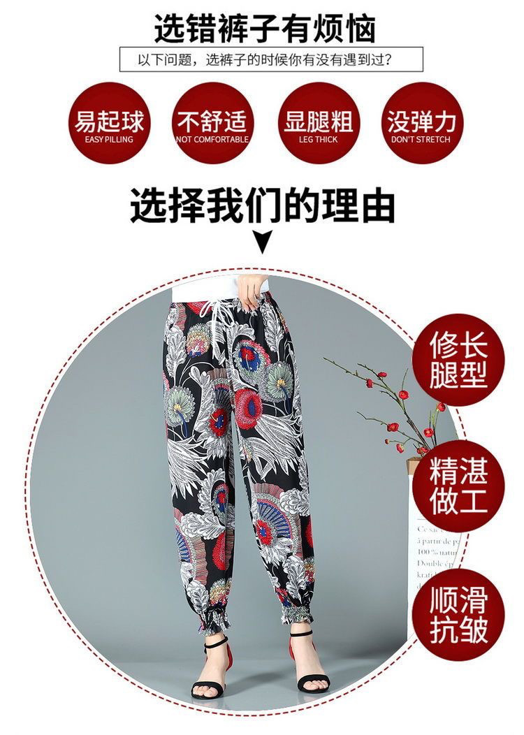 새로운 스타일 여름 여성 아이스 실크 번들 발 꽃 바지 엄마 스트레치 블루머스 중년 여성 바지 여름 꽃 바지스토어 가기