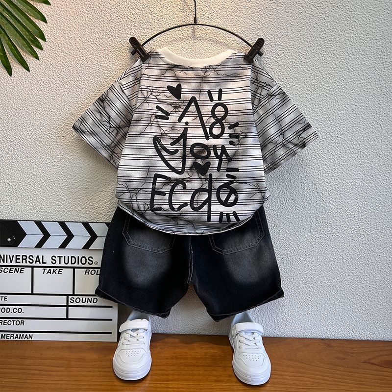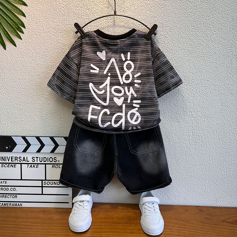 소년 여름 옷 세트 2025 새로운 어린이 여름 반팔 줄무늬 티셔츠 세련된 아기 잘 생긴 유행 옷스토어 가기