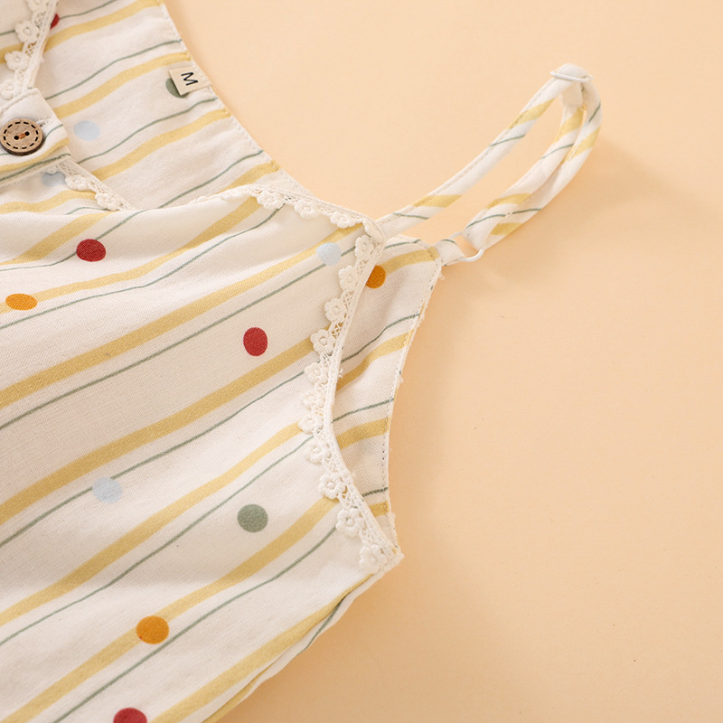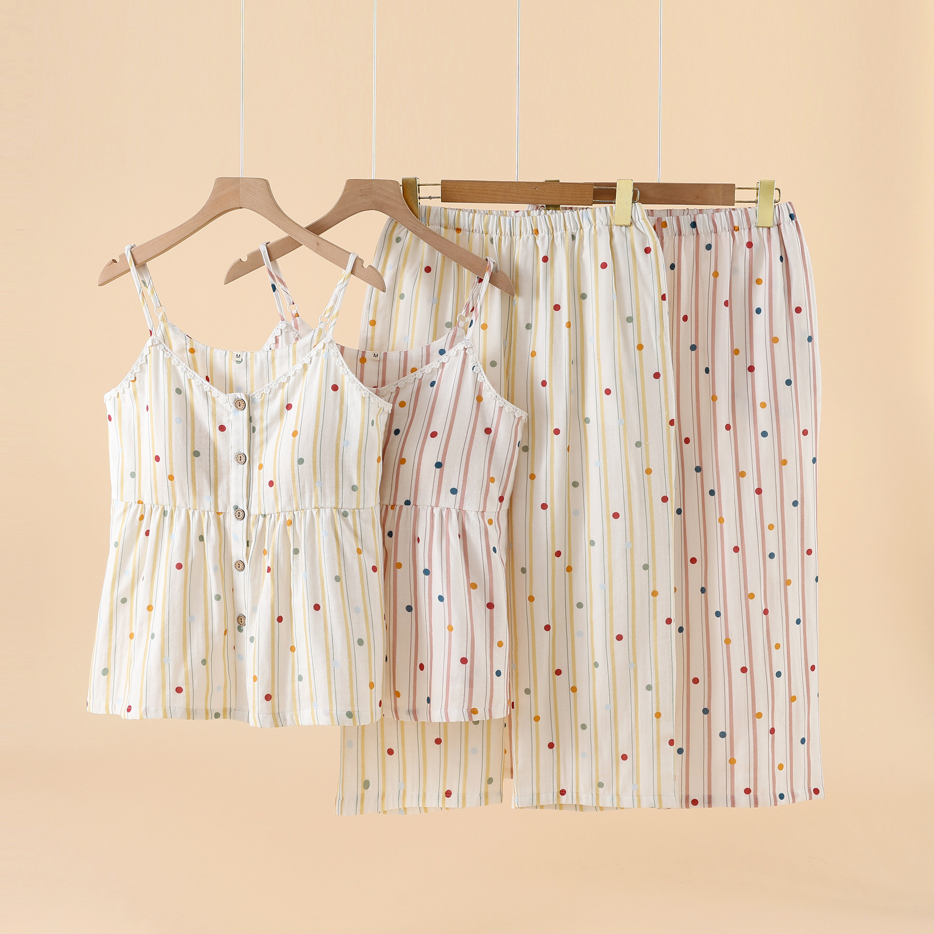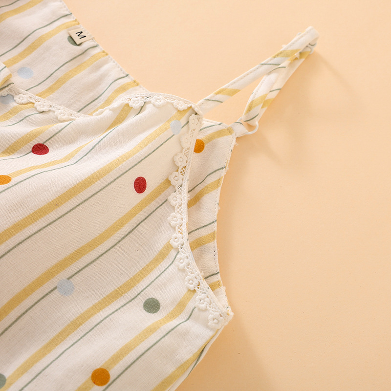 여성을위한 새로운 여름 순수 코튼 더블 레이어 거즈 가슴 패드 잠옷 얇은 달콤한 서스펜더 카프리 홈웨어 세트