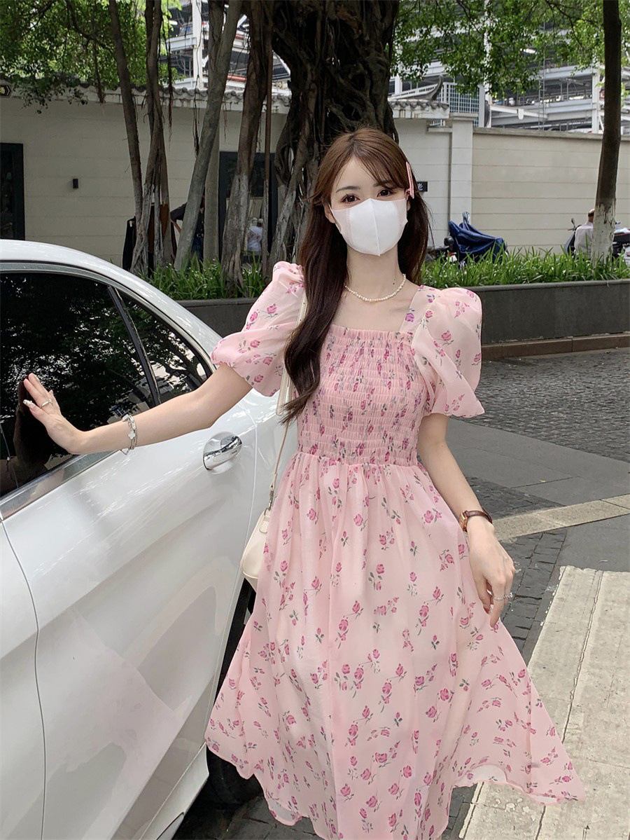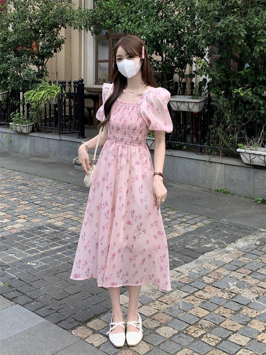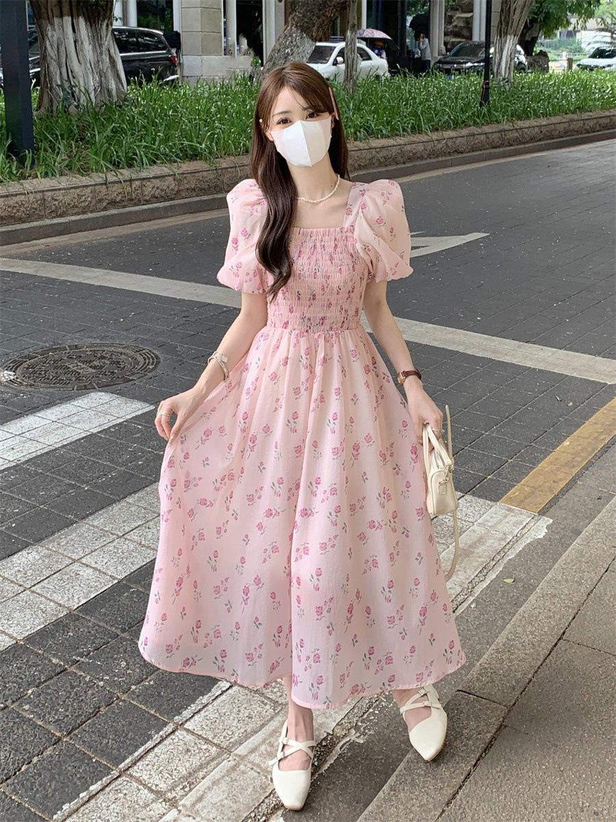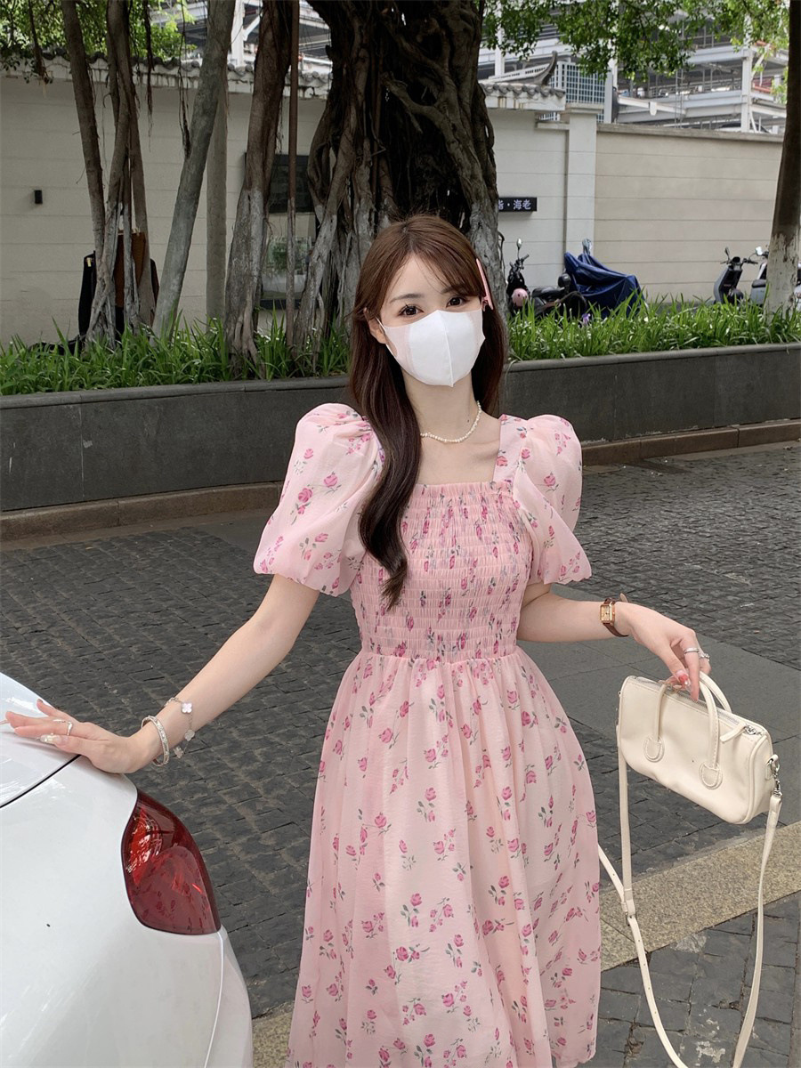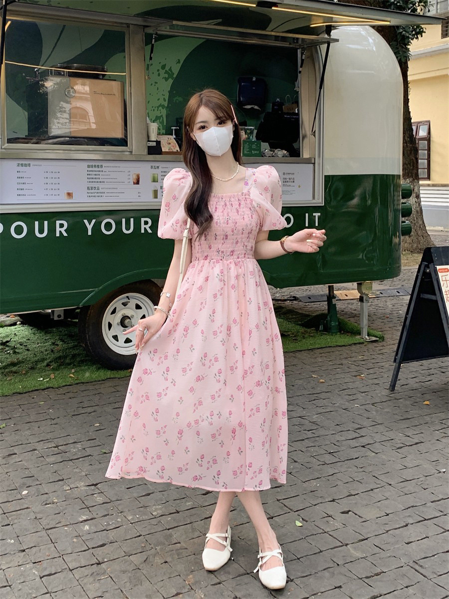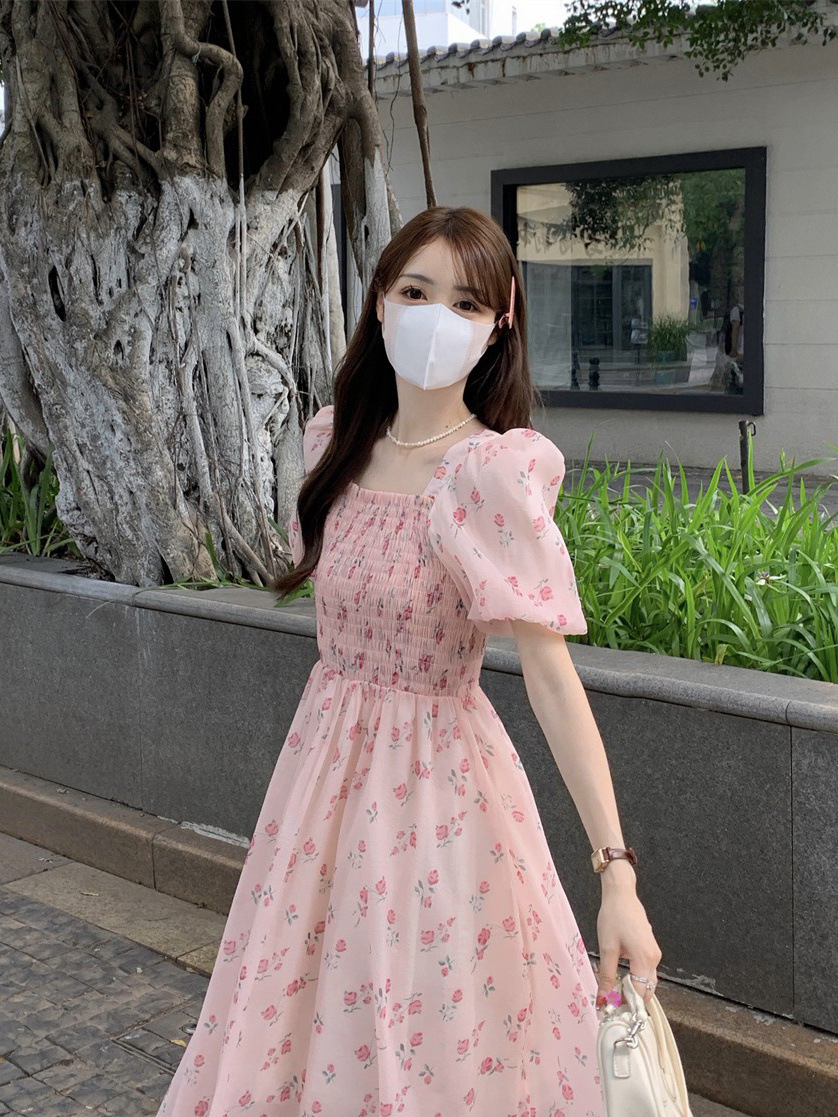 프랑스 스타일 부드러운 꽃 광장 칼라 퍼프 소매 원피스 여성의 2025 여름 우아한 허리 중간 길이 치마스토어 가기