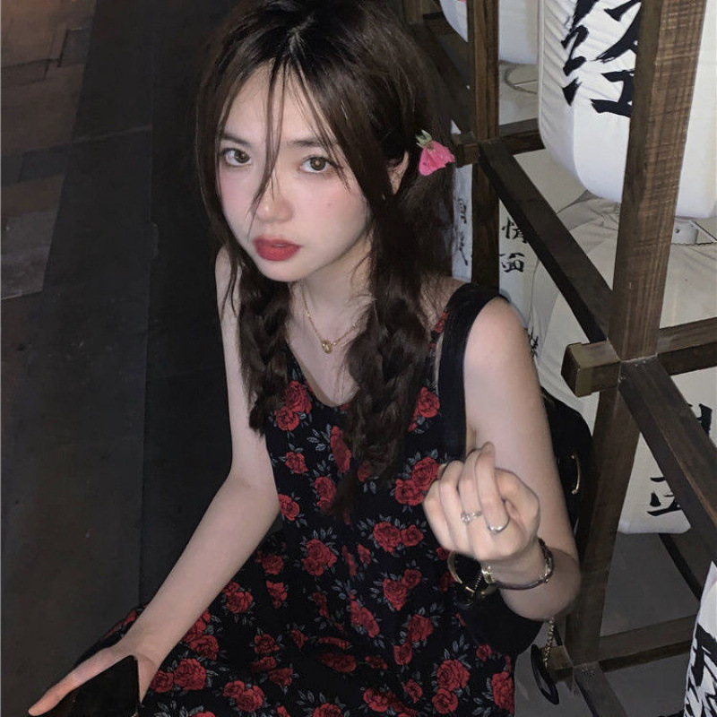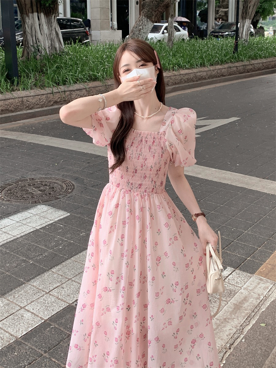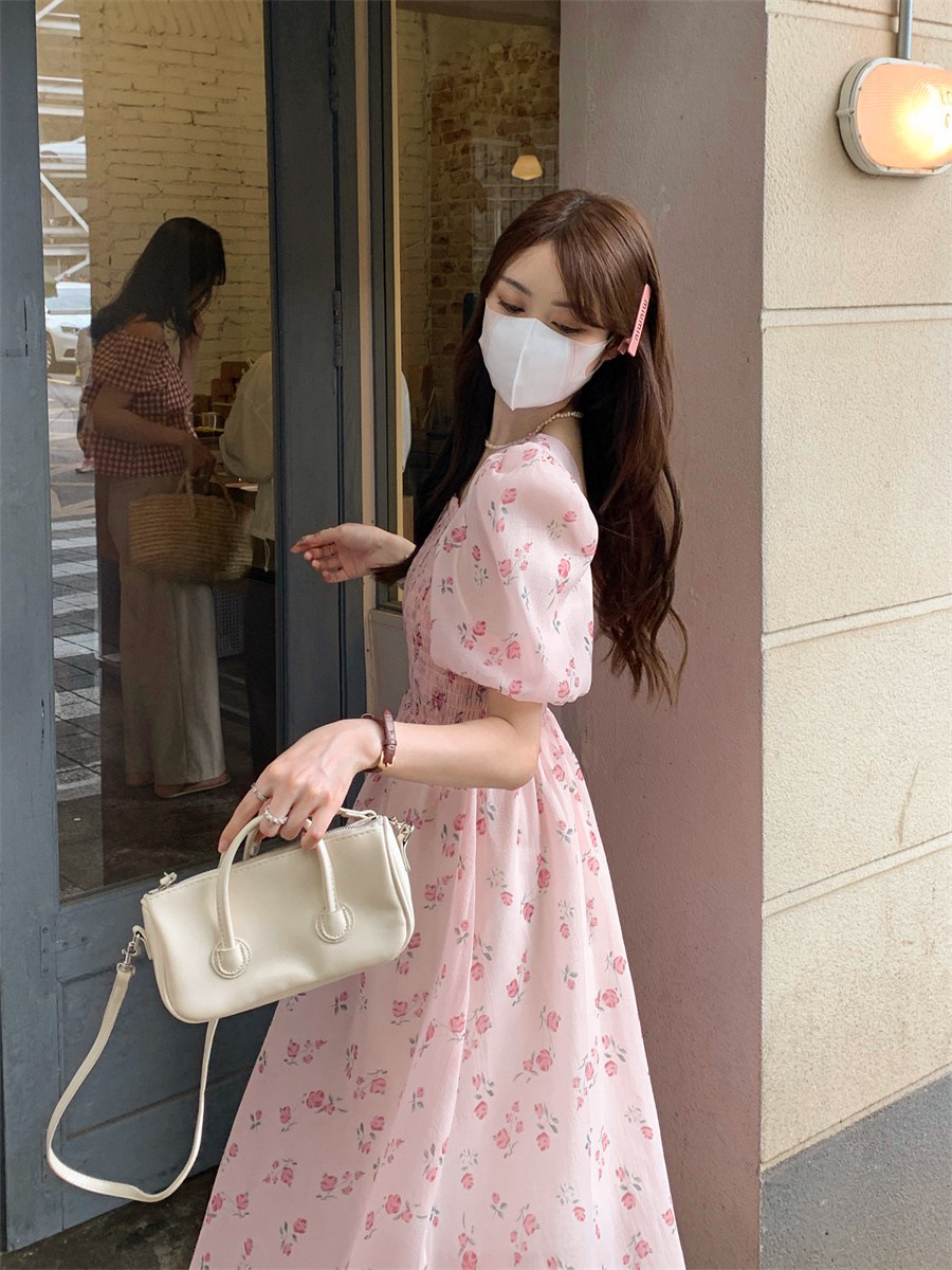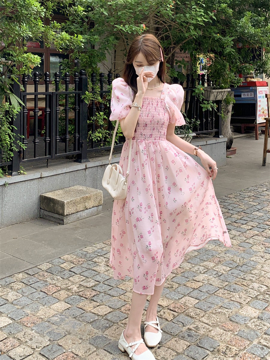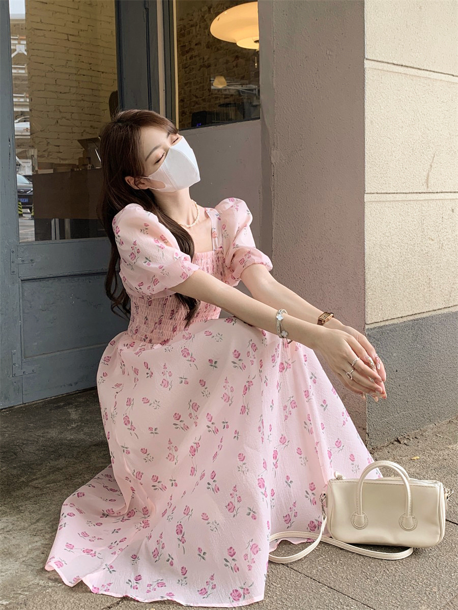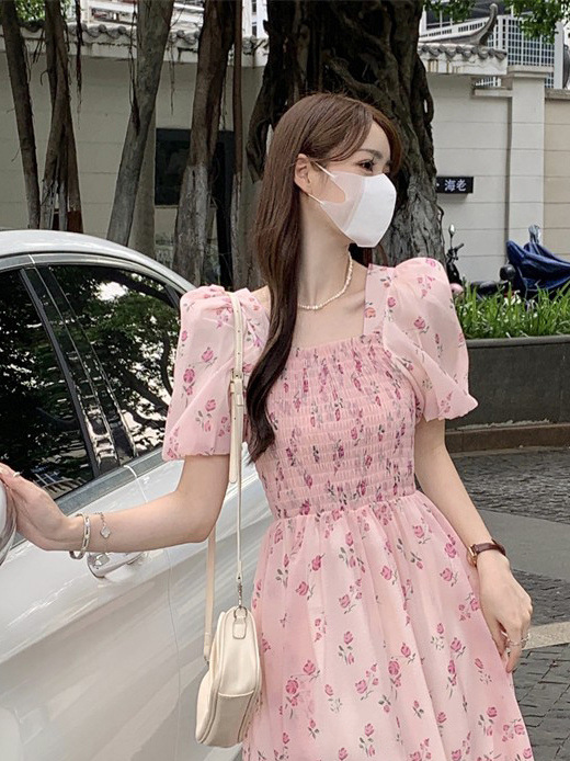 프랑스 스타일 부드러운 꽃 광장 칼라 퍼프 소매 원피스 여성의 2025 여름 우아한 허리 중간 길이 치마스토어 가기