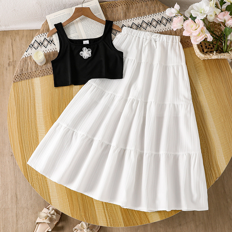 여아 정장, 대외 무역 아동복, 2025 봄 여름 유럽 및 미국 신상품, 작은 꽃무늬 민소매 조끼, 흰색 스커트