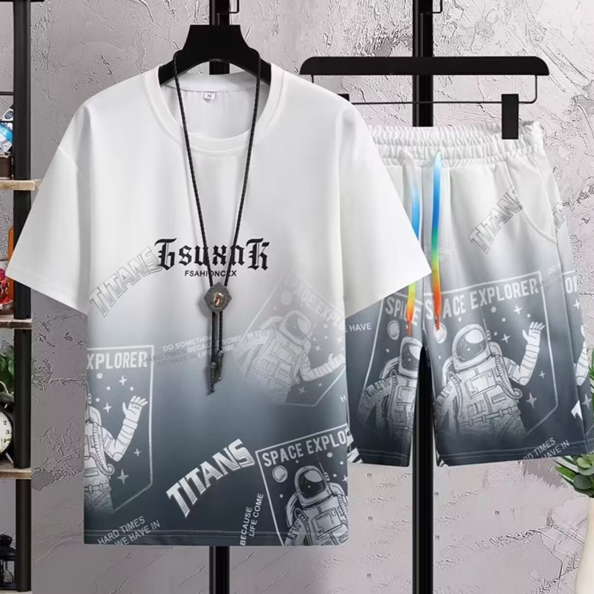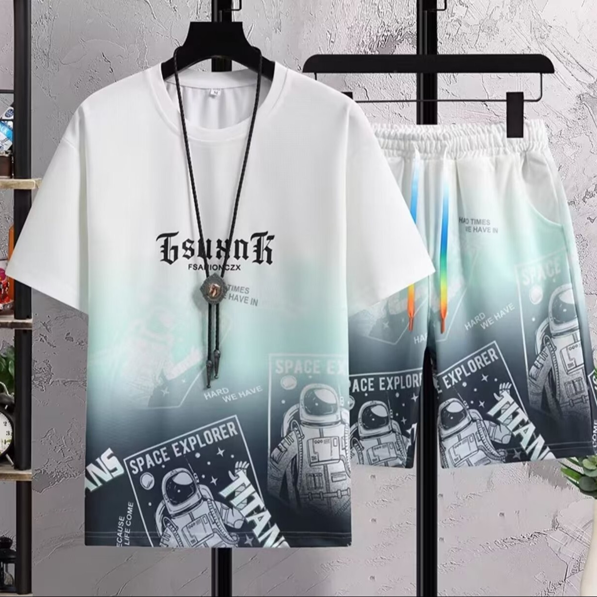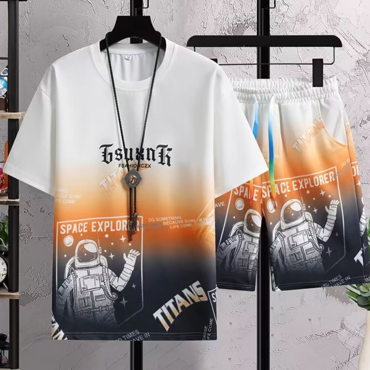 여름 새로운 남성 그라디언트 패션 캐주얼 세트 청소년 스포츠 패션 반바지 짧은 T 투피스 세트