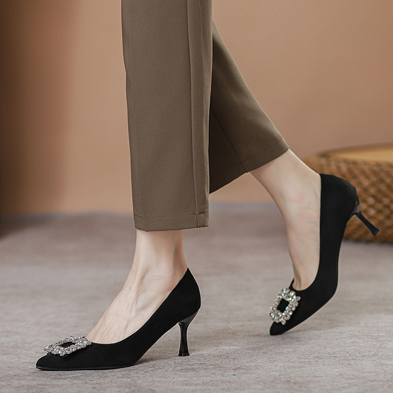 여성을 위한 프렌치 블랙 하이힐, 우아하고 섹시한 새로운 스타일의 뾰족한 사각 버클, 라인스톤 스틸레토 힐, 발이 피곤하지 않은 싱글 슈즈, 작업화스토어 가기