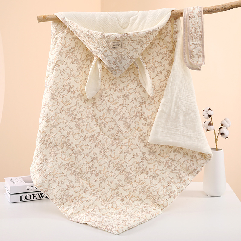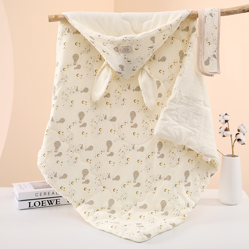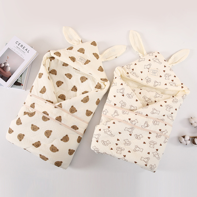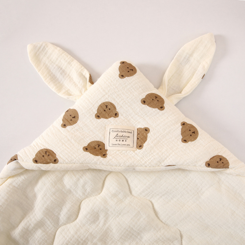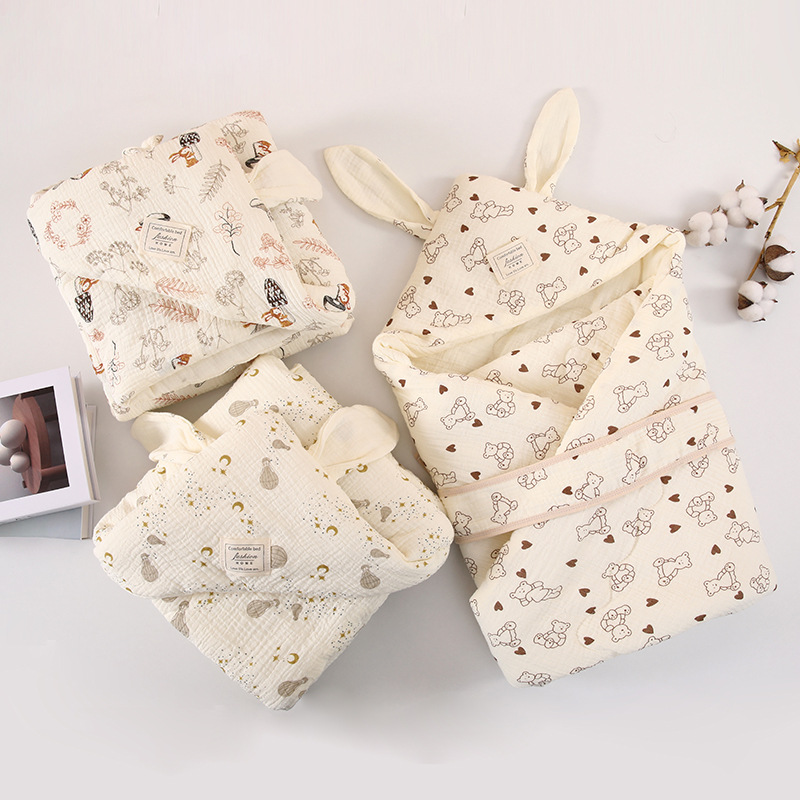 生儿绉布夹棉包被 初生四季抱被a类产房兔耳朵加棉抱被纯棉a类