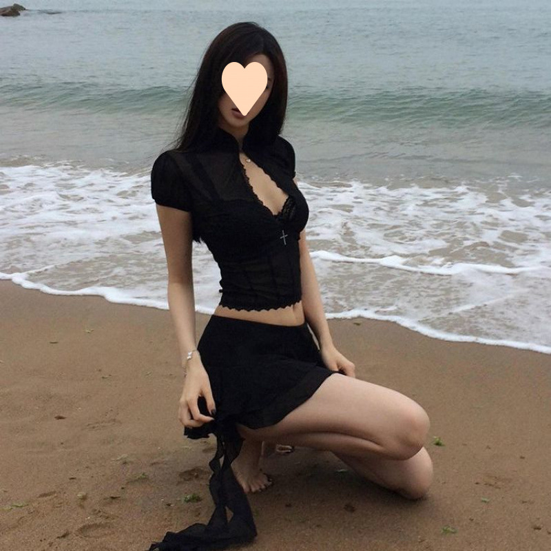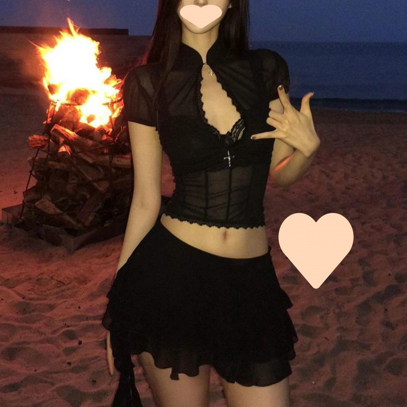 순수한 뜨거운 소녀 스타일 섹시한 메쉬 레이스 셔츠 여성의 여름 디자인 감각 버블 슬리브 새로운 중국 짧은 탑