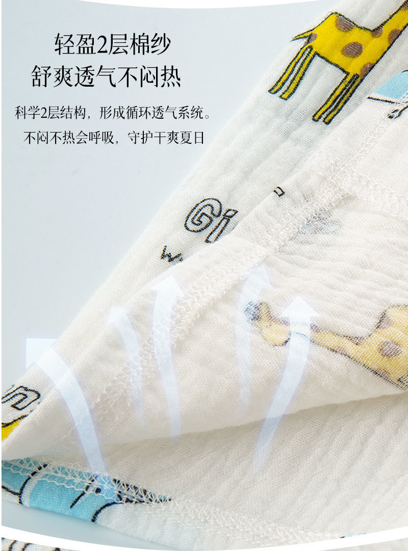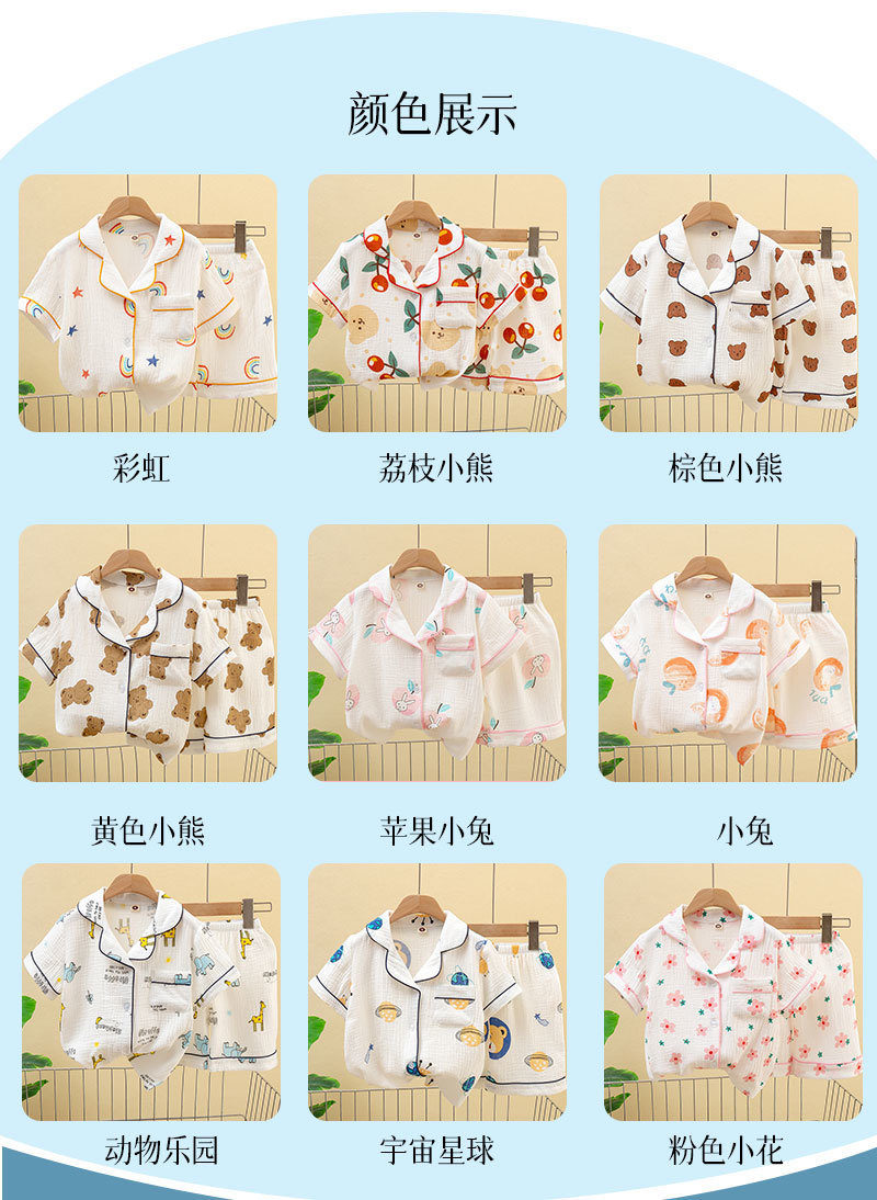 남성과 여성의 어린이 잠옷 여름 더블 레이어 코튼 원사 홈 의류 반팔 반바지 얇은 에어컨 의류 카디건 투피스 세트스토어 가기