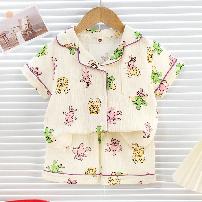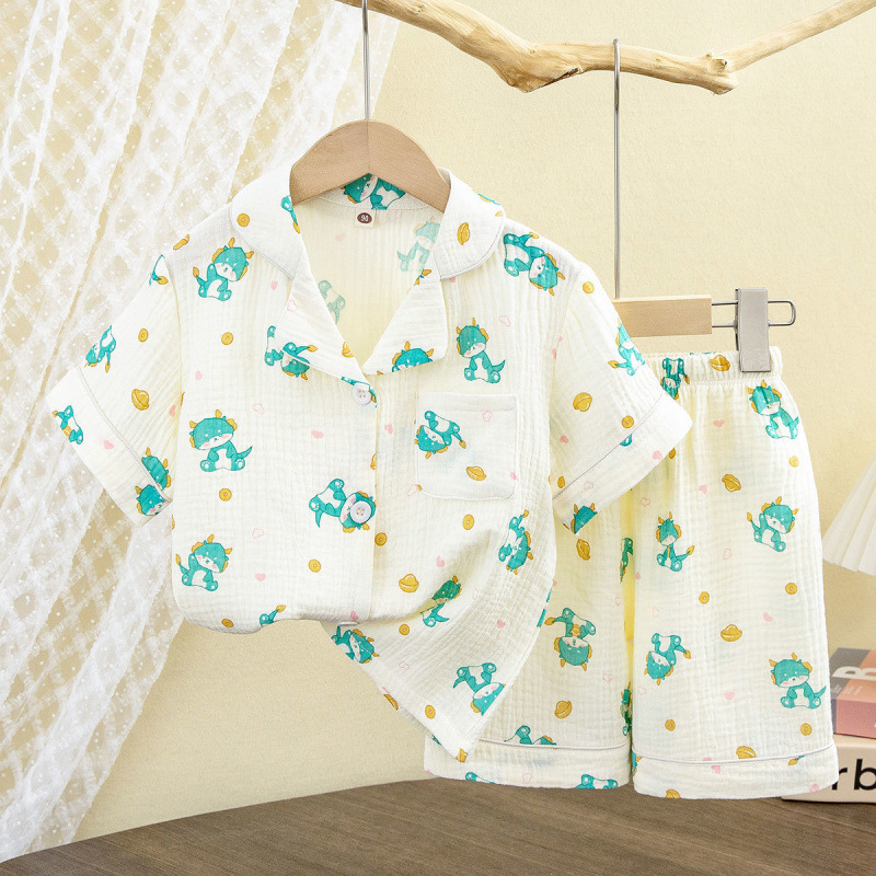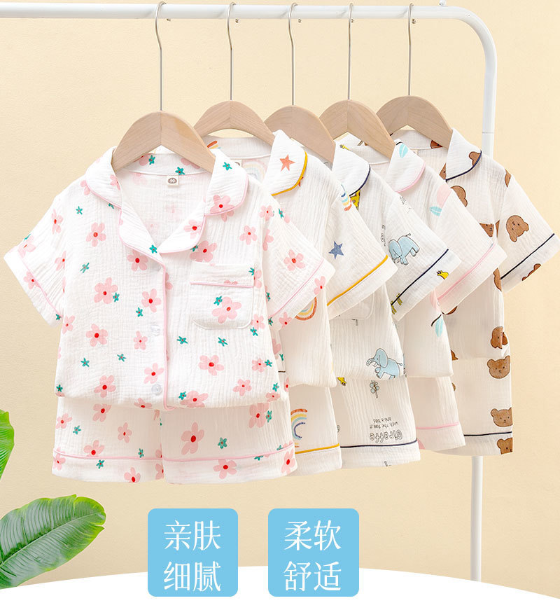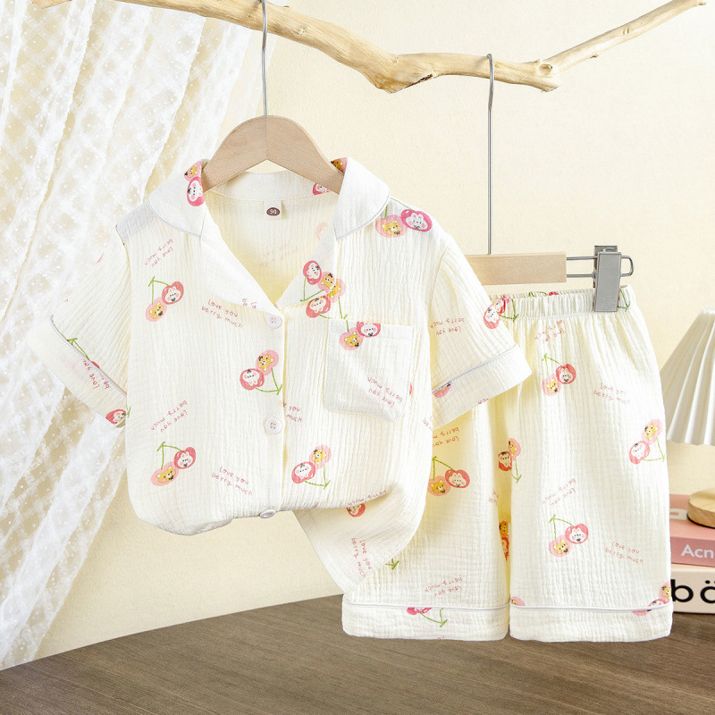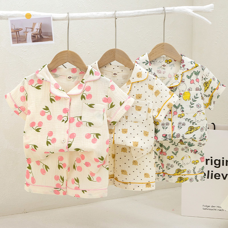 남성과 여성의 어린이 잠옷 여름 더블 레이어 코튼 원사 홈 의류 반팔 반바지 얇은 에어컨 의류 카디건 투피스 세트