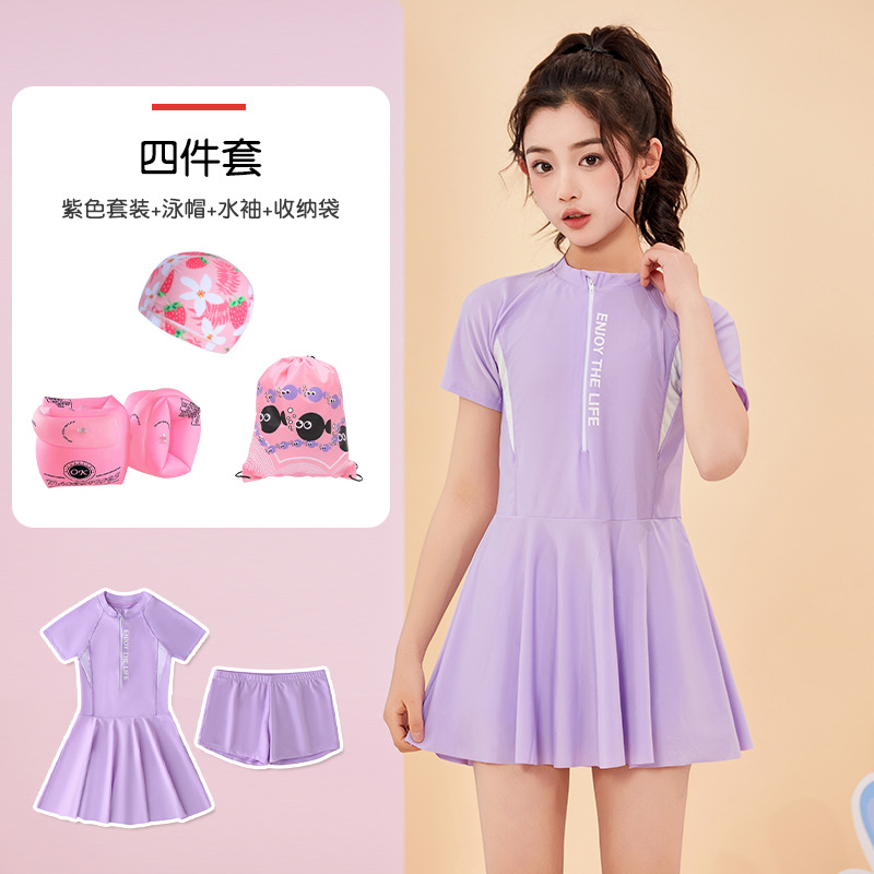 • 보라색 [수영복, 수영모, 수영소매, 수납가방] 4종세트
