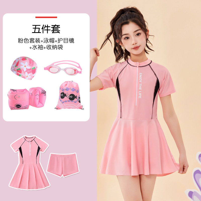 • 핑크 [수영복, 수영모, 고글, 수영소매, 수납가방] 5종세트