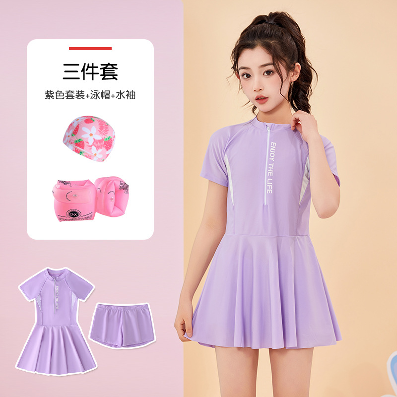 • 보라색 [수영복, 수영모, 수영소매] 3종세트