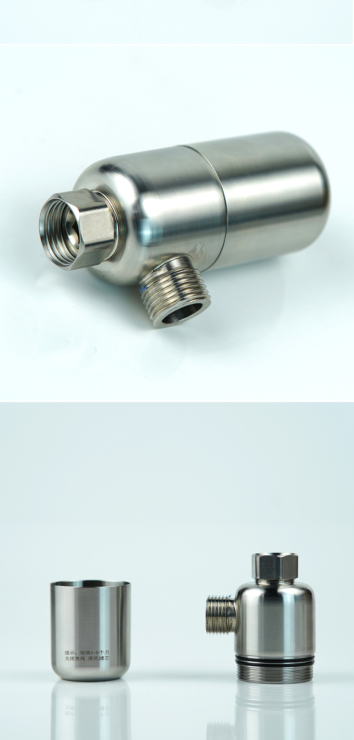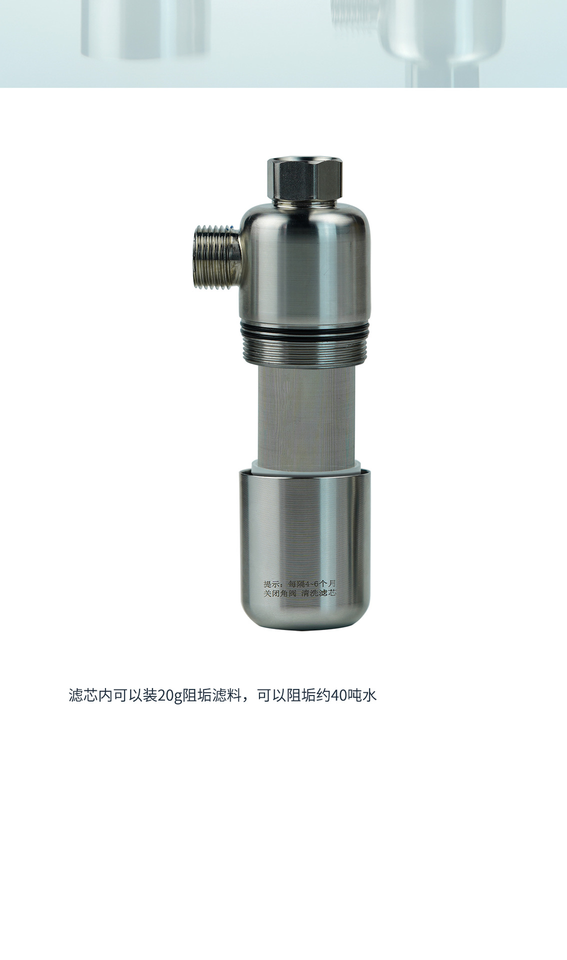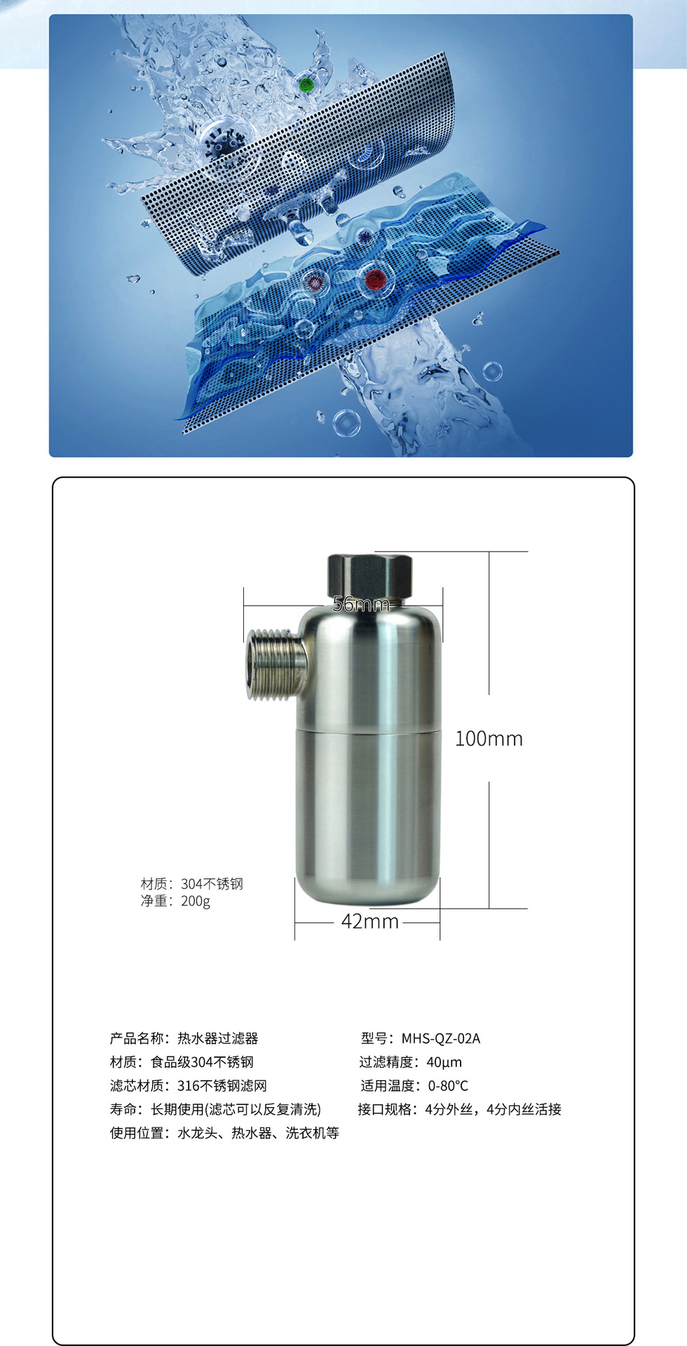 食品级304不锈钢外壳,主体一体拉伸工艺,承压更强,4分活接配四分外丝,适用市场上各种设备,匹配热水器、花洒、马桶,洗衣机,洗碗机等用水设备,内置100目精度的不锈钢滤网,可以装树脂、阻垢FOF,抑菌滤料,碱性材料,香氛材料等