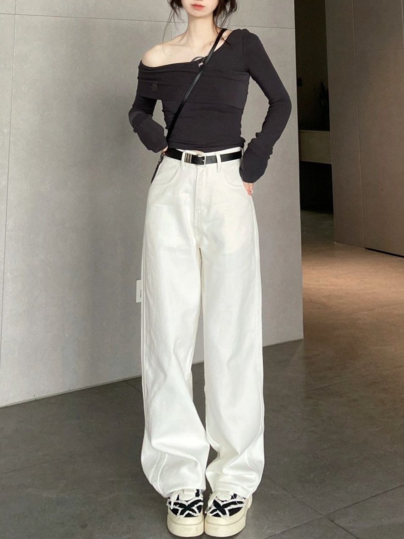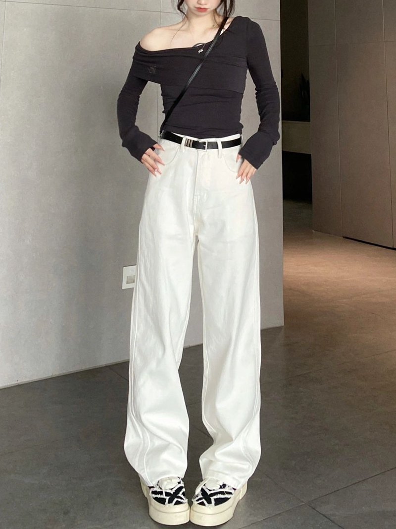 플러스 사이즈 화이트 데님 넓은 다리 바지 여성 여름 2025 새로운 높은 허리 패션 높은 감각 캐주얼 바지스토어 가기