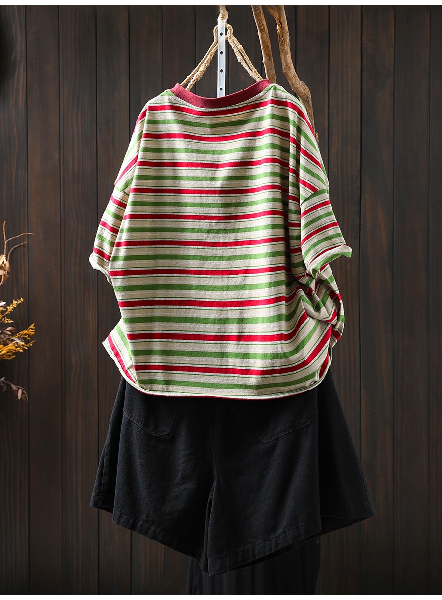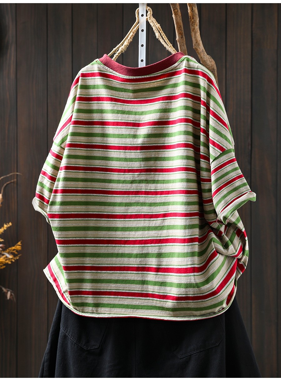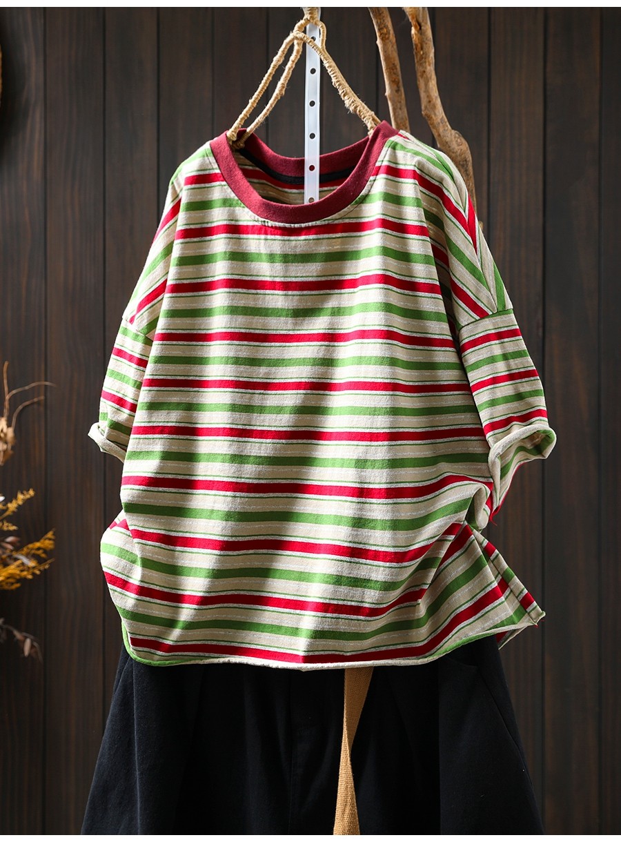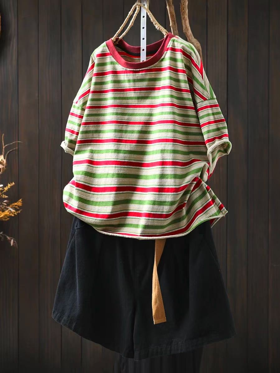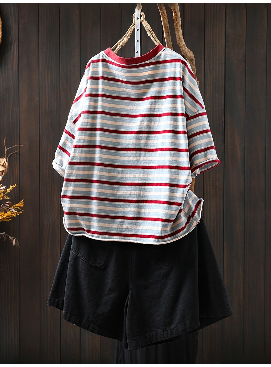 여름 새 색상 줄무늬 대조 면 반팔 티셔츠 여성용 짧은 작은 느슨한 8620