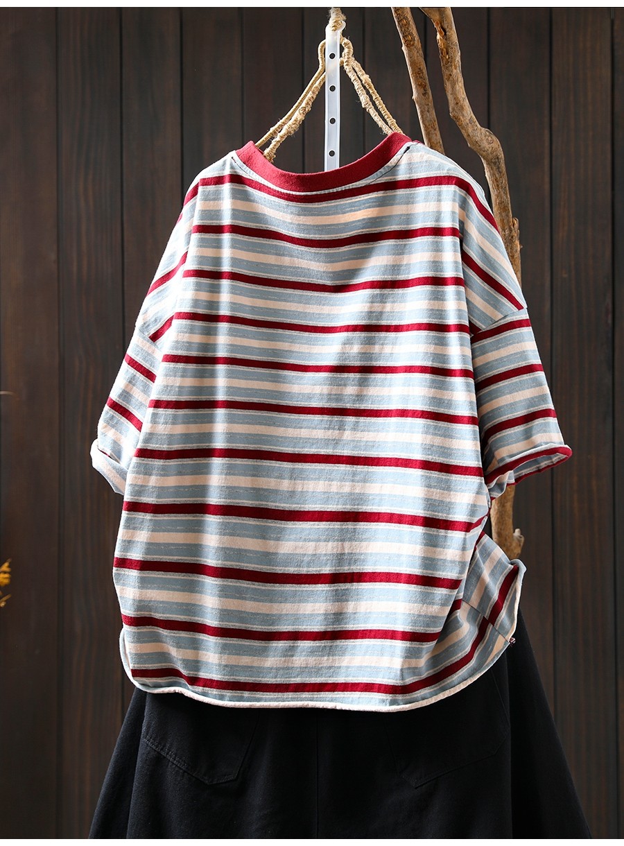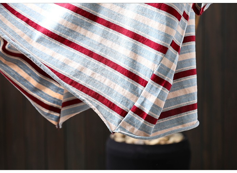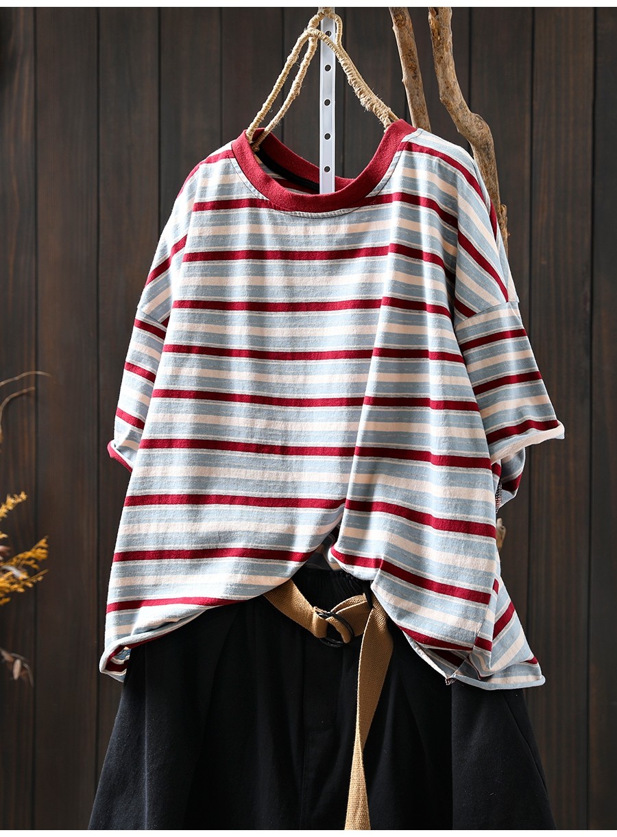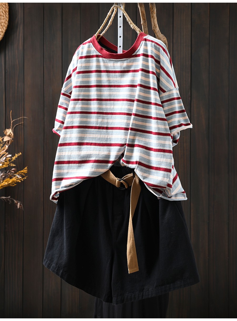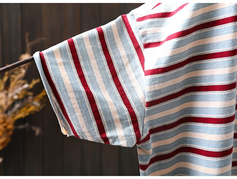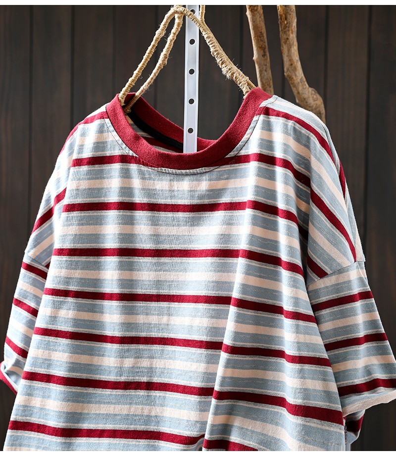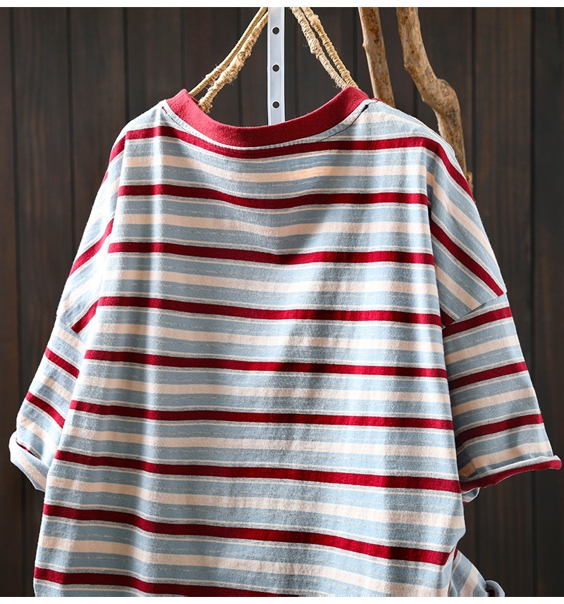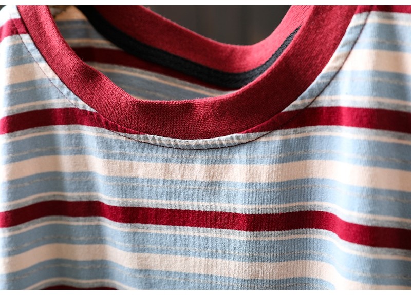 여름 새 색상 줄무늬 대조 면 반팔 티셔츠 여성용 짧은 작은 느슨한 8620스토어 가기