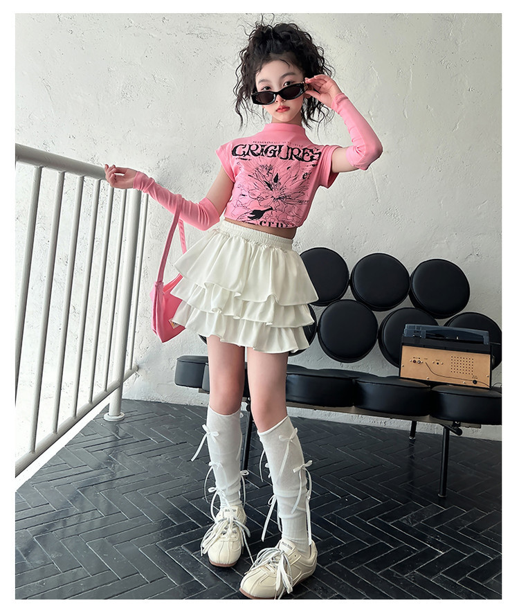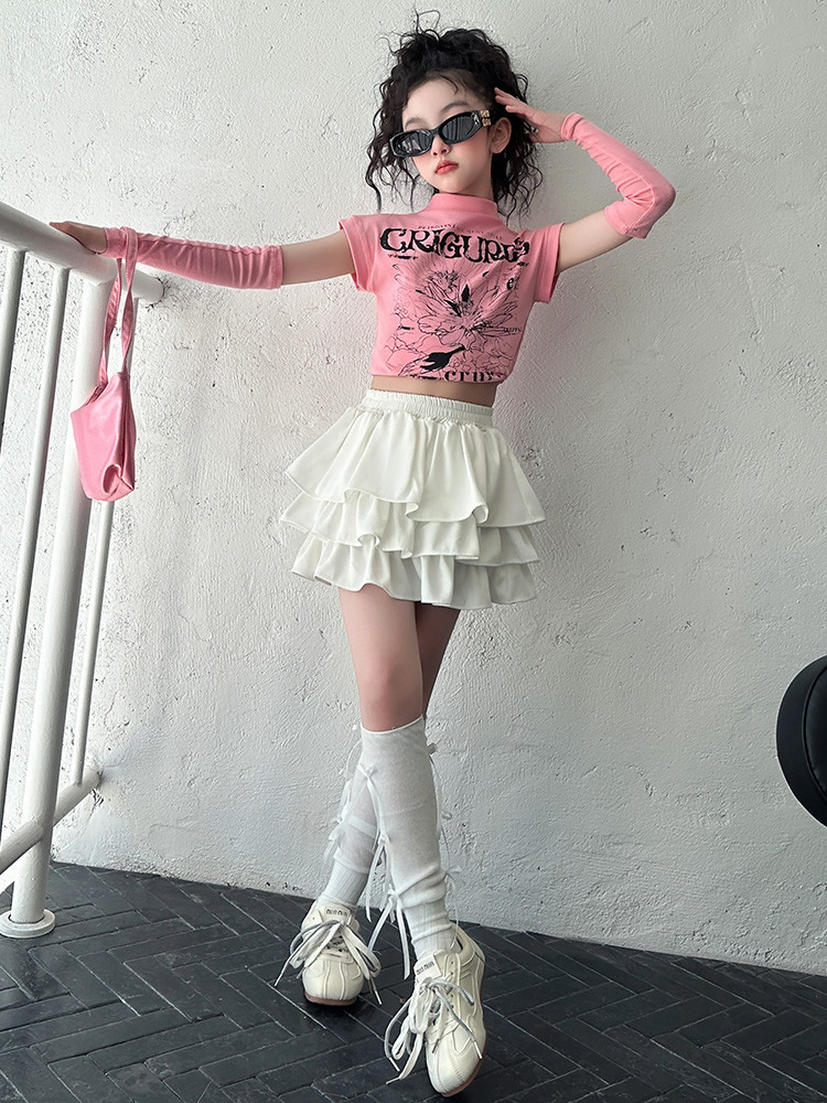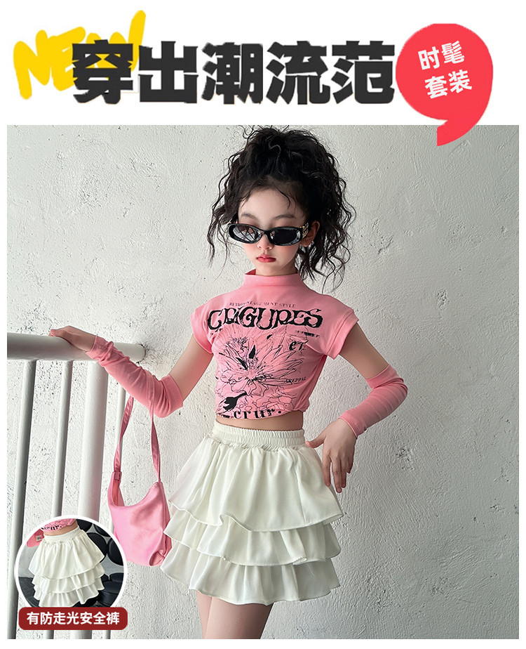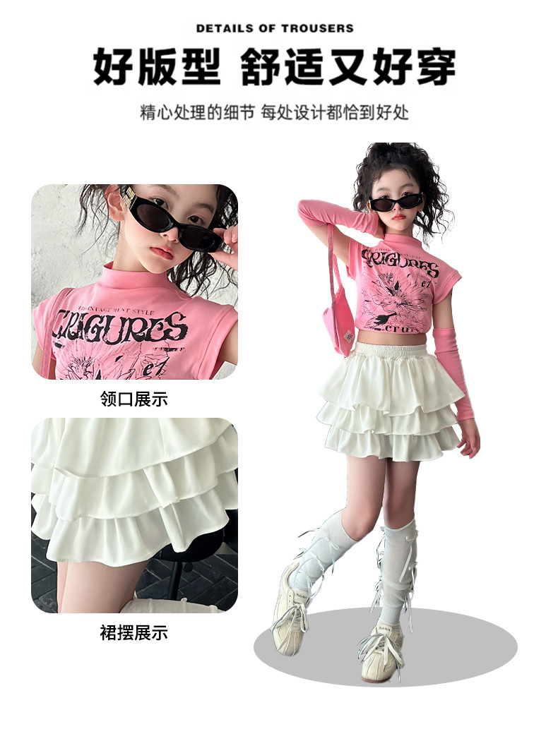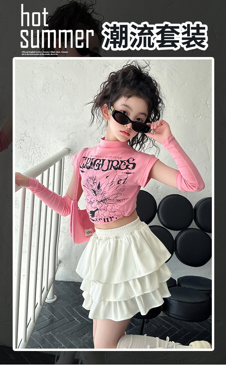 2025 국경 아동복 여름 달콤한 쿨 소녀의 반팔 티셔츠 눈부심 방지 스커트 여성 그룹 공연 의류 세트 조수스토어 가기