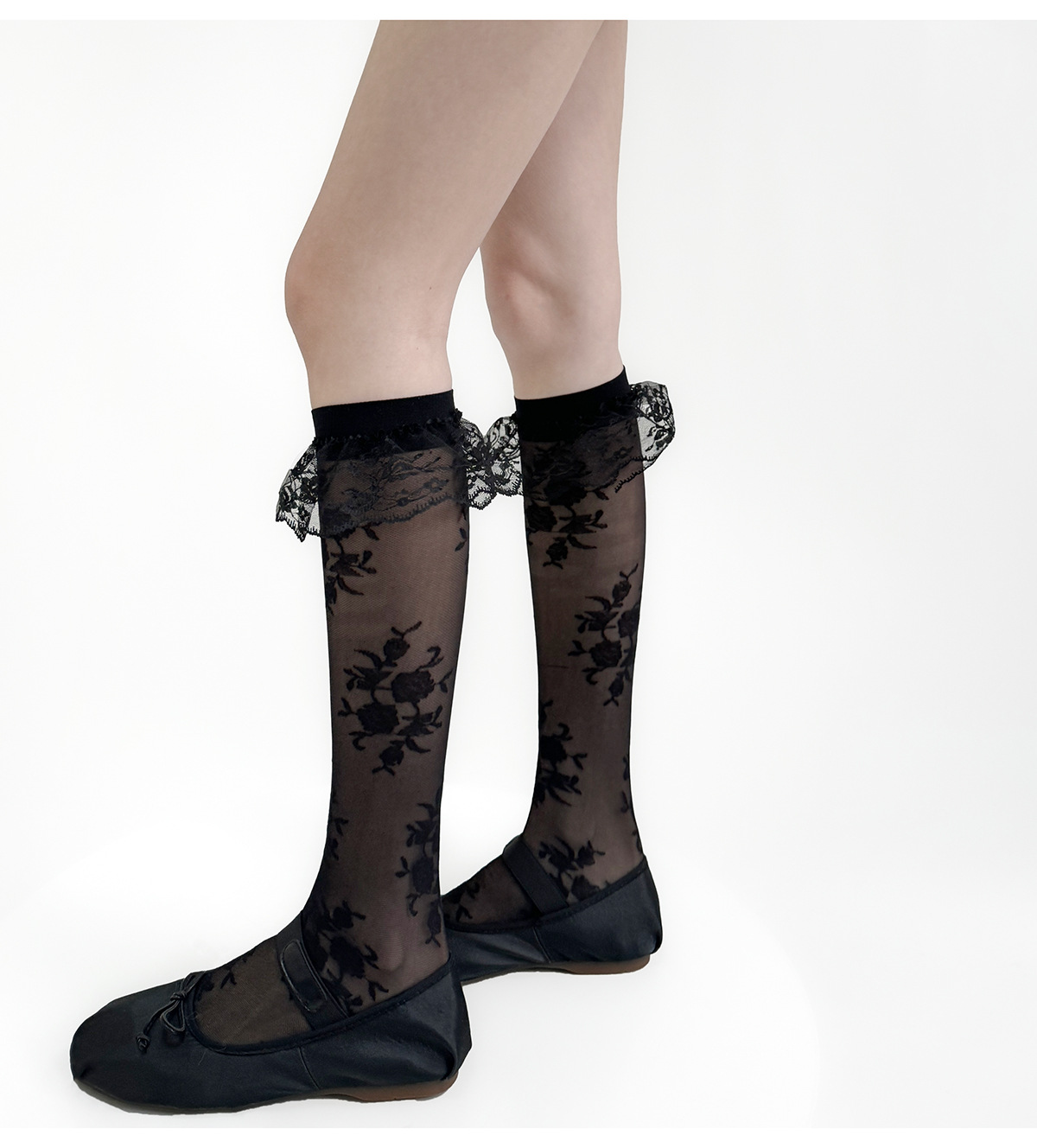 봄과 여름 스타일 장미 꽃 레이스 송아지 양말 흰색 투명 organza 검은 고기 jk 양말스토어 가기
