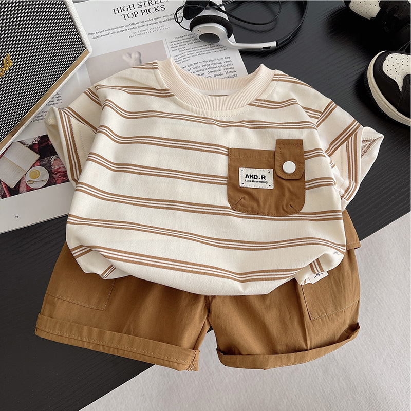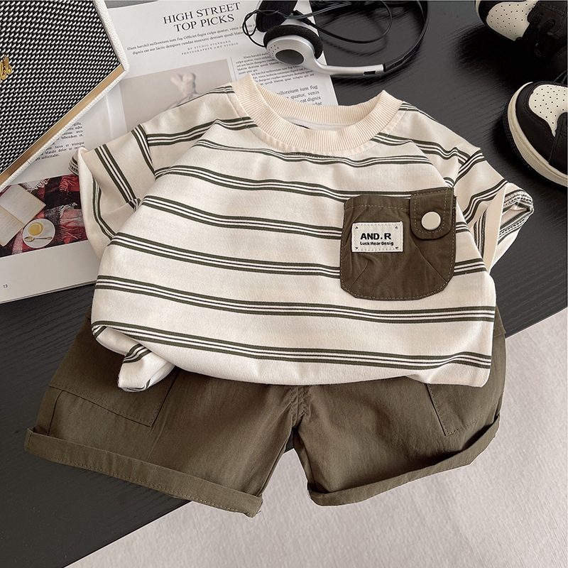 남학생 반팔 세트 2025 년 새 여름 잘 생긴 소년의 서양식 줄무늬 투피스 여름 옷스토어 가기