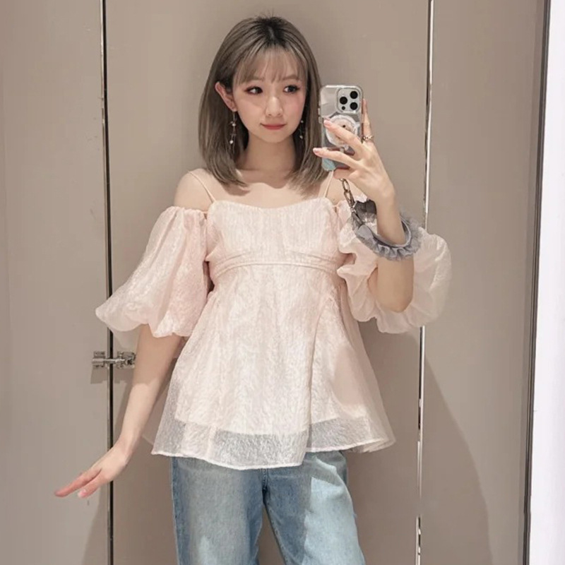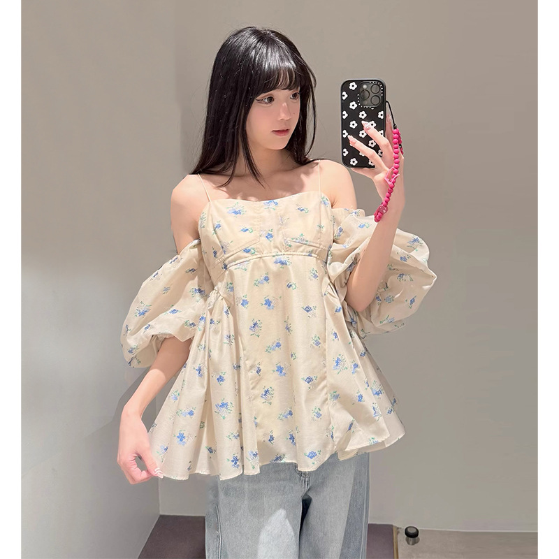 [후이 린] 2025 년 여름 일본 국경 달콤한 거품 소매 어깨 노출 인쇄 짧은 슬링 탑 여성을위한 25A169