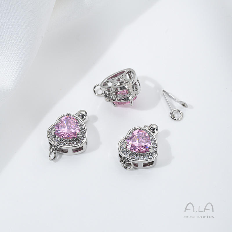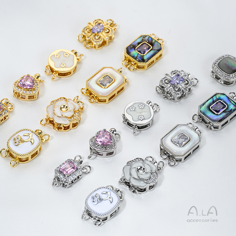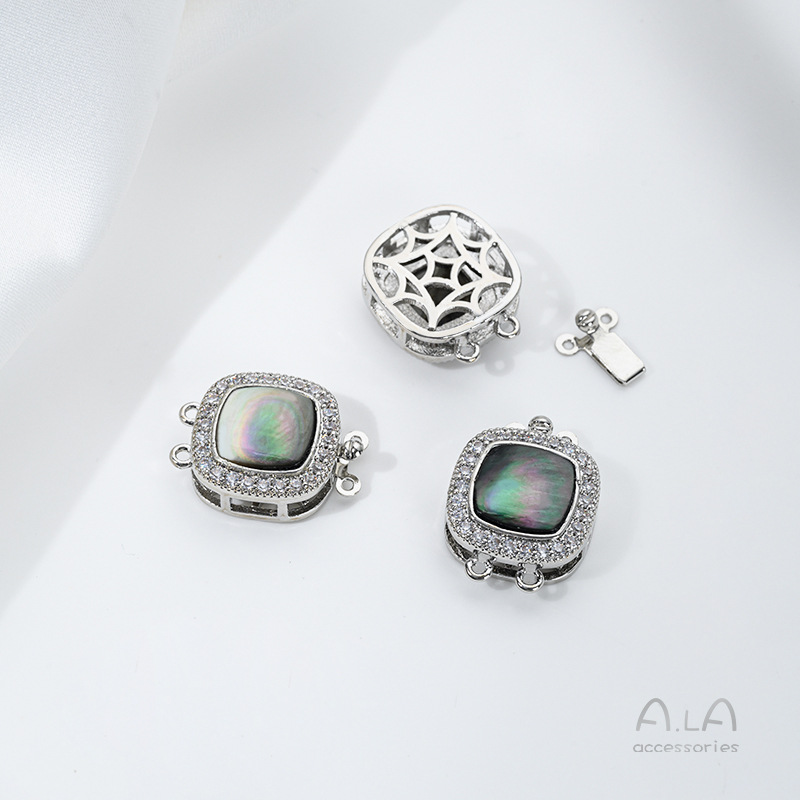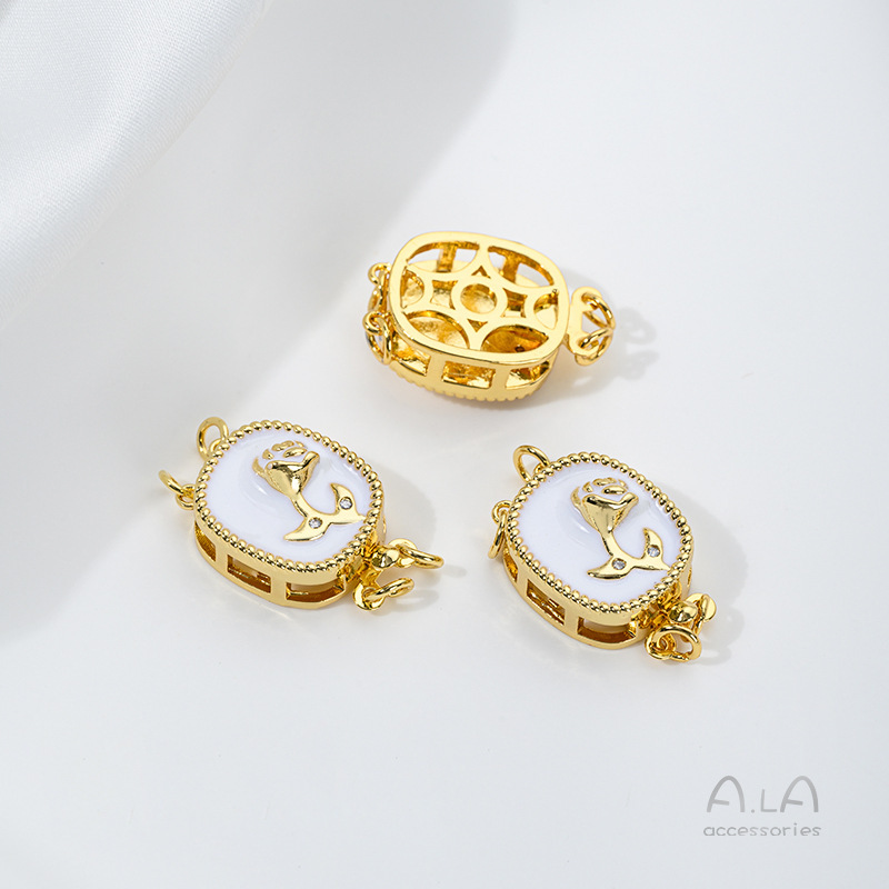 색상 보존 18K 구리 도금 진짜 금 상감 쉘 지르콘 오일 드롭 로즈 직사각형 더블 행 진주 버클 DIY 연결 버클