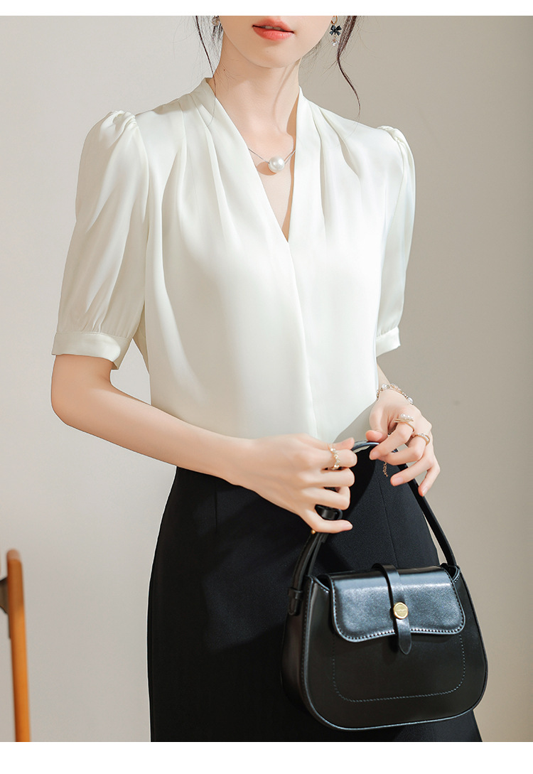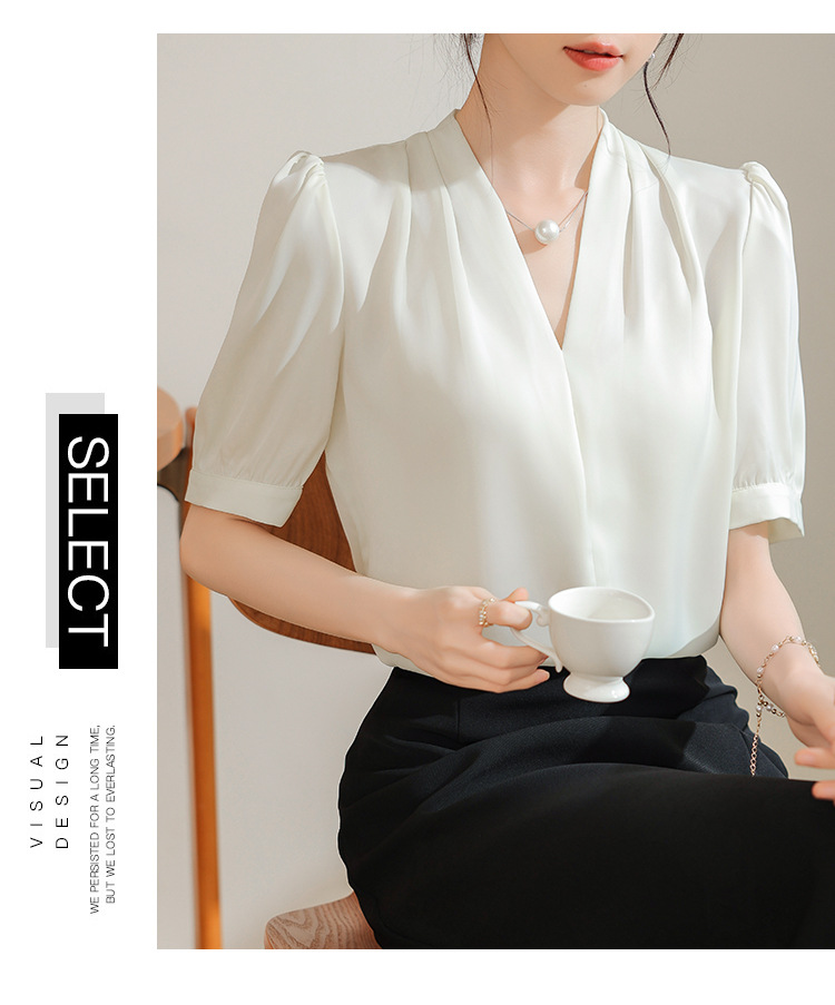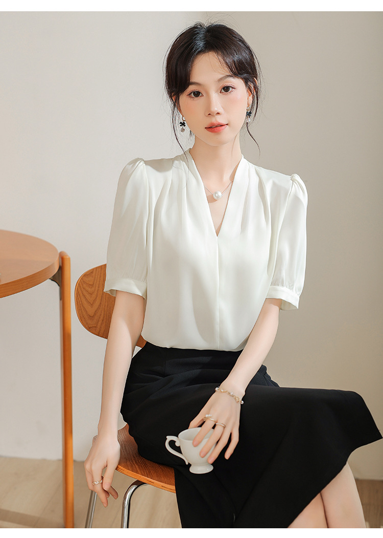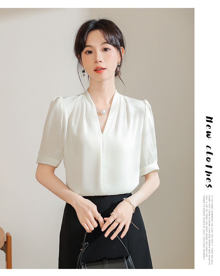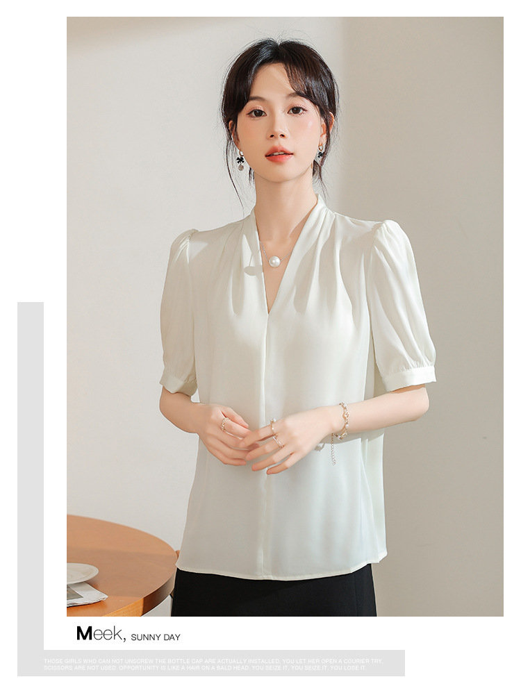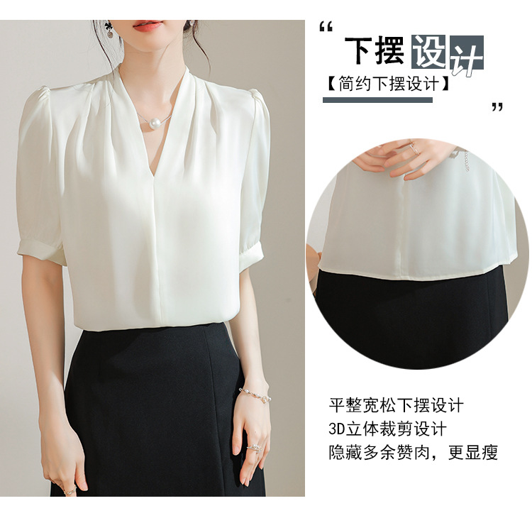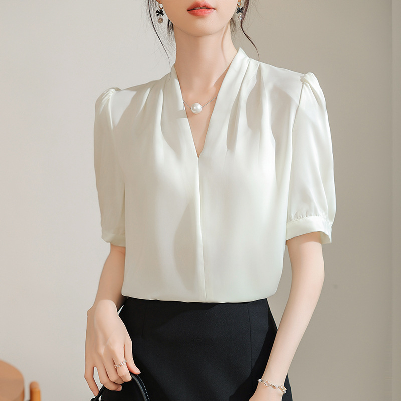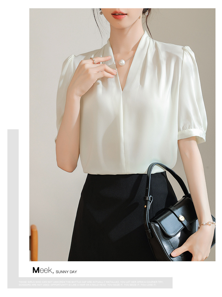 우아한 틈새 반팔 셔츠 여자 2025 년 여름 새로운 프랑스 사틴 통근 전문 탑