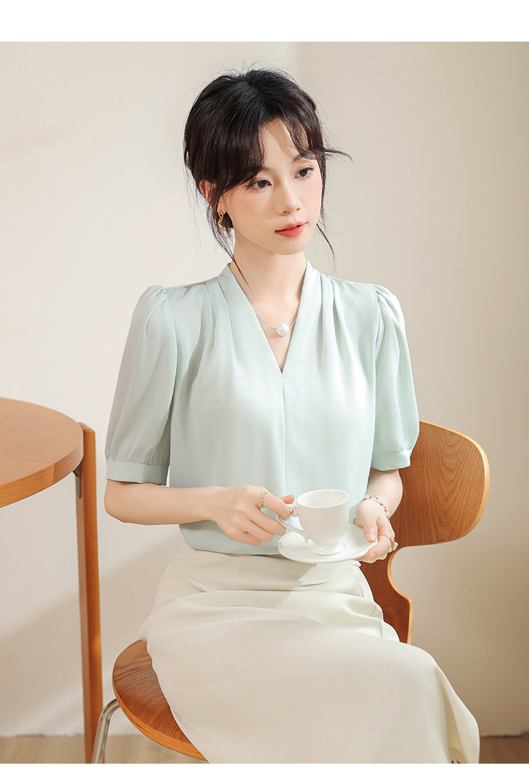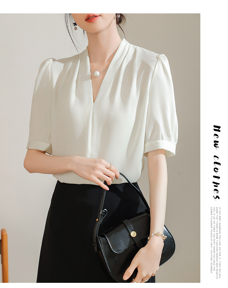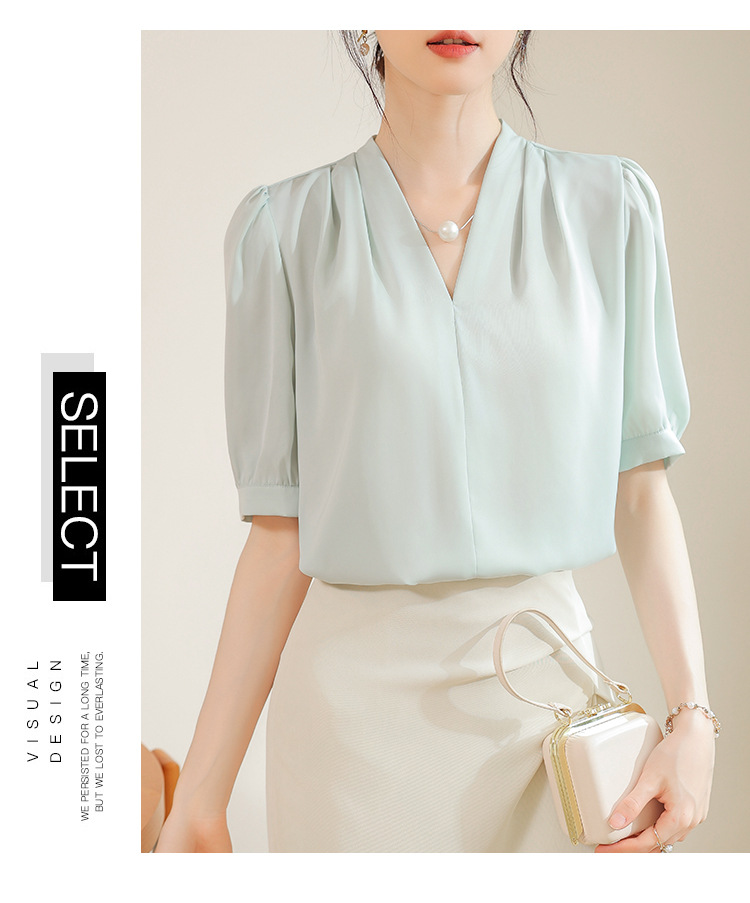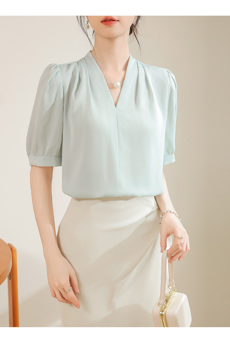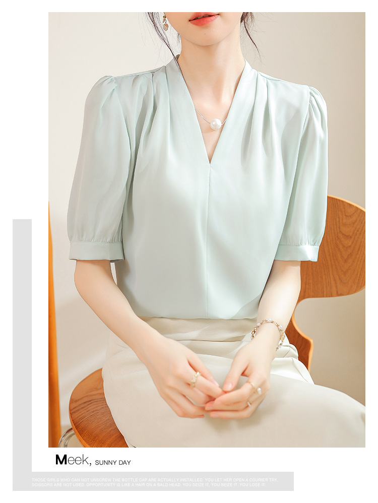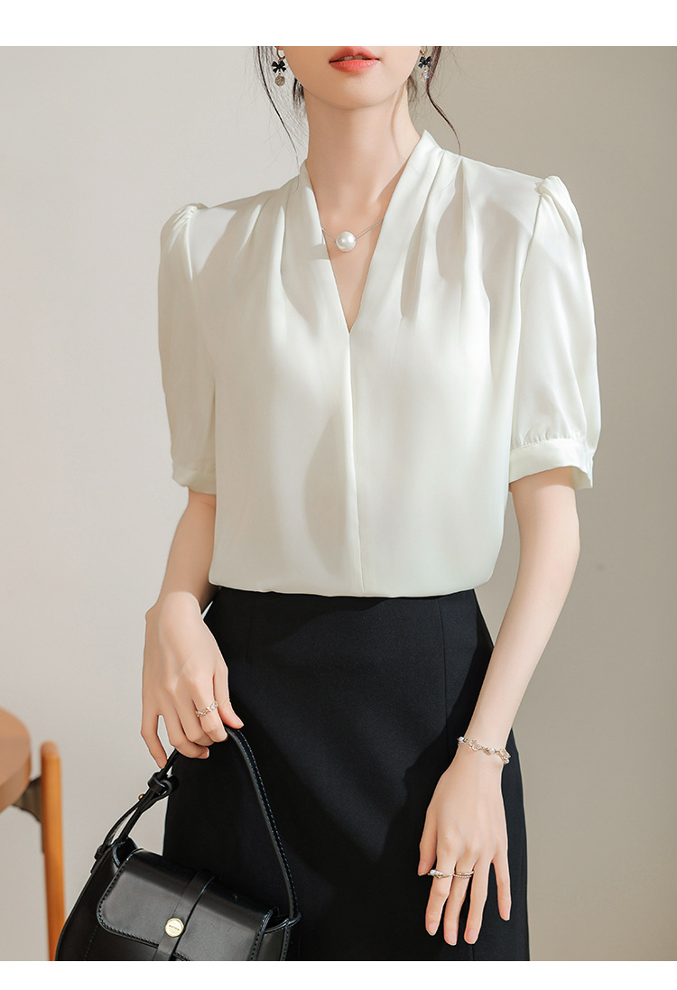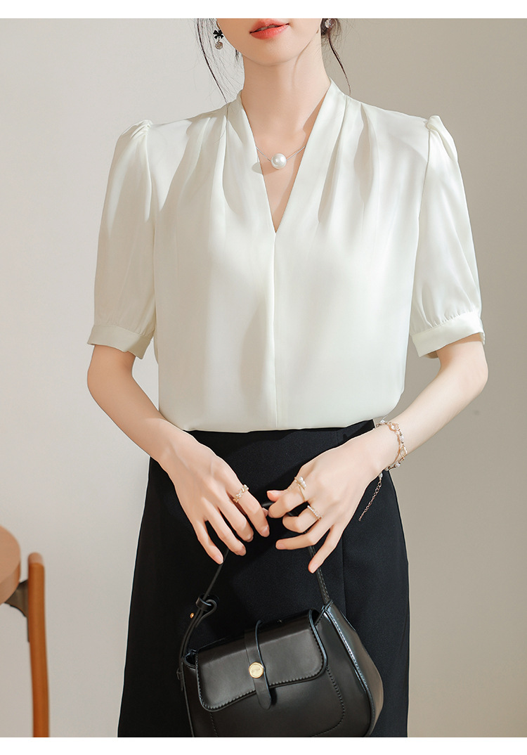 우아한 틈새 반팔 셔츠 여자 2025 년 여름 새로운 프랑스 사틴 통근 전문 탑
