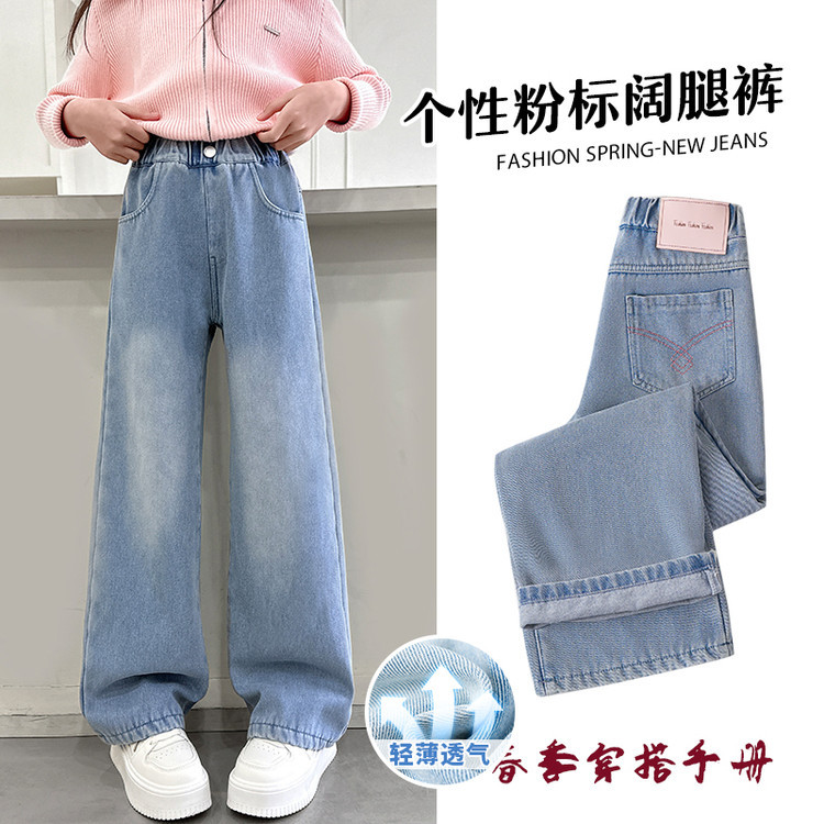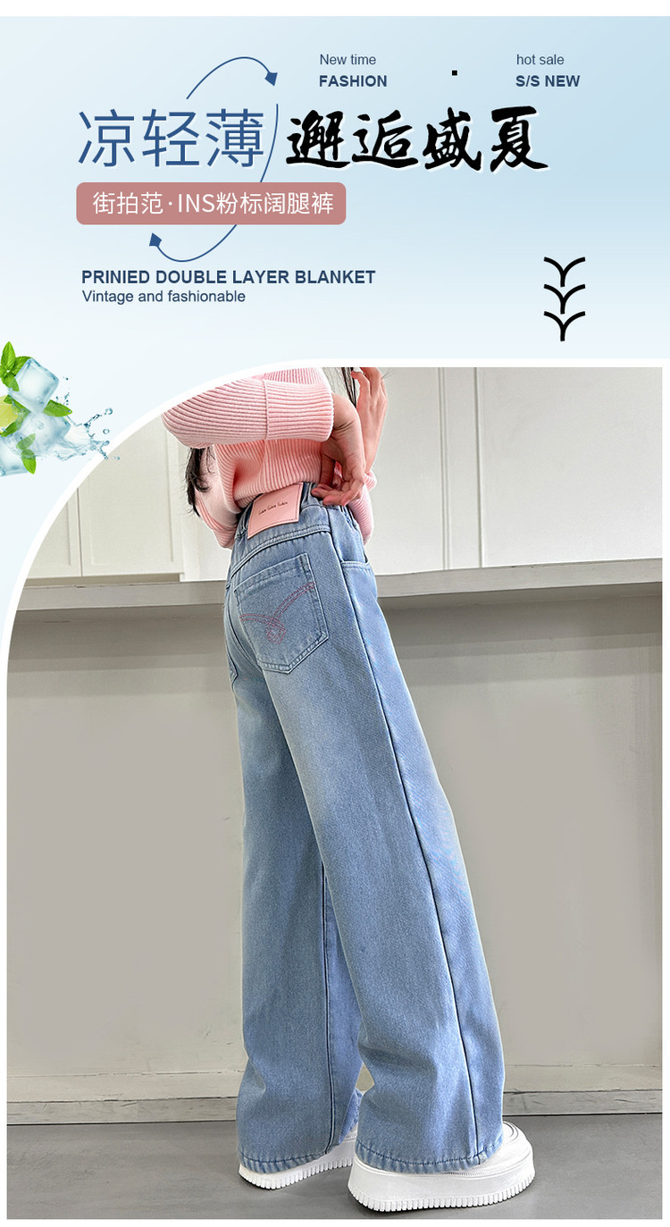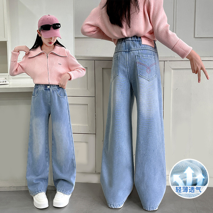 소녀 바지 봄과 여름 2025 새로운 서양식 어린이 좁은 직선 청바지 큰 어린이 얇은 넓은 다리 바지