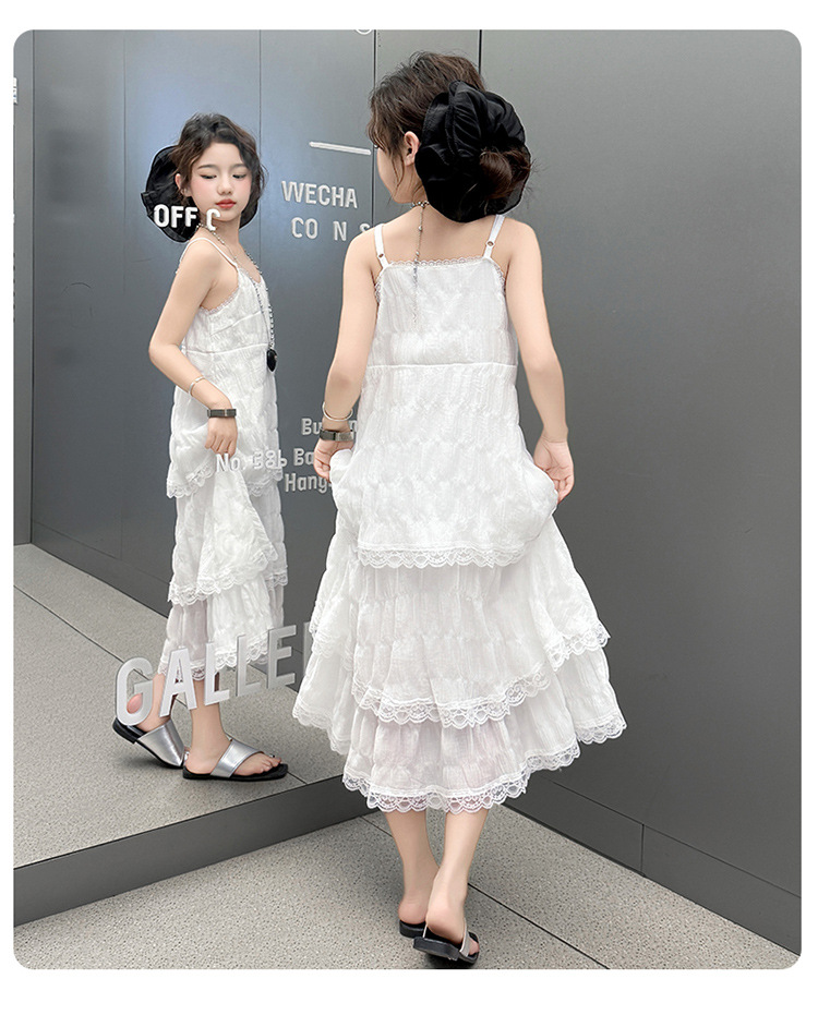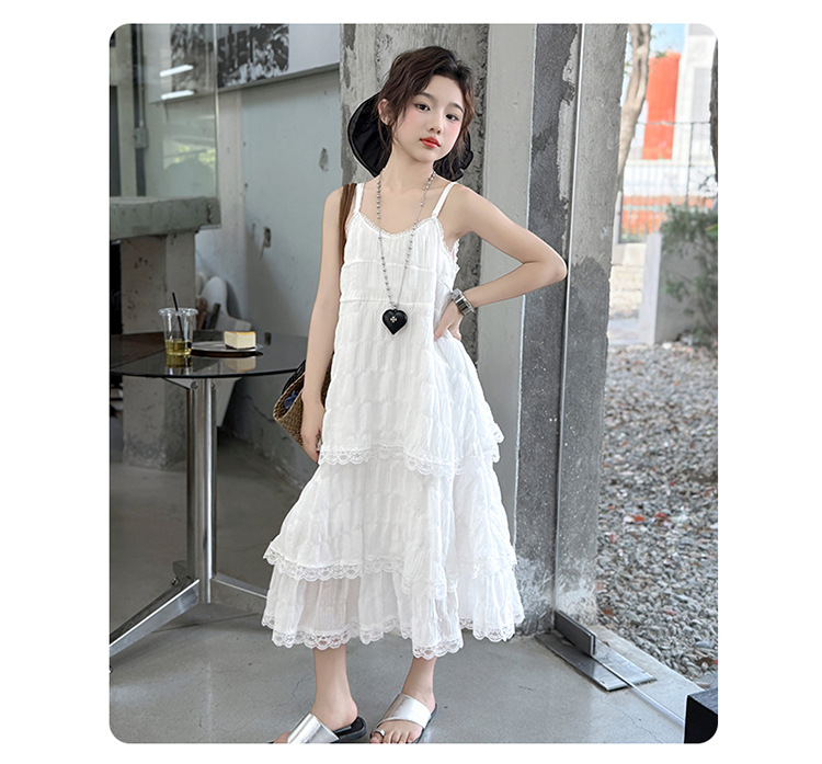 여자 흰색 서스펜더 스커트 레이스 드레스 2025 여름 새로운 스타일 중대형 어린이 유행 해변 스커트