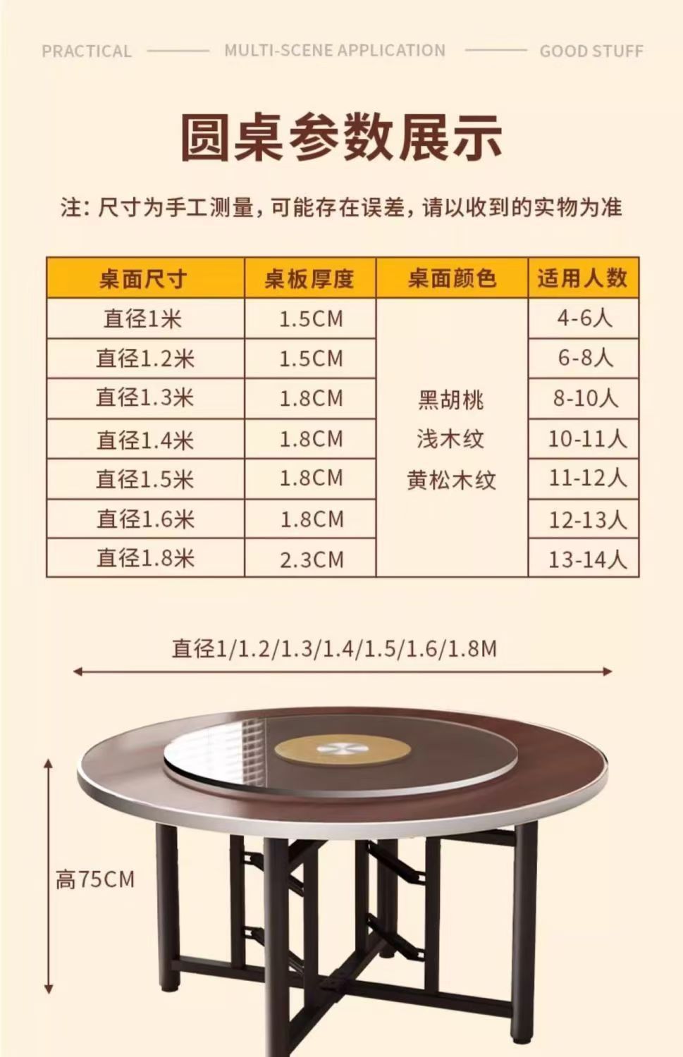 • 직경 1.8m 테이블 상판 + 1.2m 강화 턴테이블 + 접이식 테이블 다리