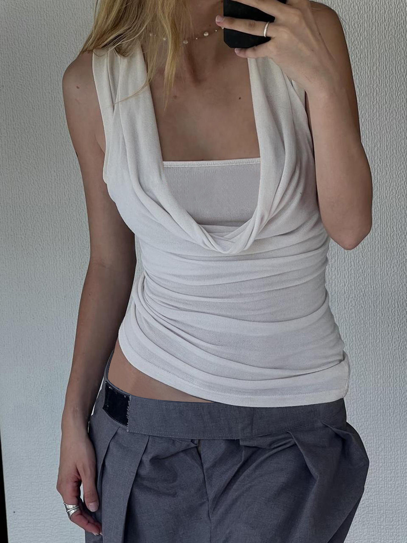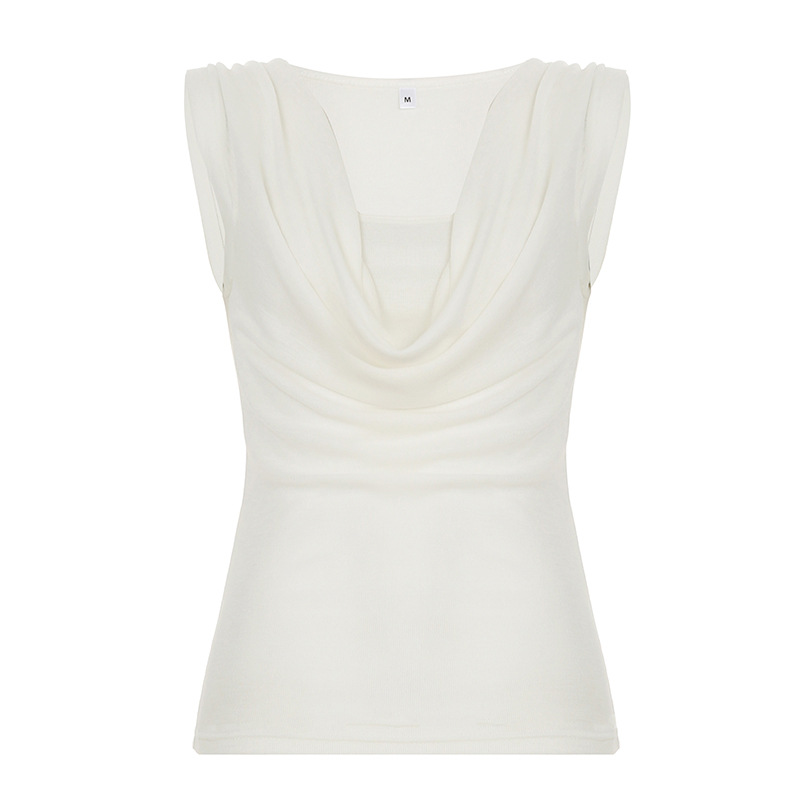 유럽과 미국의 거리 뜨거운 소녀 스타일 가짜 투피스 우아한 주름 허리 스윙 칼라 민소매 티셔츠 단색 간단한 슬림 탑