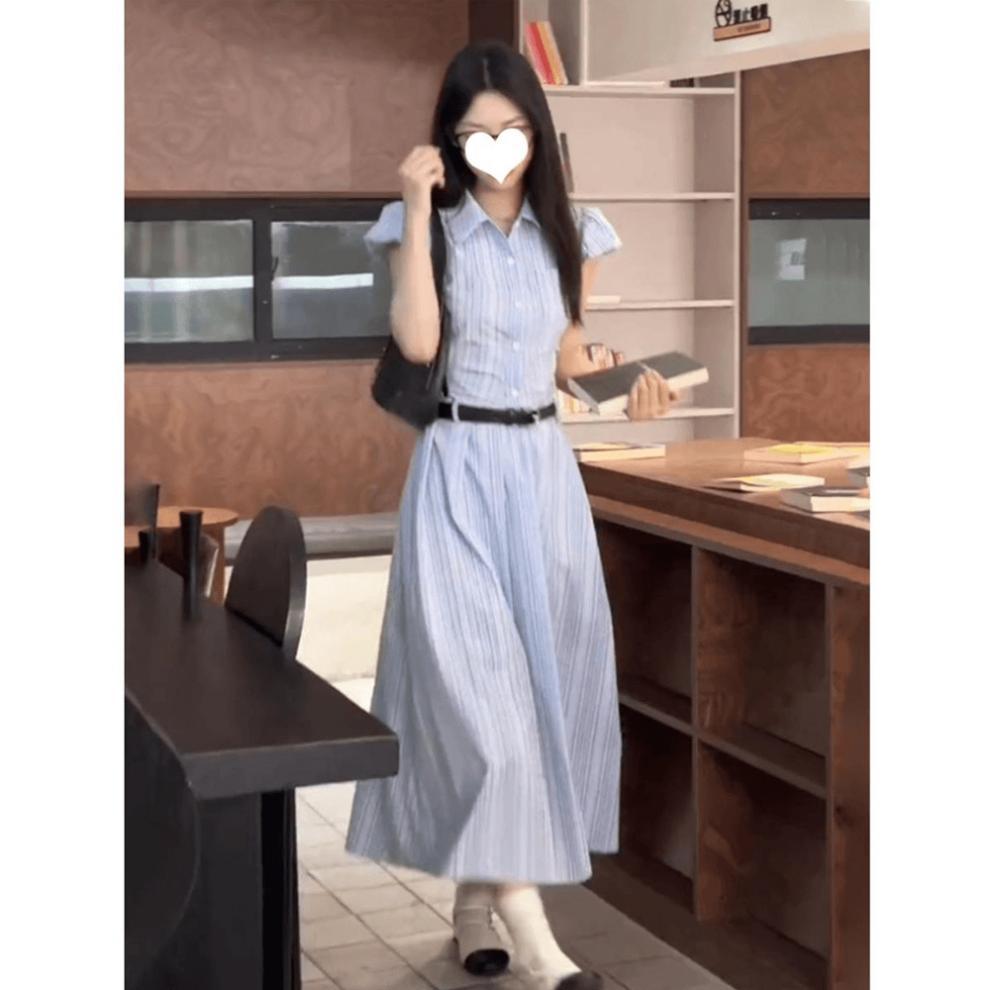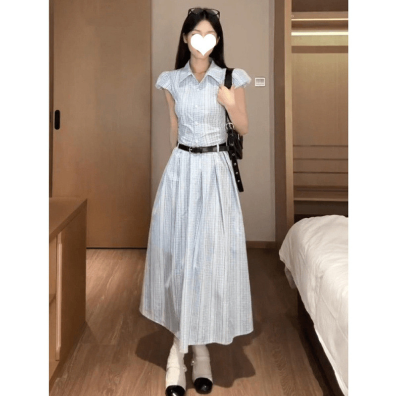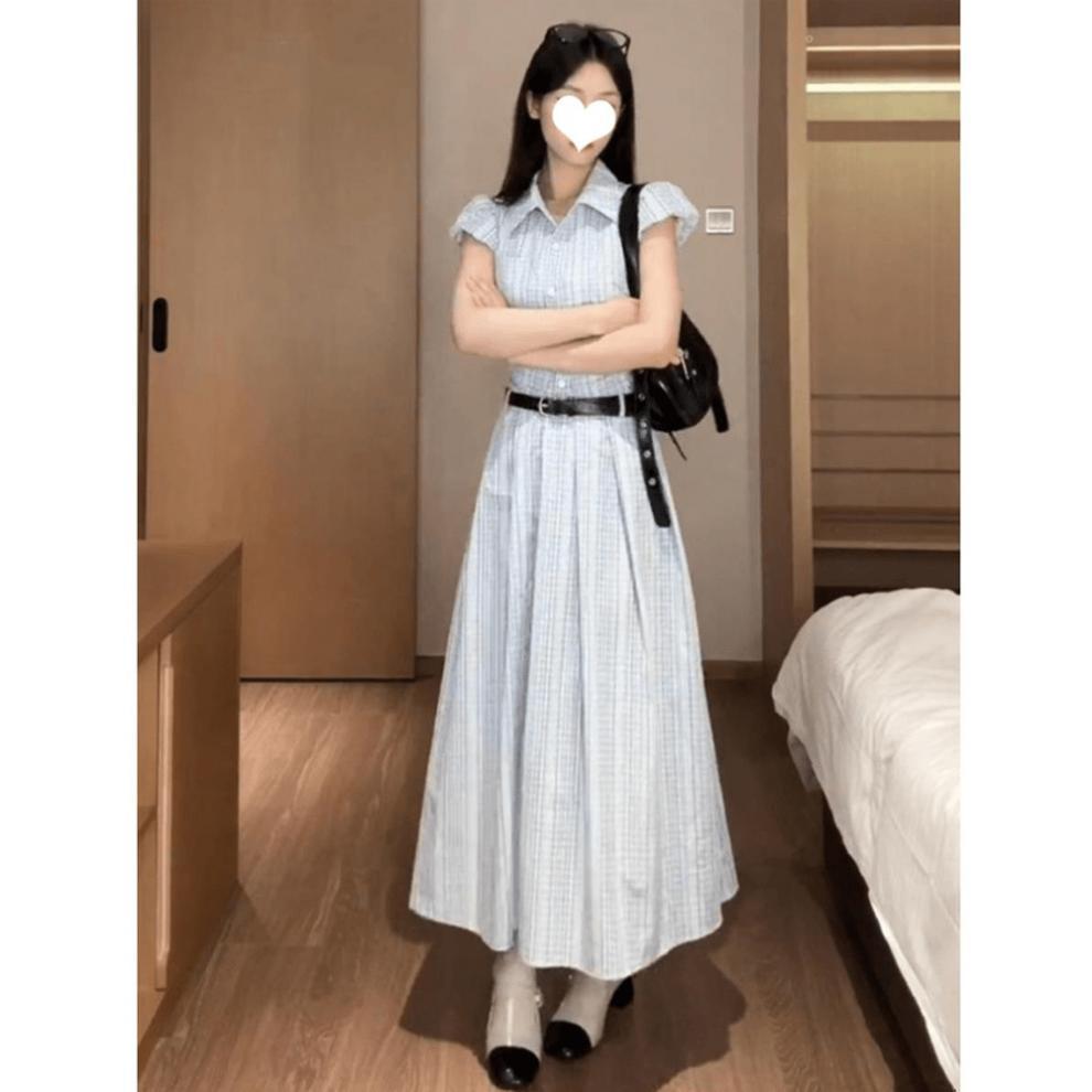 2025 여름 새로운 블루 체크 무늬 디자인 우아한 간단한 중간 길이 슬리밍 셔츠 원피스 여성을위한 단단한 허리