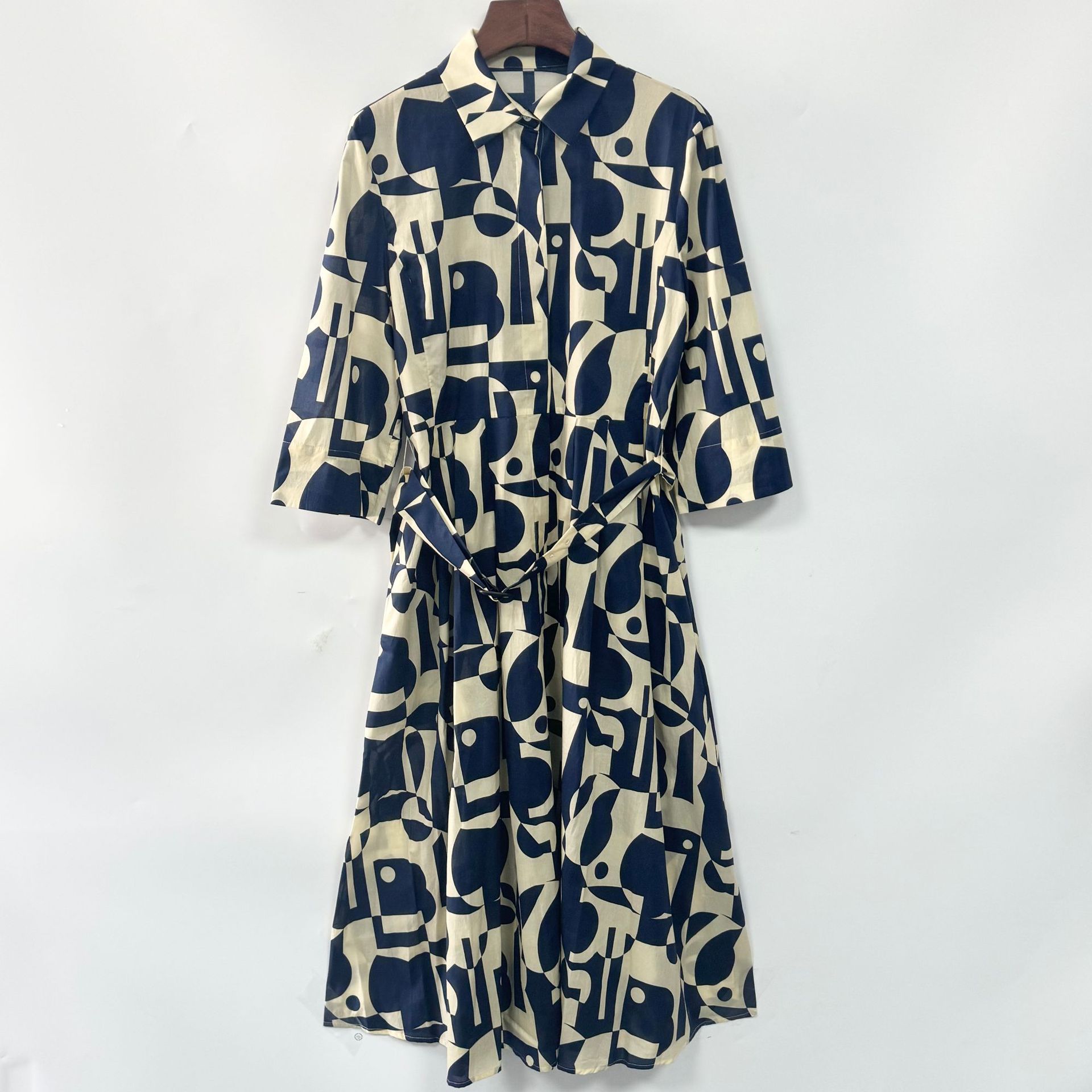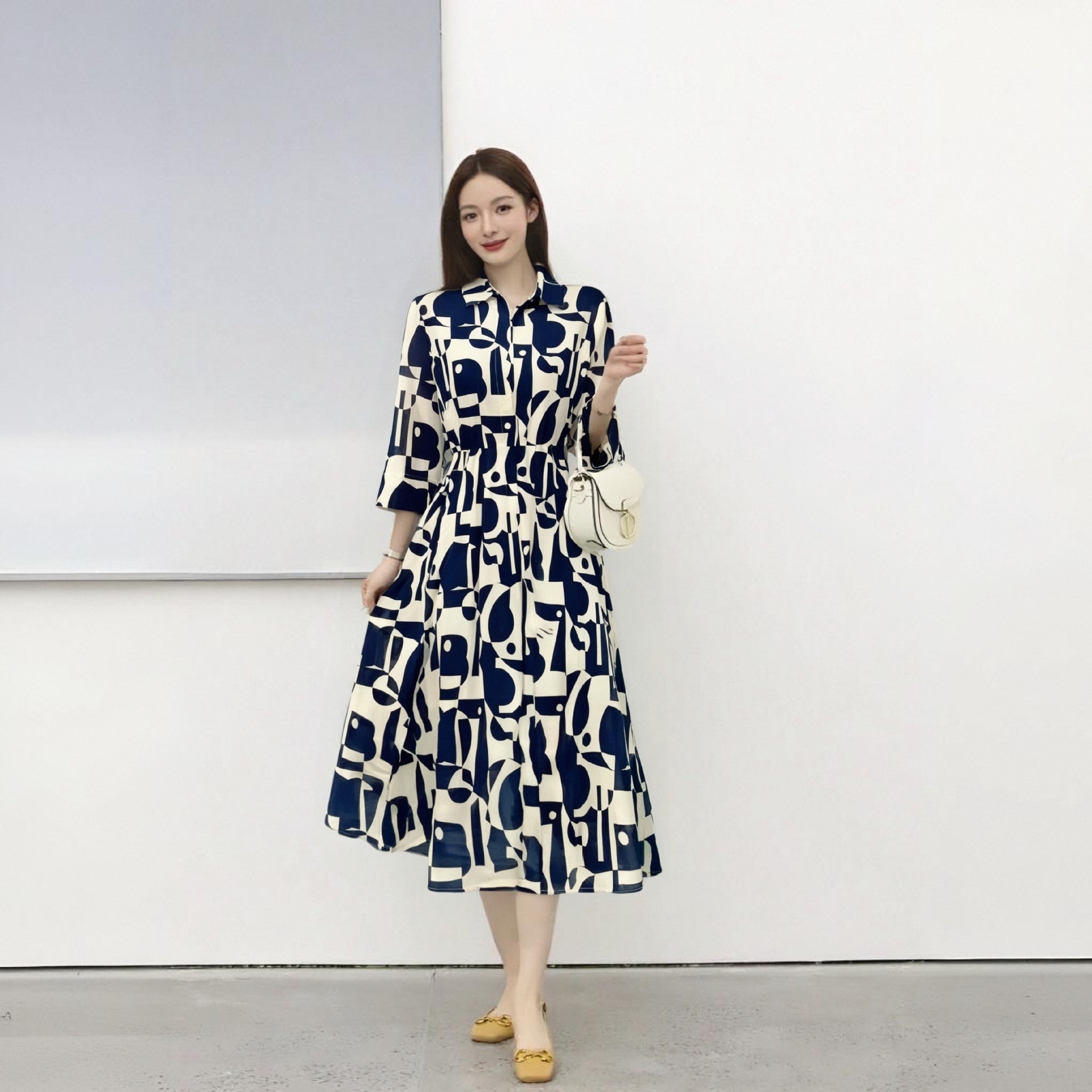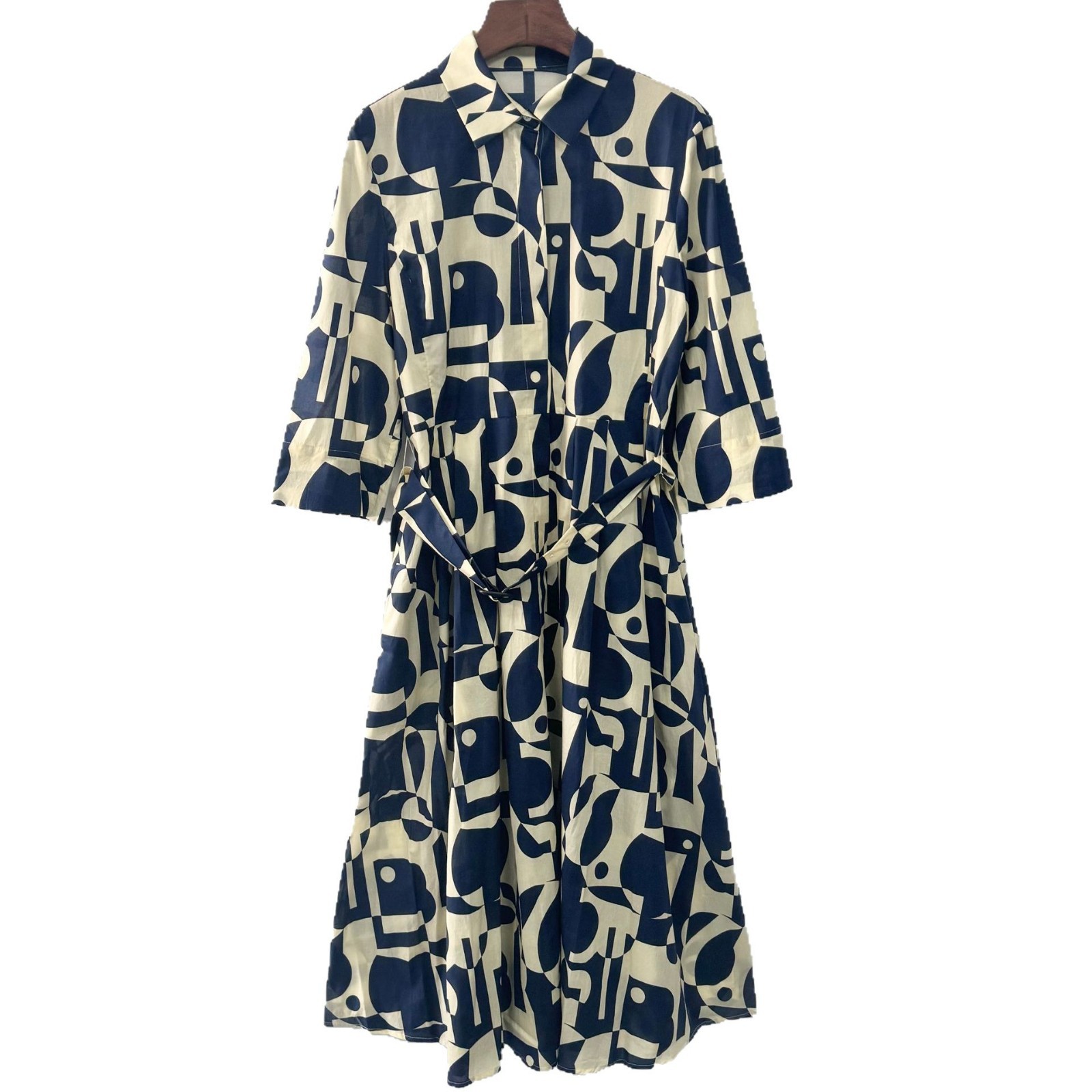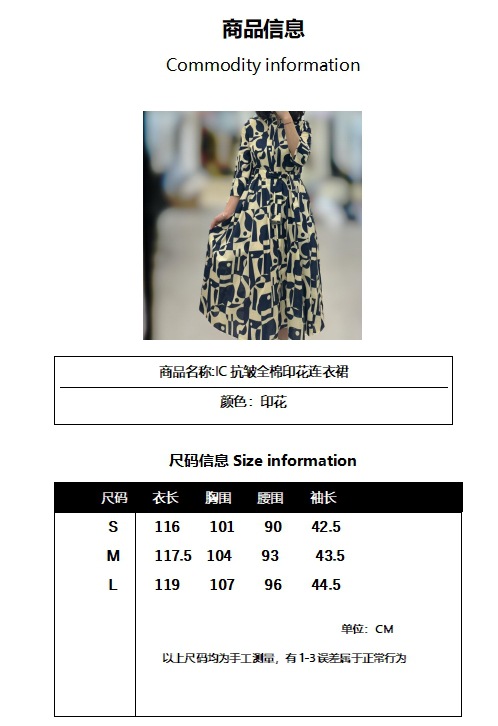 IC25 봄과 여름 새로운 간단한 캐주얼 주름 방지 면 인쇄 된 직물 중간 길이 원피스