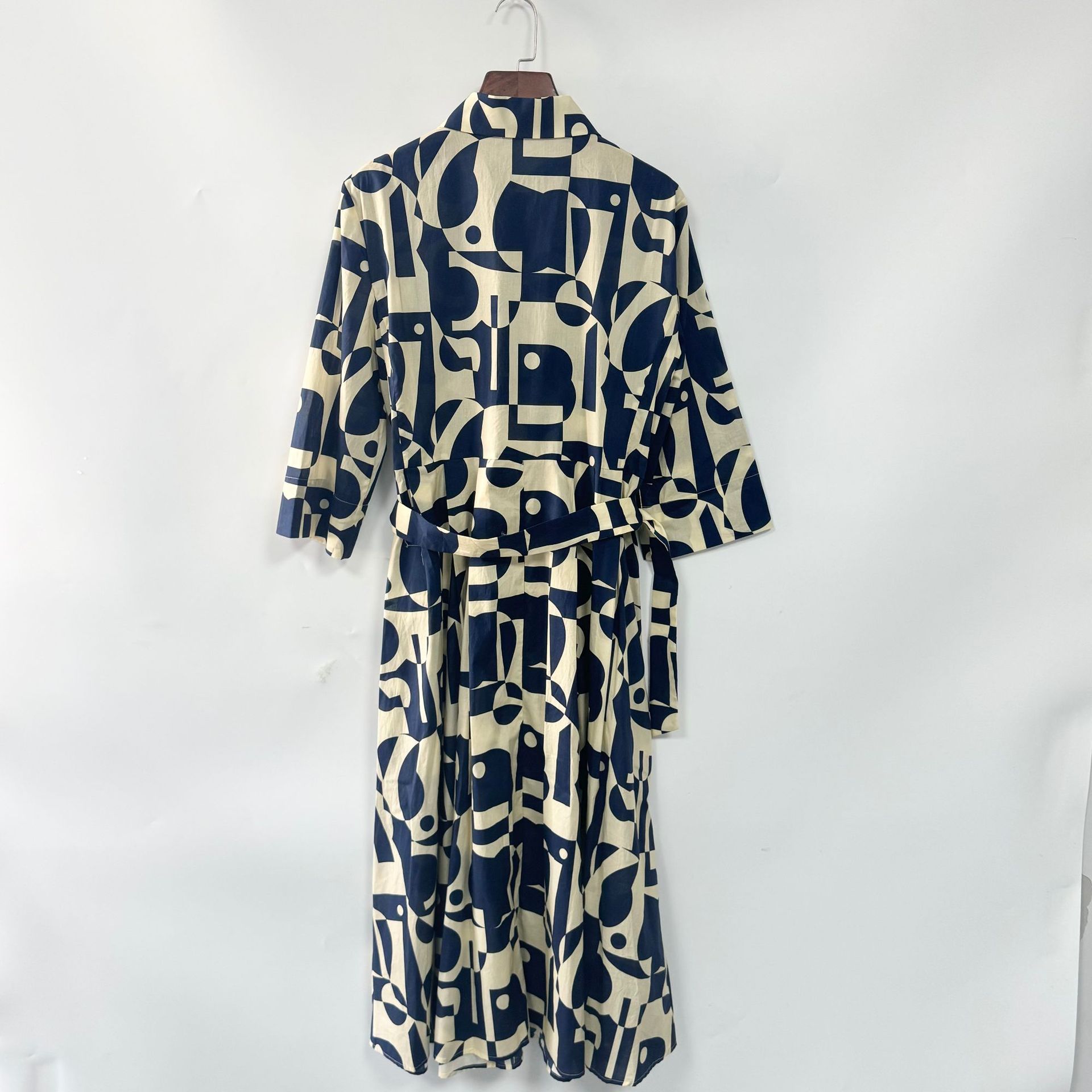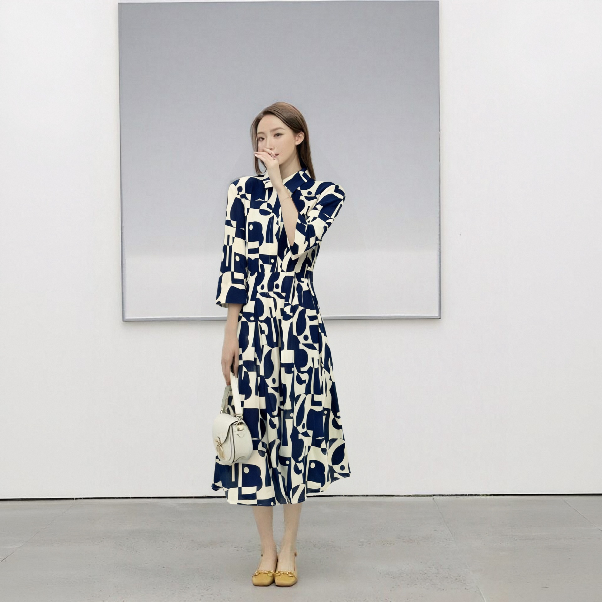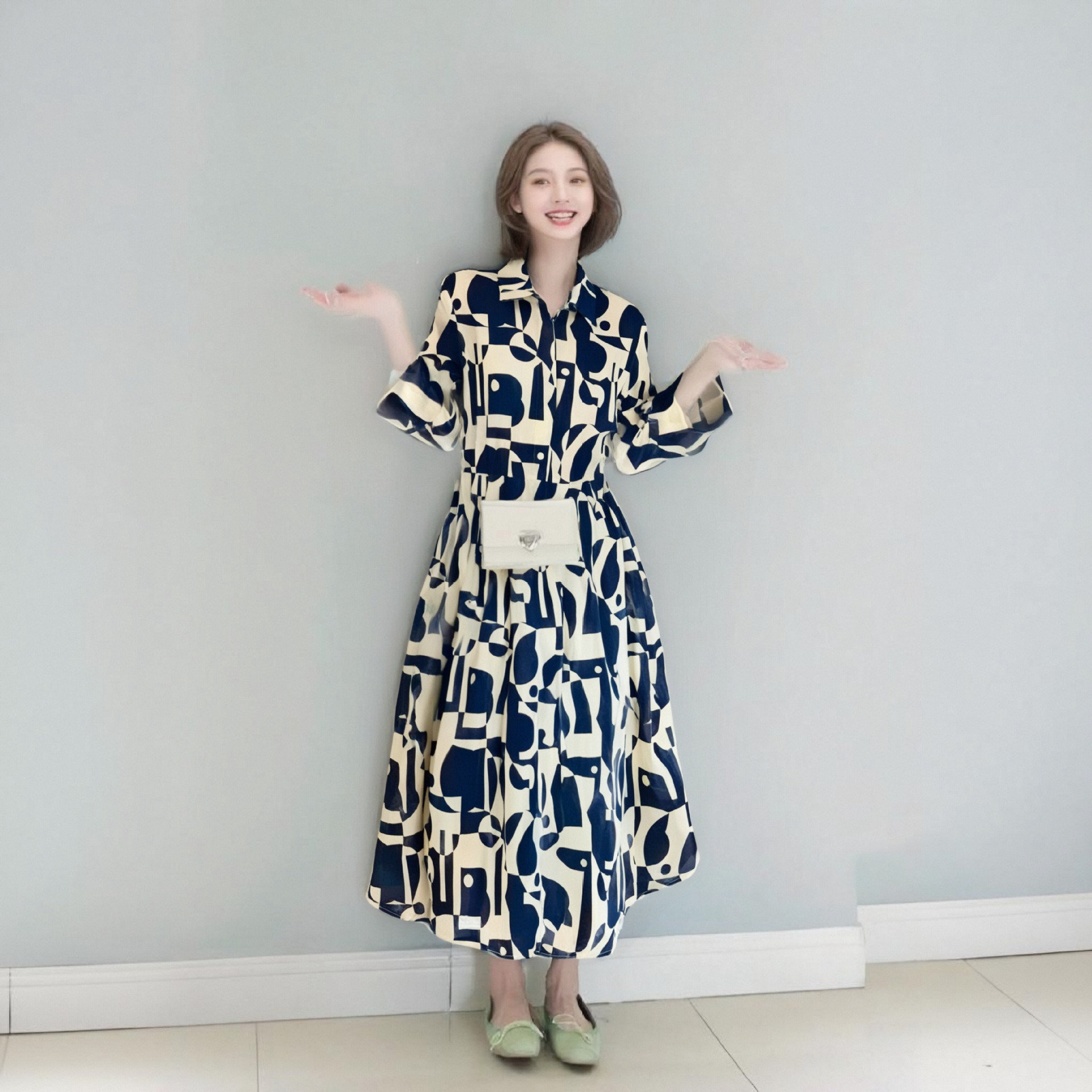 IC25 봄과 여름 새로운 간단한 캐주얼 주름 방지 면 인쇄 된 직물 중간 길이 원피스